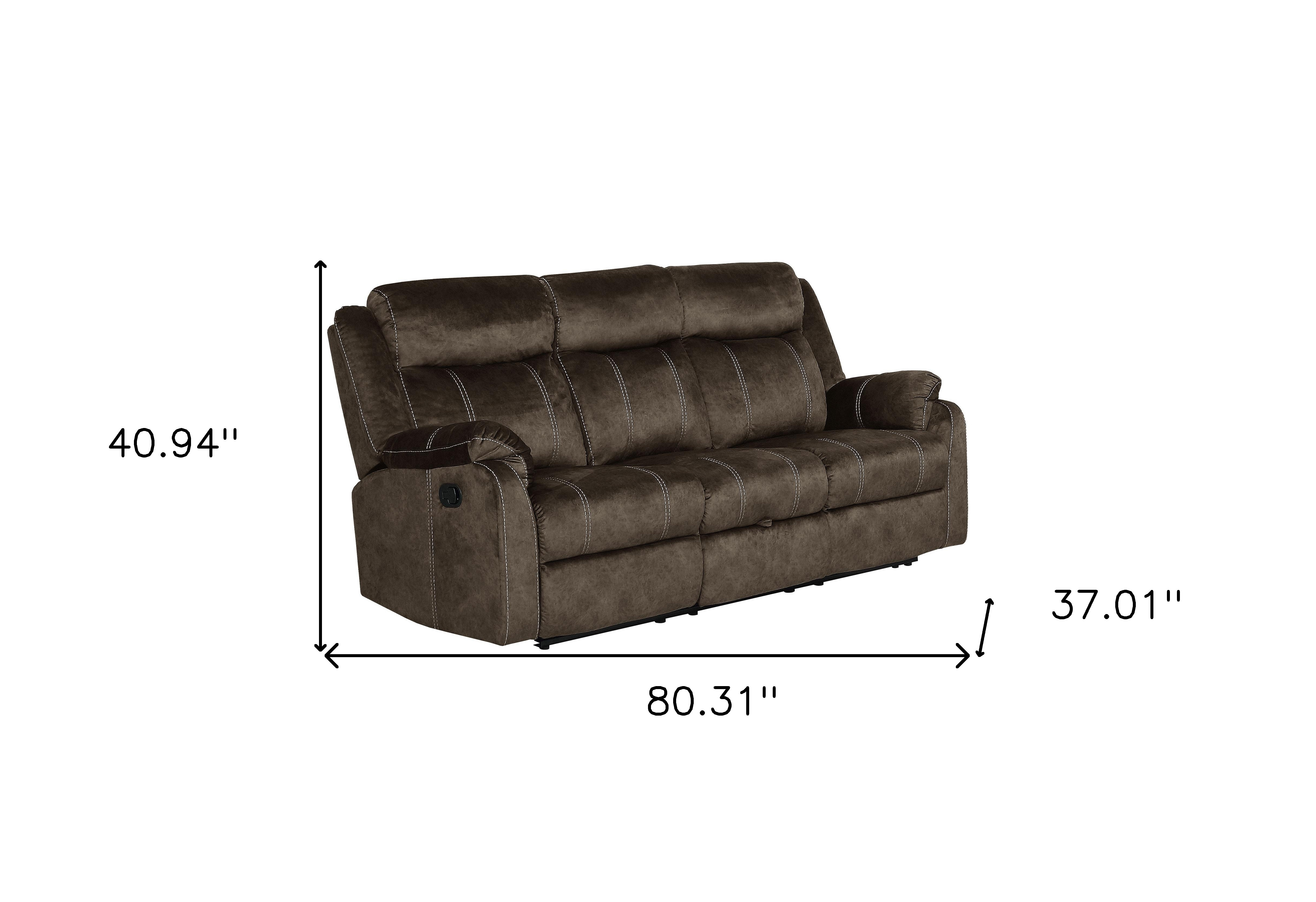 Designed for comfort and good looks, this 80-inch dark brown fabric reclining usb sofa with toss pillow is a great option to anchor your space. Solid colors give you lots of decorative options and are easy to work into your decor scheme. Sinuous springs construction gives this piece strong support and makes it comfortable to sit even for long periods of time. Pillow top arms offer a comfy place to rest. Black metal legs effortlessly elevate the room and add a touch of contemporary design. Built to last, this sofa will be a great centerpiece for your room. 40.94-inch h x 80.31-inch w x 37.01-inch d.