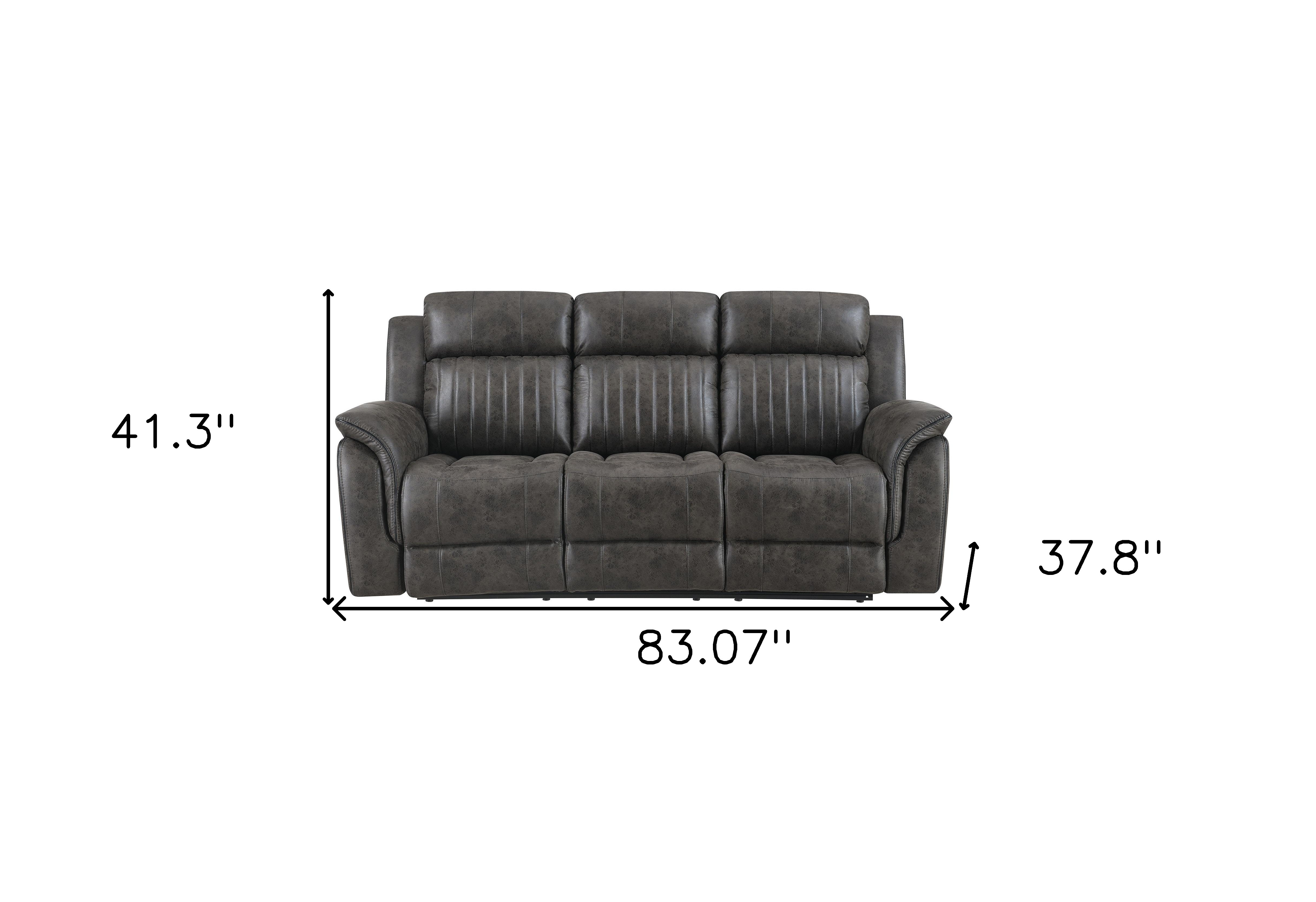 Transform your home's interior with this luxurious 83-inch charcoal fabric reclining usb sofa with toss pillow. Solid colors give you lots of decorative options and are easy to work into your decor scheme. Sinuous springs construction gives this piece strong support and makes it comfortable to sit even for long periods of time. Pillow top arms offer a comfy place to rest. Silver metal legs effortlessly elevate the room and add a touch of contemporary design. Built to last, this sofa will be a great centerpiece for your room. 41.30-inch h x 83.07-inch w x 37.80-inch d.