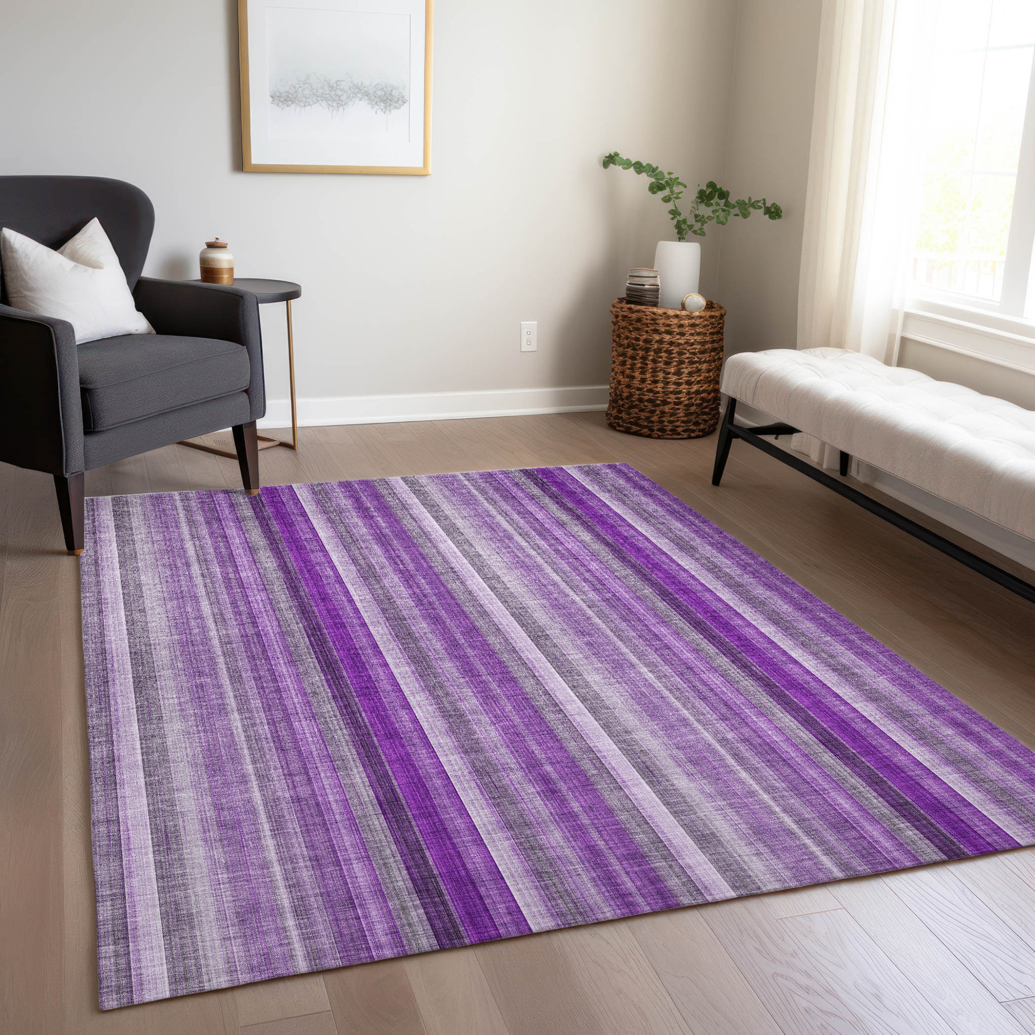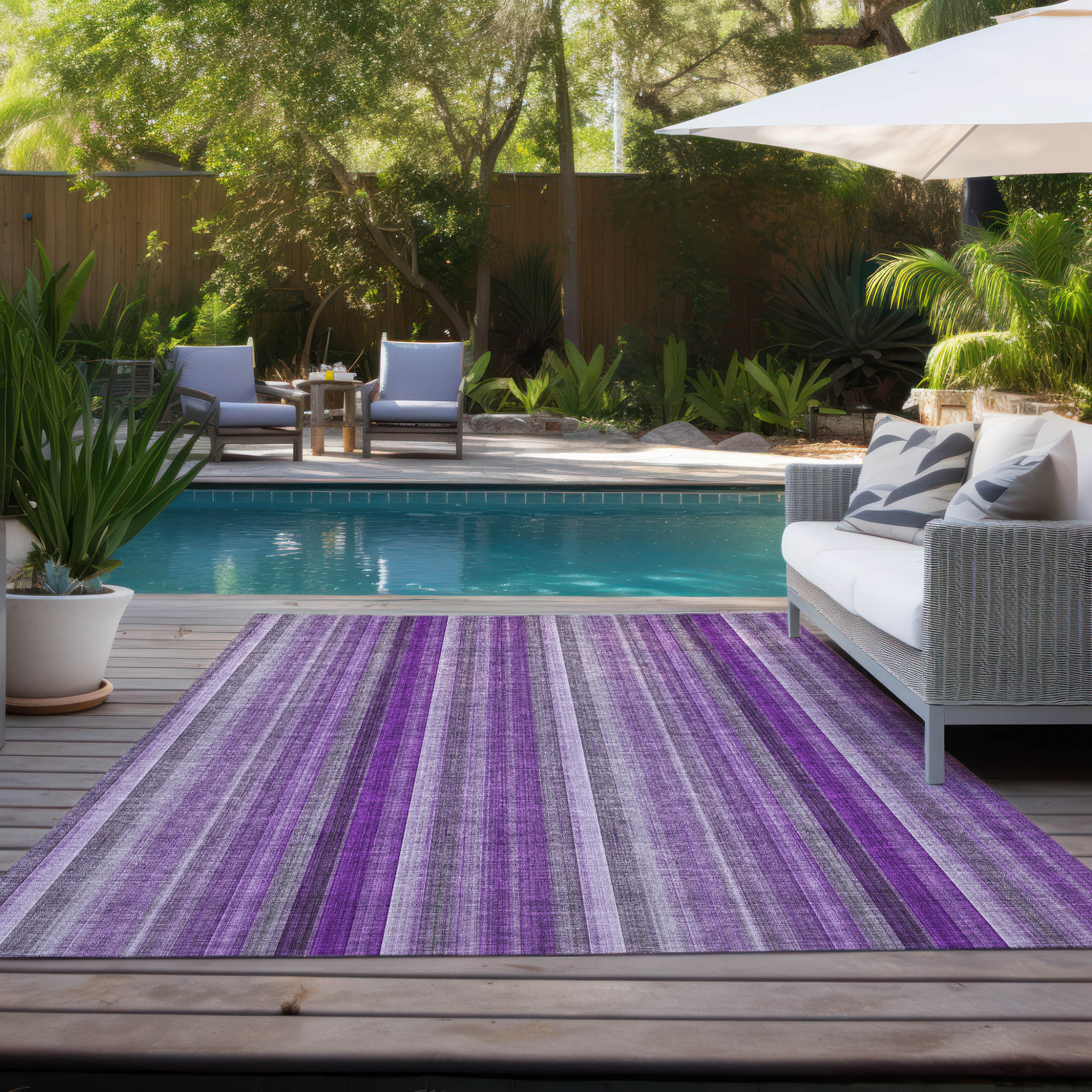 Add great coloration and comfortable texture to your space with this 9-foot x 12-foot purple striped washable stain resistant non skid indoor outdoor area rug. This rectangle shaped rug features a striped design in purple to give it visual interest. A classic shape marries with good looking design for your space ideal for spaces with kids and pets, this rug is stain resistant to help repel stains and spilled liquids. Area rugs help to give warmth and sense of home to your space. 108-inch H x 144-inch W x 0.19-inch D