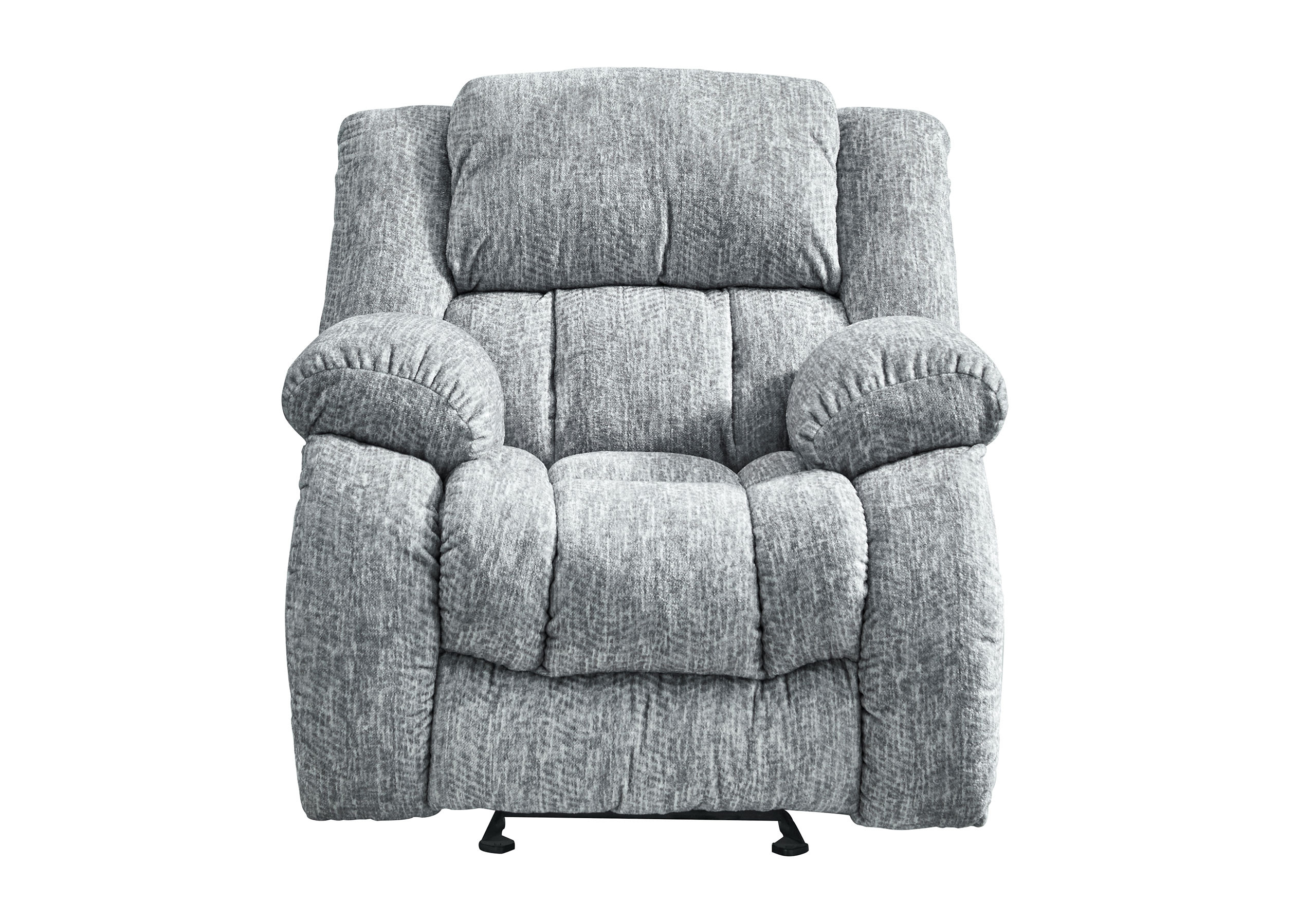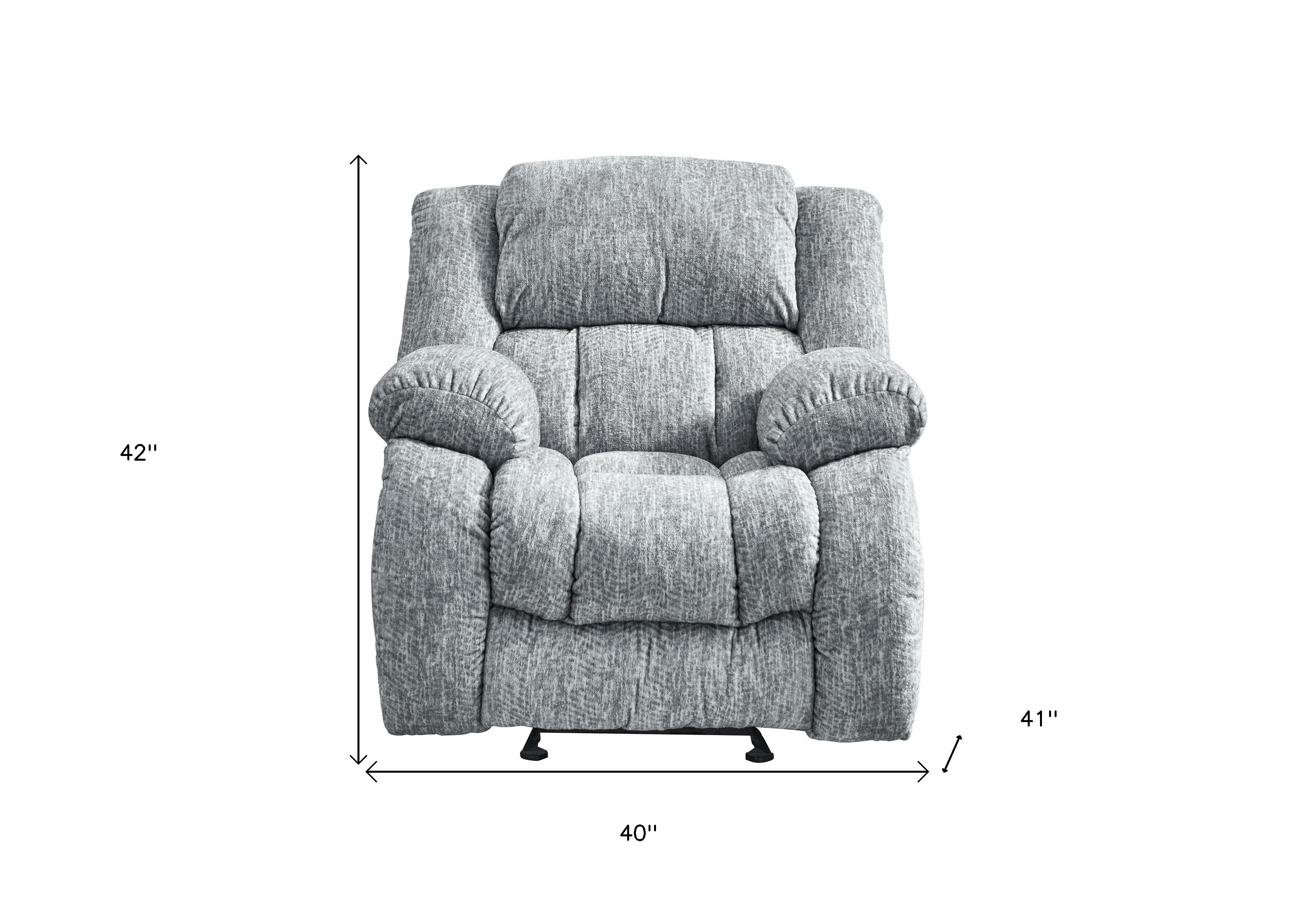 Just what you need, the 40-inch gray fabric gliding recliner is supremely comfortable and great looking. Designed to be hardy and long lasting, this chair is upholstered in durable 100% polyester. Modify your position from upright to full recline with an easy-to-use recline mechanism. Simply use the manual push button to set your desired position. An update to the traditional rocker, this glider chair rocks back and forth in addition to reclining. Whether you are starting your day, ending your day, or sneaking in a cat nap in between, this chair is a welcome addition to your space and self-care routine. Take relaxation to the next level with this comfy reclining chair. 42-inch h x 40-inch w x 41-inch d.