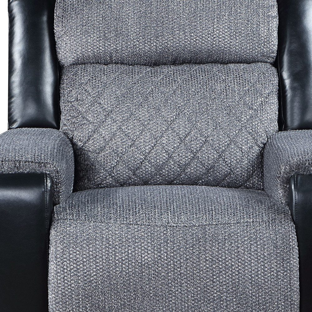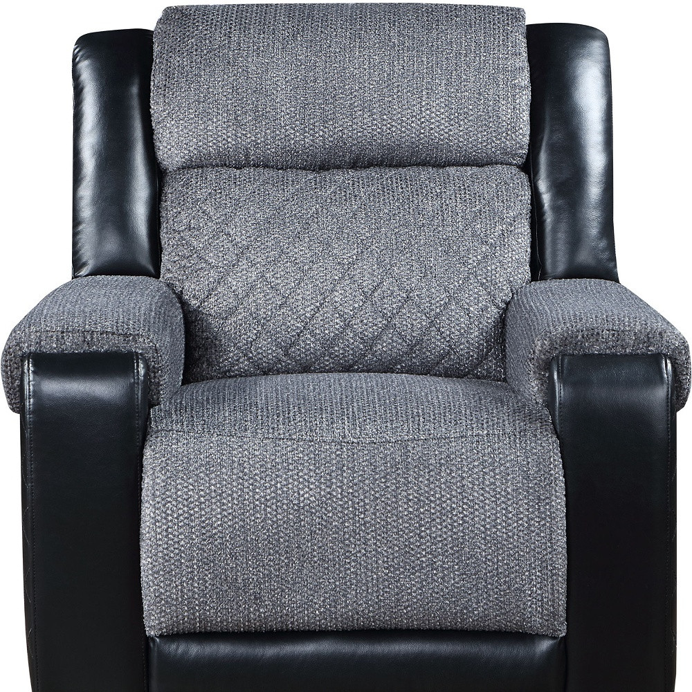 Comfortable and designed with convenience in mind, this 39-inch black and gray faux leather and fabric manual recliner has everything you are looking for. The two-tone coloration gives this chair a modern chic look and feel. Modify your position from upright to full recline with an easy-to-use manual recline mechanism. An update to the traditional rocker, this glider chair rocks back and forth in addition to reclining. From morning coffee to evening tv/movie nights and everything in between, this cozy chair will be a welcome addition to your rest and relaxation routine. 39.7-inch h x 38.5-inch w x 39.3-inch d.