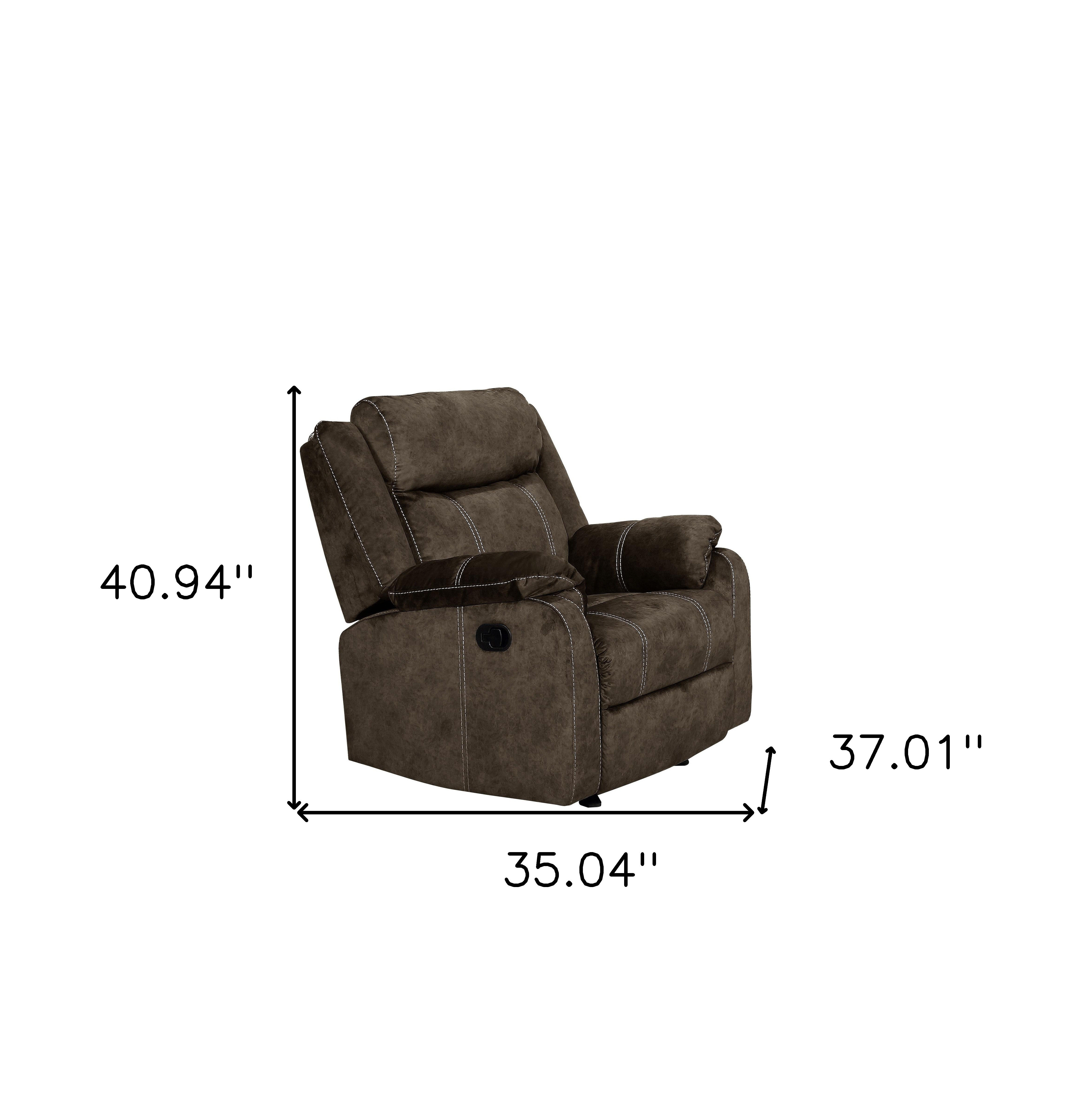 Comfortable and designed with convenience in mind, this 35-inch brown fabric gliding recliner has everything you are looking for. Durable 100% polyester upholstery is soft to the touch, easy to maintain, and simple to clean with only a damp cloth. Features a warm brown coloration that will easily blend with the colors of your room. This manual recliner makes it easy for you to shift positions with a manual push button. An update to the traditional rocker, this glider chair rocks back and forth in addition to reclining. From morning coffee to evening tv/movie nights and everything in between, this cozy chair will be a welcome addition to your rest and relaxation routine. Recliners are a comfortable and practical option for living room, family room, den, bedroom, or nursery. 40.94-inch h x 35.04-inch w x 37.01-inch d.