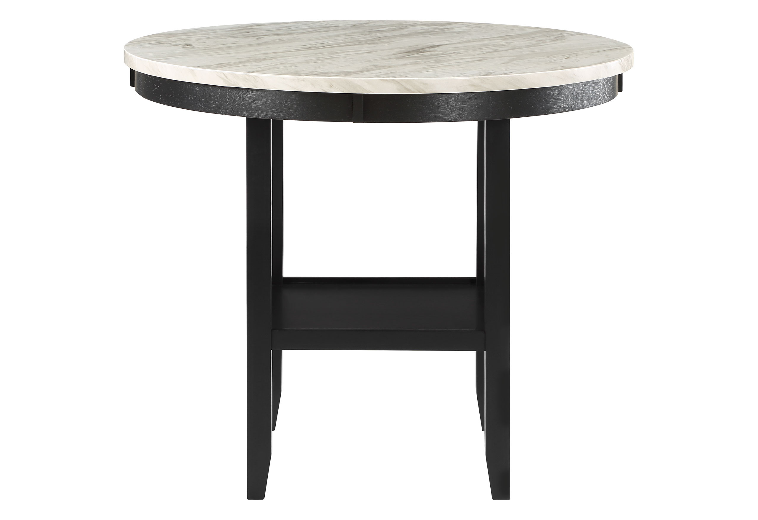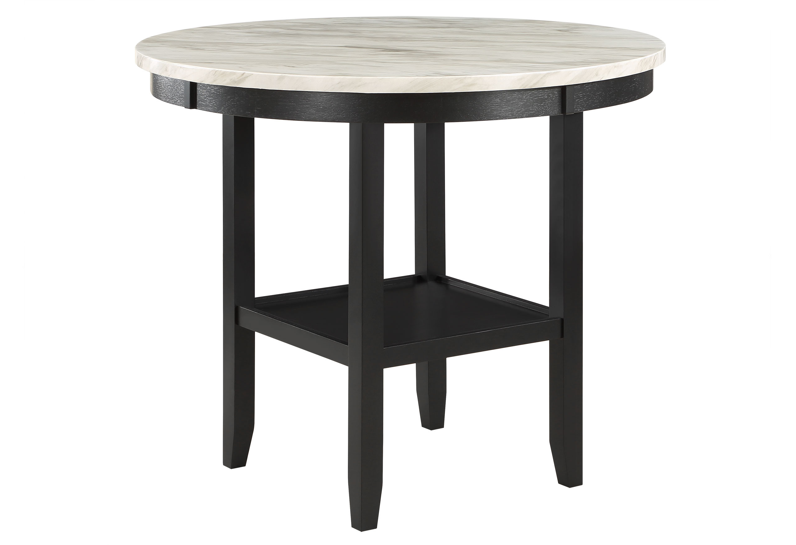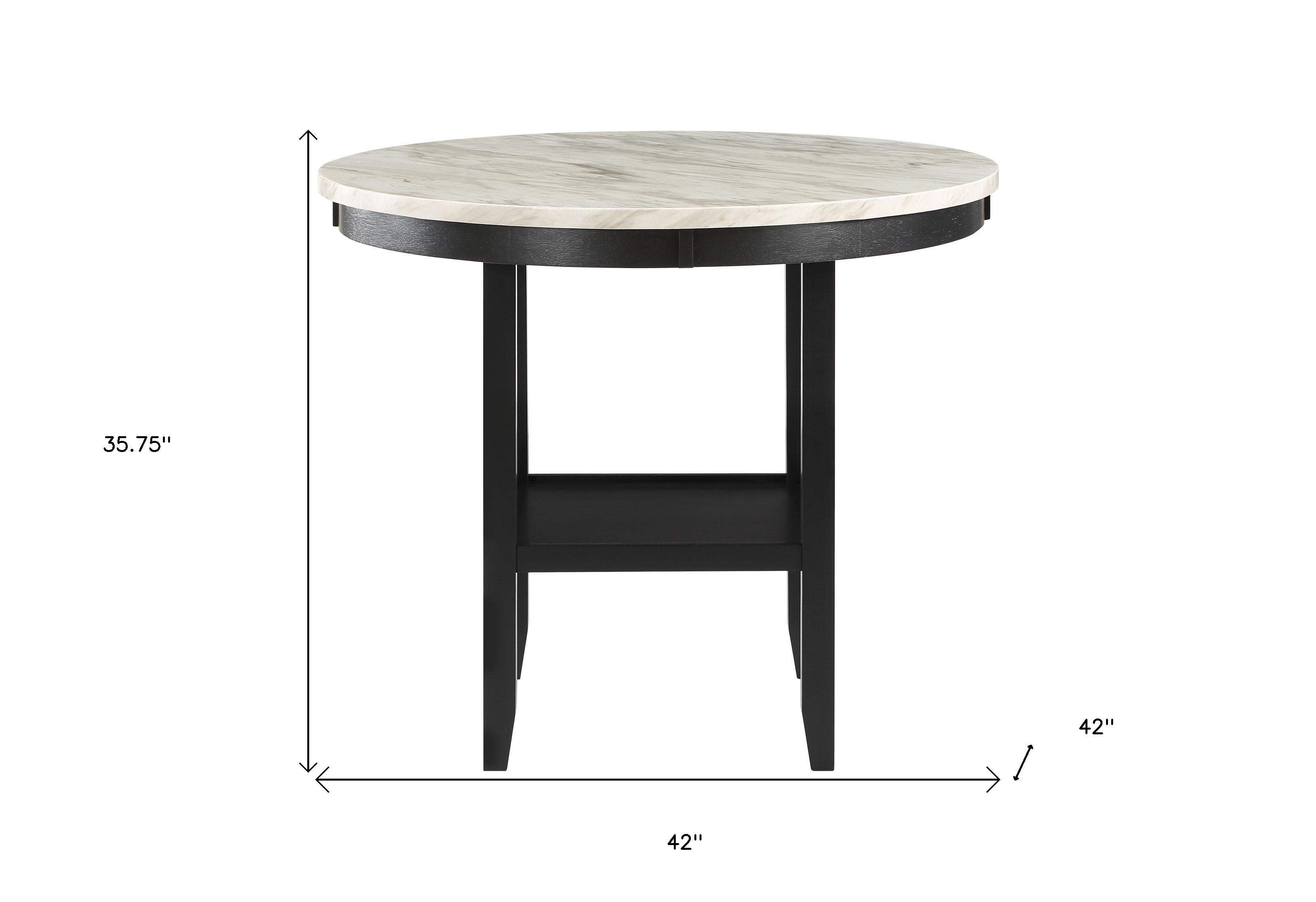 The 42-inch white and black wood and faux marble round counter height bar table is a stunning addition to any dining space. This transitional style table features a round shape top with a square bottom shelf that invites conversation and social interaction, and gives you a layer of storage as well. The top features an elegant faux marble finish, while the sturdy black base complements beautifully, creating a chic yet functional piece. 35.75-inch h x 42.00-inch w x 42.00-inch d.