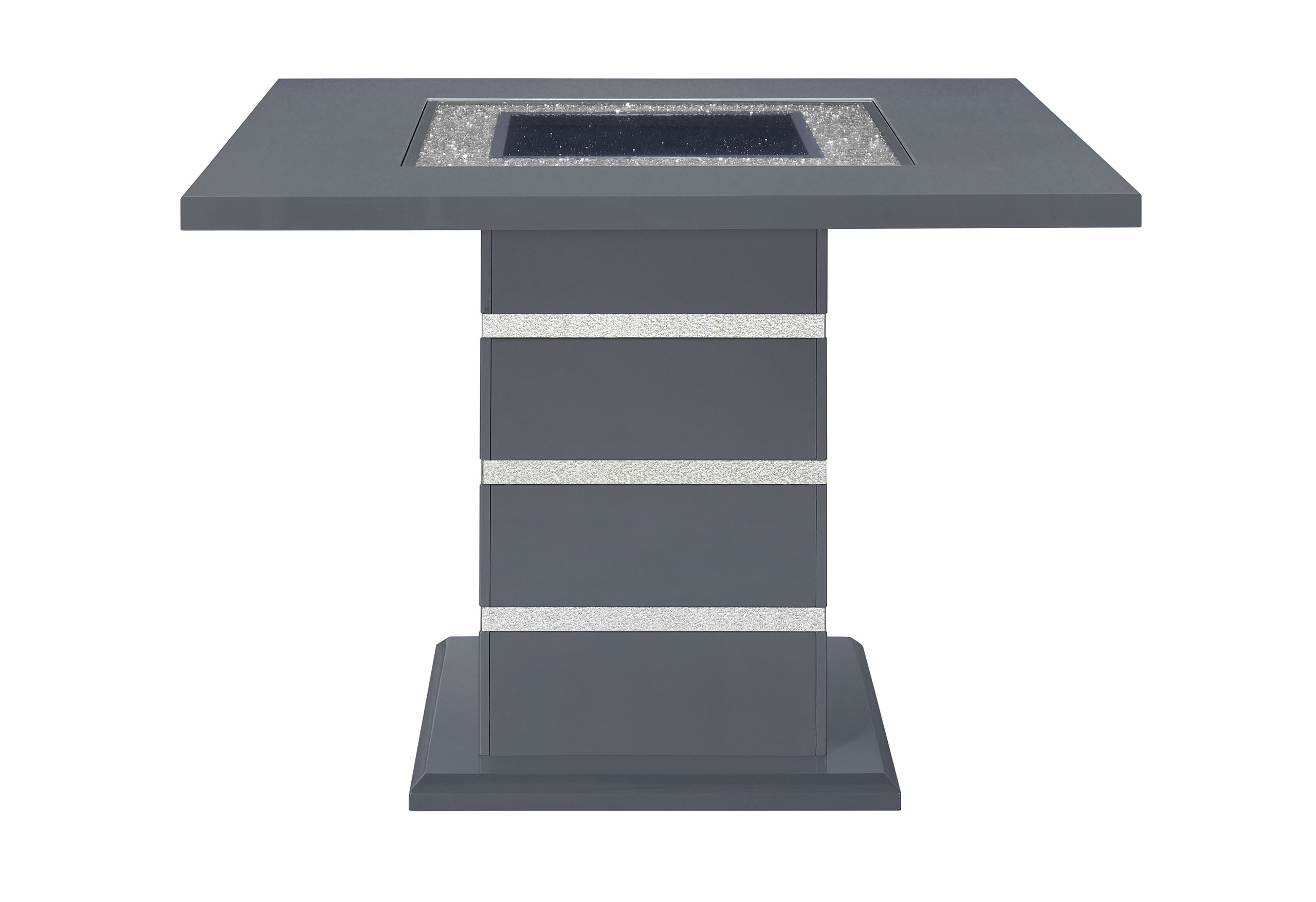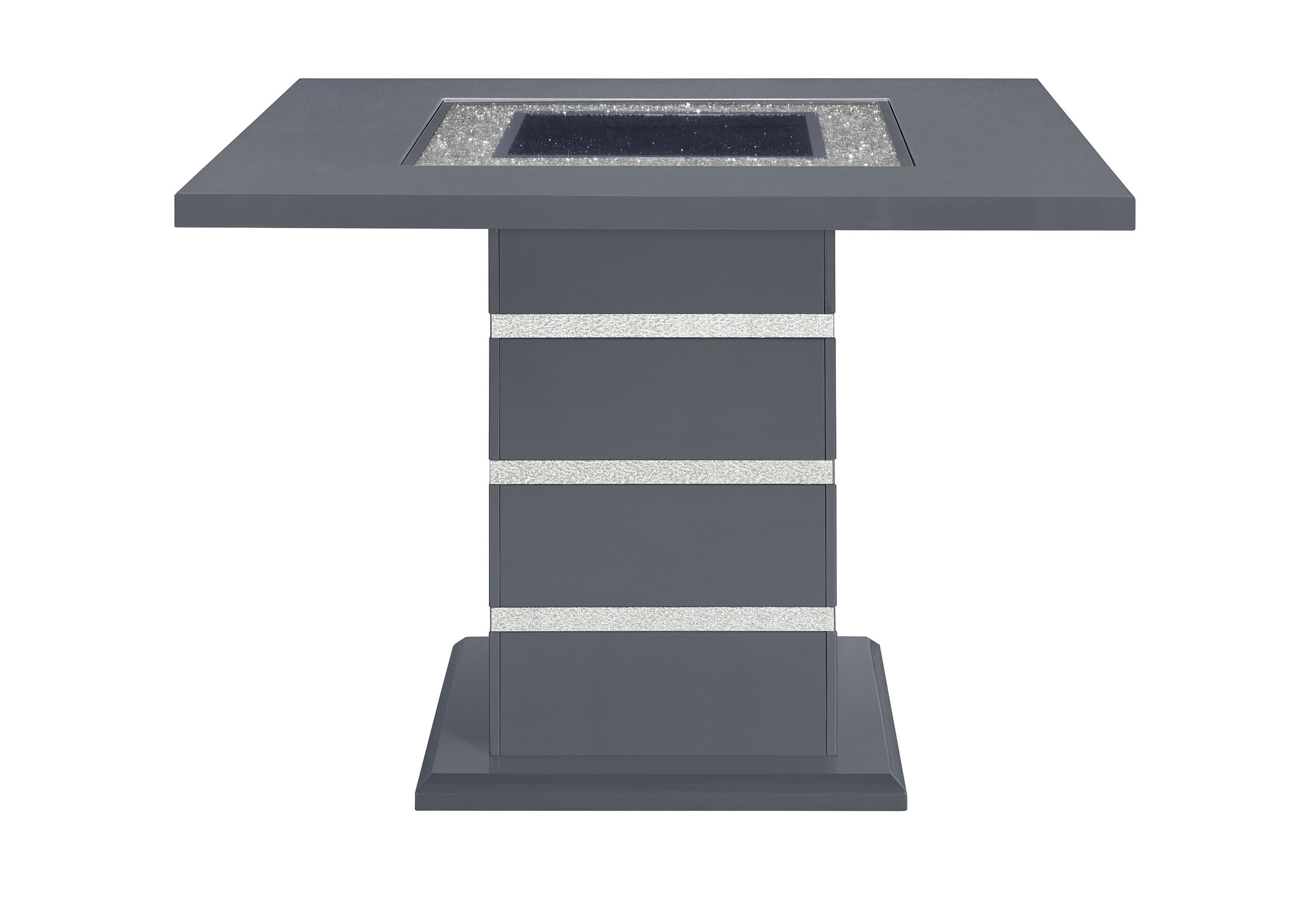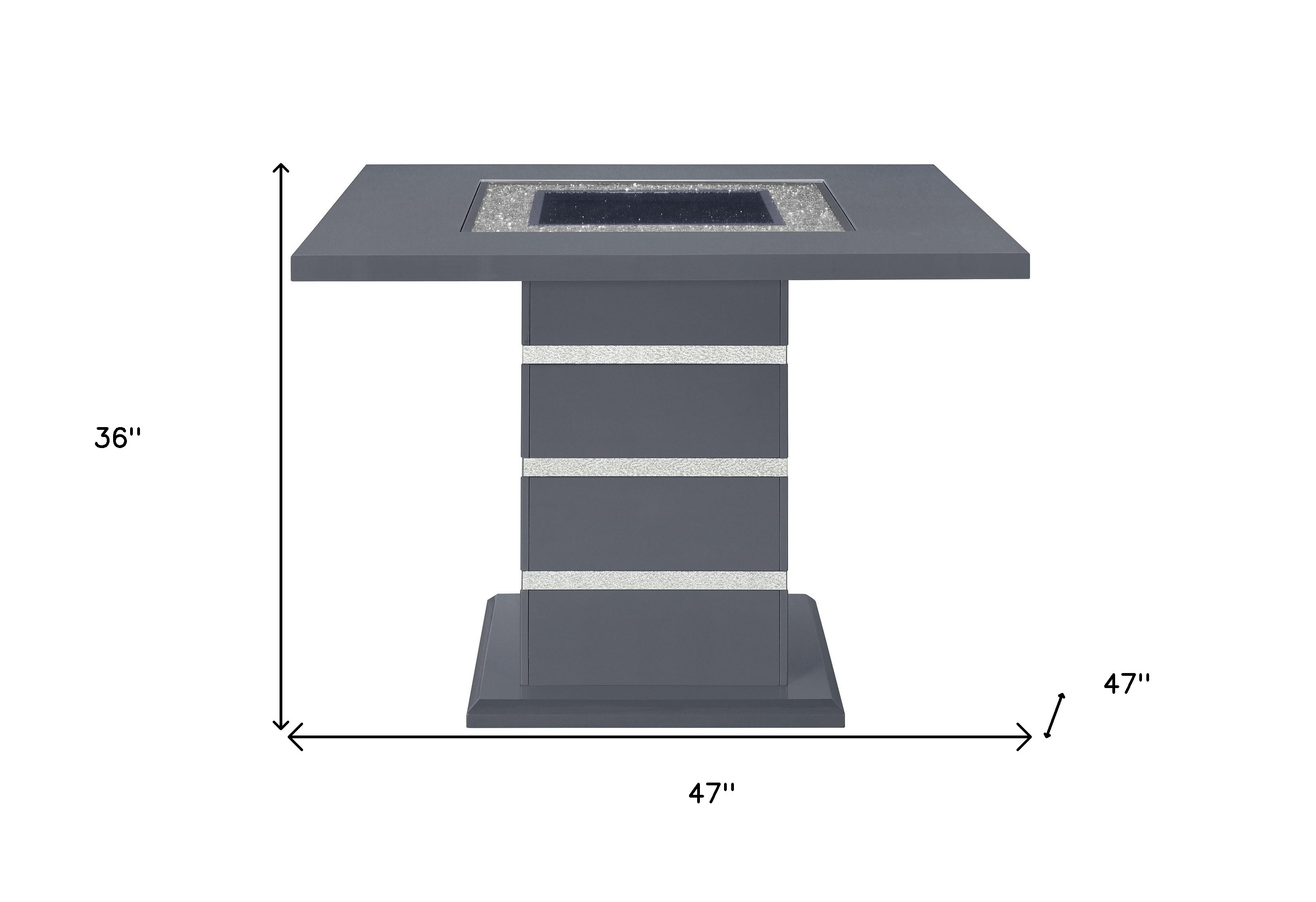 The 47-inch dark gray silver and black glass faux crystal and wood square bar table embodies glam style. Its striking quadratic shape offers ample space for gatherings, while the top surface has a glossy surface that includes exquisite glass inlay and rows of crushed faux crystal bling. The combination of gray with black and the sparkling silver faux crystal glitter adds a sophisticated and luxurious touch to your decor. The sturdy pedestal base provides stability, allowing for worry-free entertaining. Transform your space with this stunning piece of furniture that seamlessly blends functionality and style. 38-inch h x 47-inch w x 47-inch d.