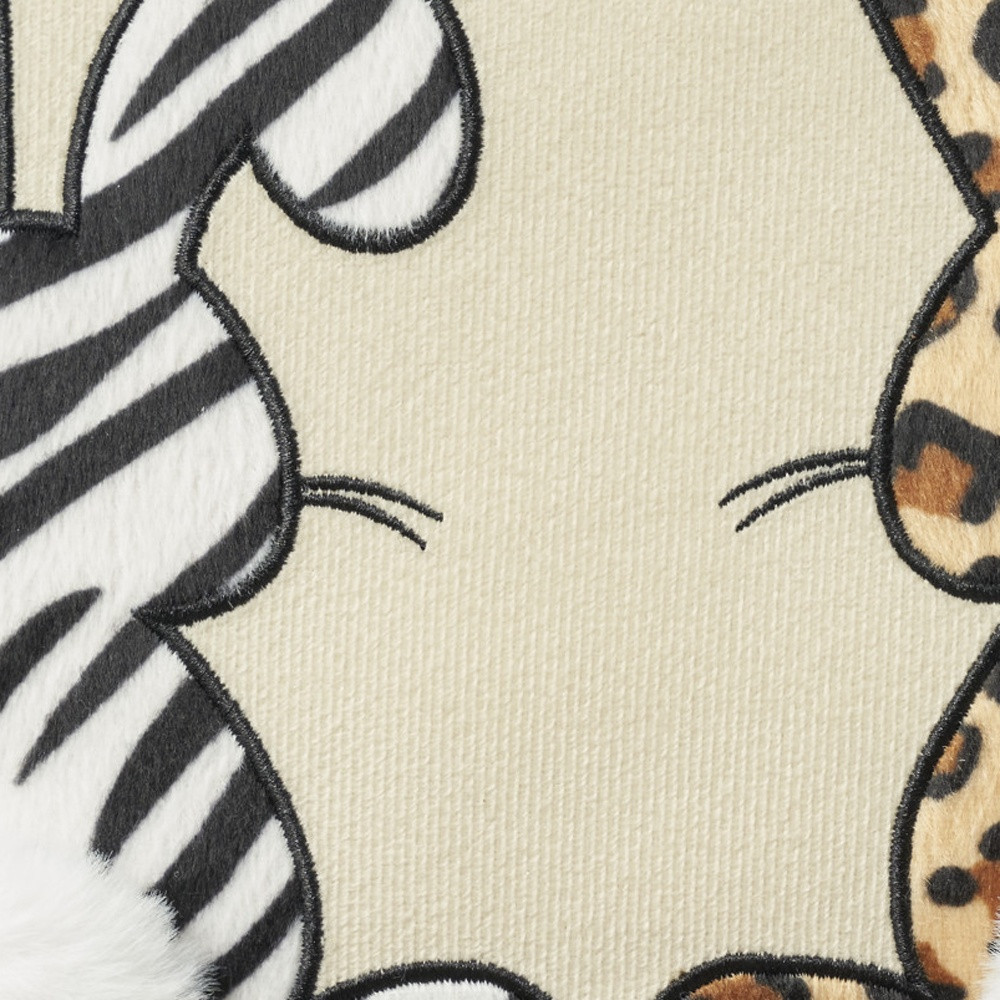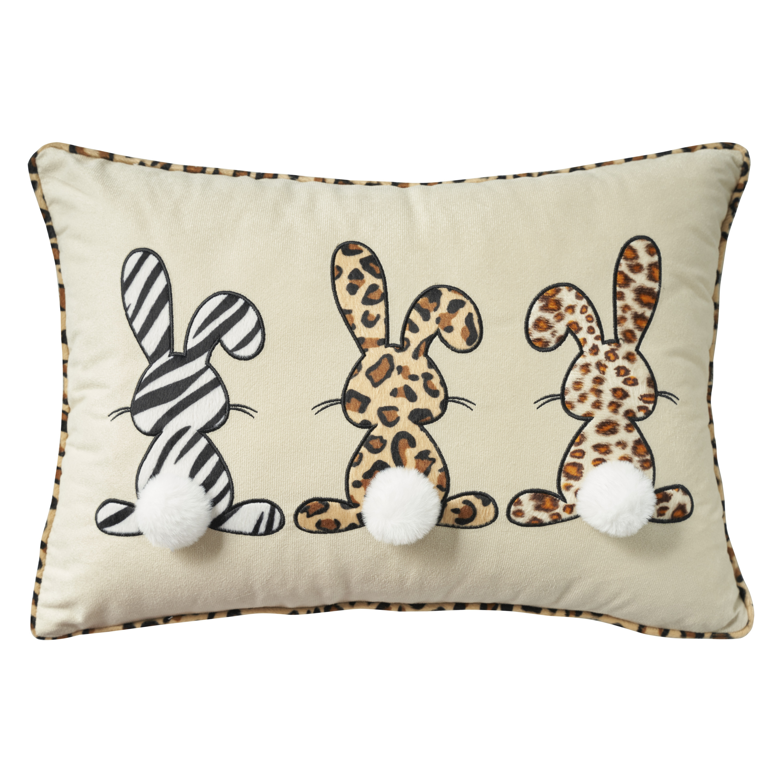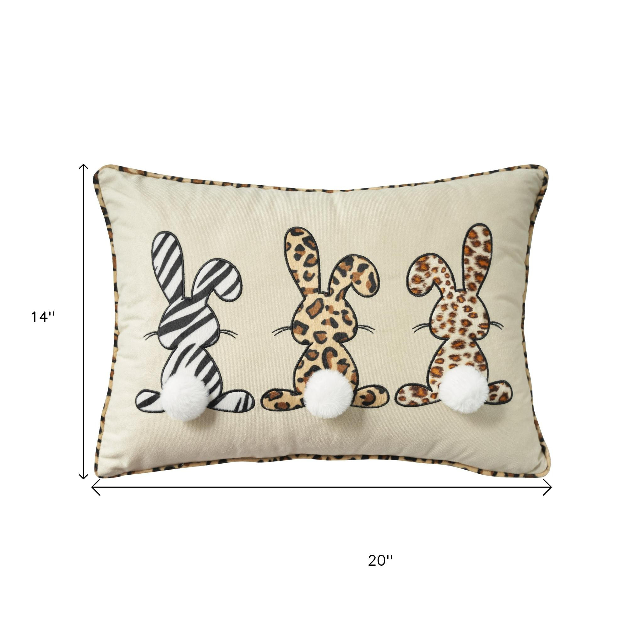 bunny trio lumbar throw pillow, beige animal print applique bunny, print applique bunny trio lumbar, 14" X 20" beige animal print, throw pillow pompoms |