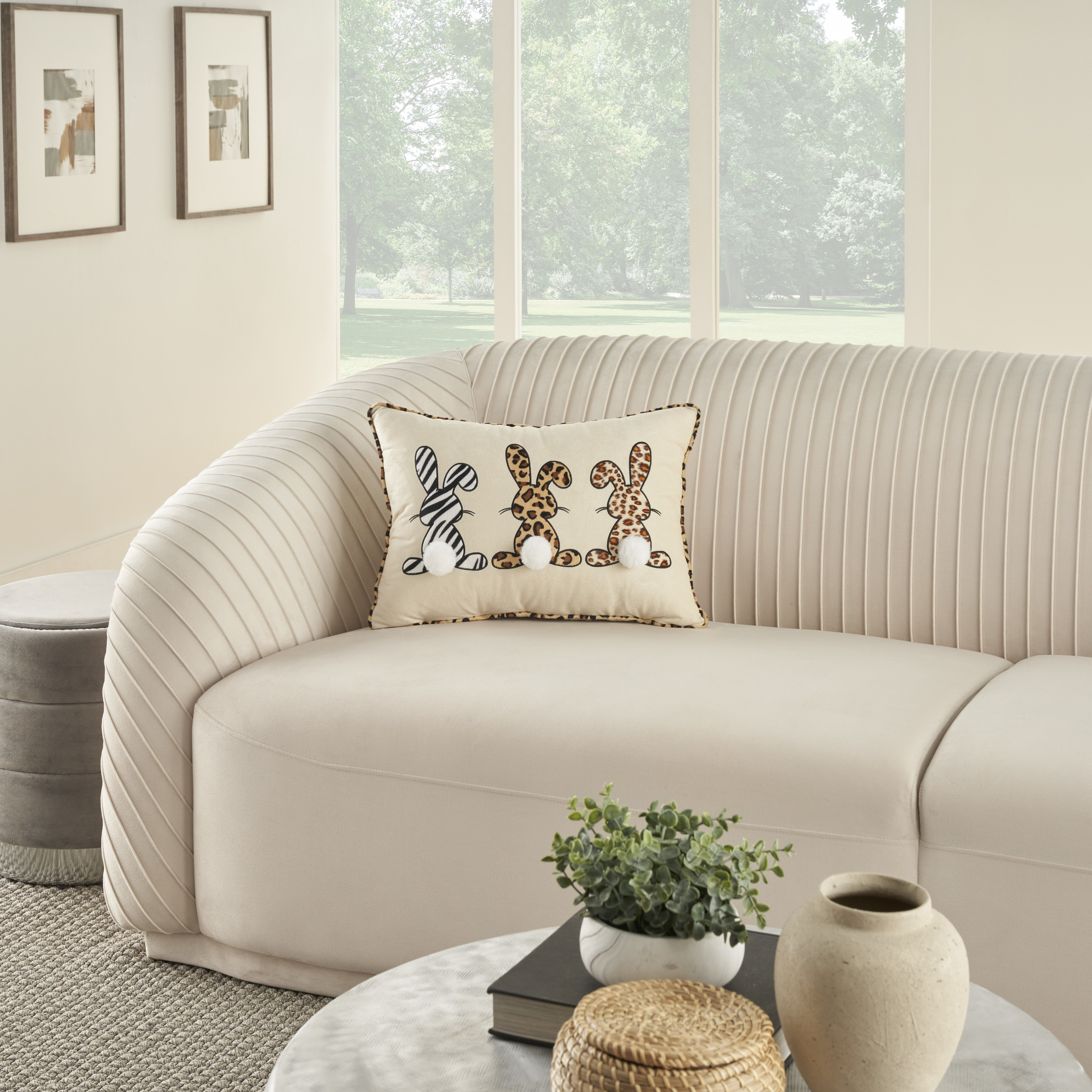 This cozy 14-inch x 20-inch beige animal print applique bunny trio lumbar throw pillow with pompoms adds some fun and festive modern Easter spirit to your holiday decorating or gifting. The fun animal print accents and textural pom pom tails add dimension and texture to your space. This soft polyester filled pillow not only is decorative but made to be comfy and cozy all day long. A great decorative accessory to add a fun touch of whimsical modern style, color, and dimension to your favorite chair, accent your sofa, or to use as part of your bed ensemble. 20.00-inch h x 14.00-inch w x 5.00-inch d.