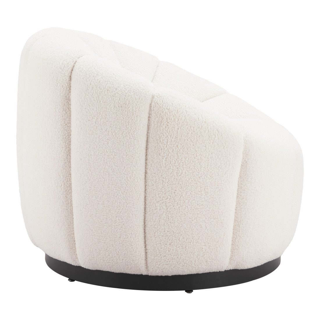 Give your living room, bedroom, or office a facelift with this beautifully crafted 36-inch cream and black faux shearling and upholstered barrel chair. Built to last this barrel chair is finished in solid cream faux shearling and 100% polyester to give your room a great update. The high quality manufactured wood inner frame flaunts a fixed back that is complimented by soft and comfortable cushioning. 29.5-inch h x 36-inch w x 35-inch d.