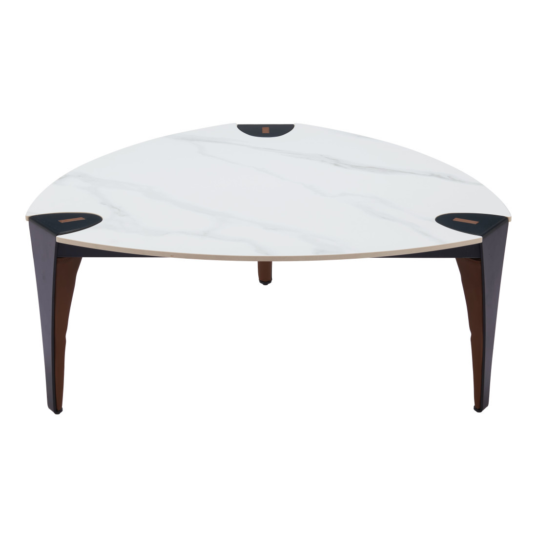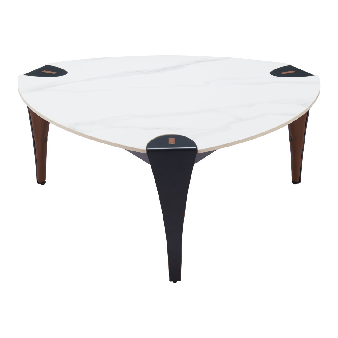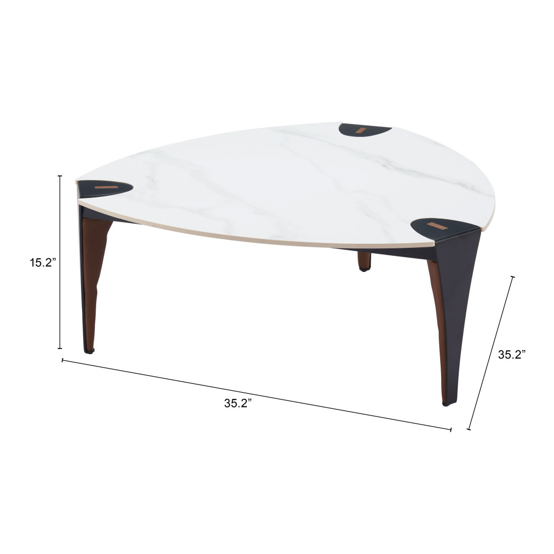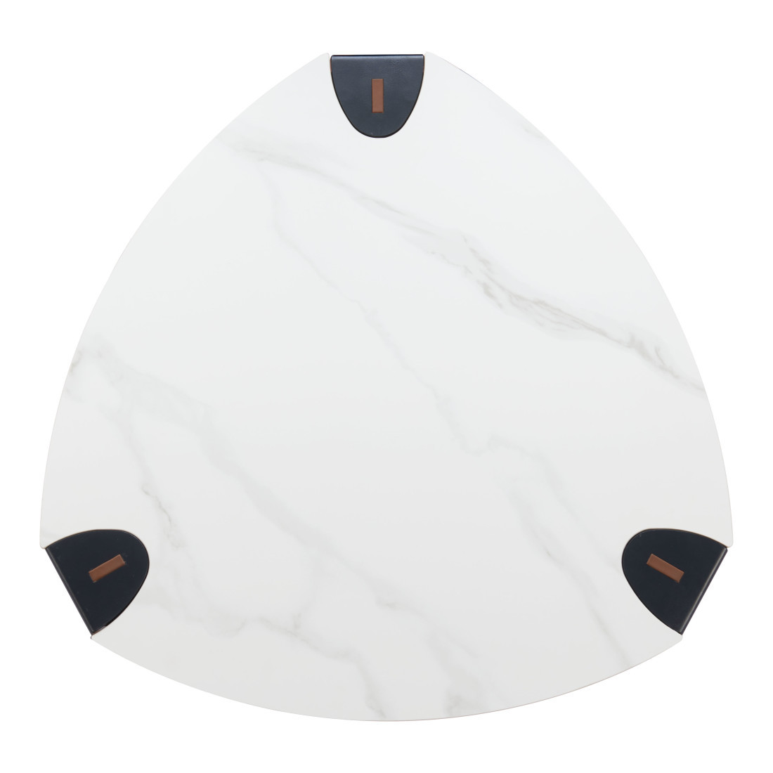 This stylish 36-inch white and black sintered stone, faux leather, and steel triangle coffee table is sure to inspire compliments no matter where it sits. The powder coated steel frame is encased in faux leather for a unique look that is then complimented by a white sintered stone top. The epitome of quality construction and design, this unique table gives your room a modern and contemporary geometric accent. It has an attractive design that will definitely breathe some fresh air into your interior. 15.2-inch h x 36-inch w x 36-inch d.