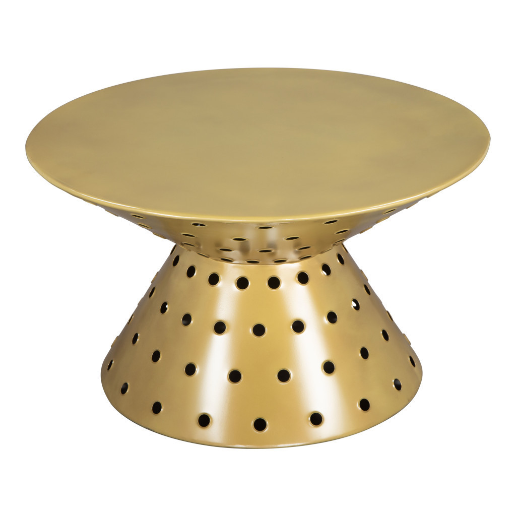 This stylish 30-inch gold iron round pedestal coffee table is sure to inspire compliments no matter where it sits. This table features quality construction from iron and an updated monotone color scheme with gold as the main color on both the top and the base. It has an attractive design that will definitely breathe some fresh air into your interior. 17-inch h x 30-inch w x 30-inch d.