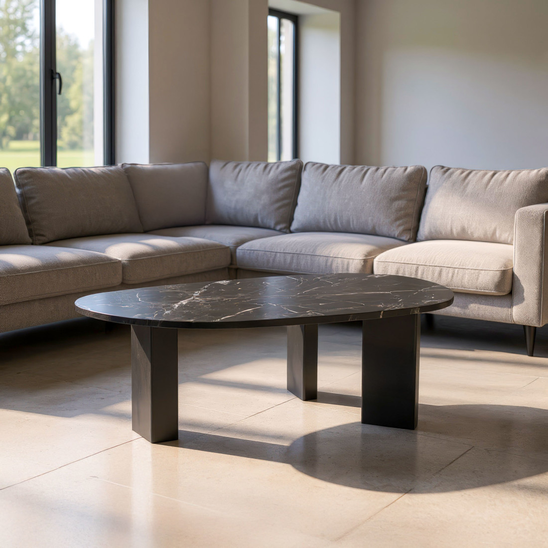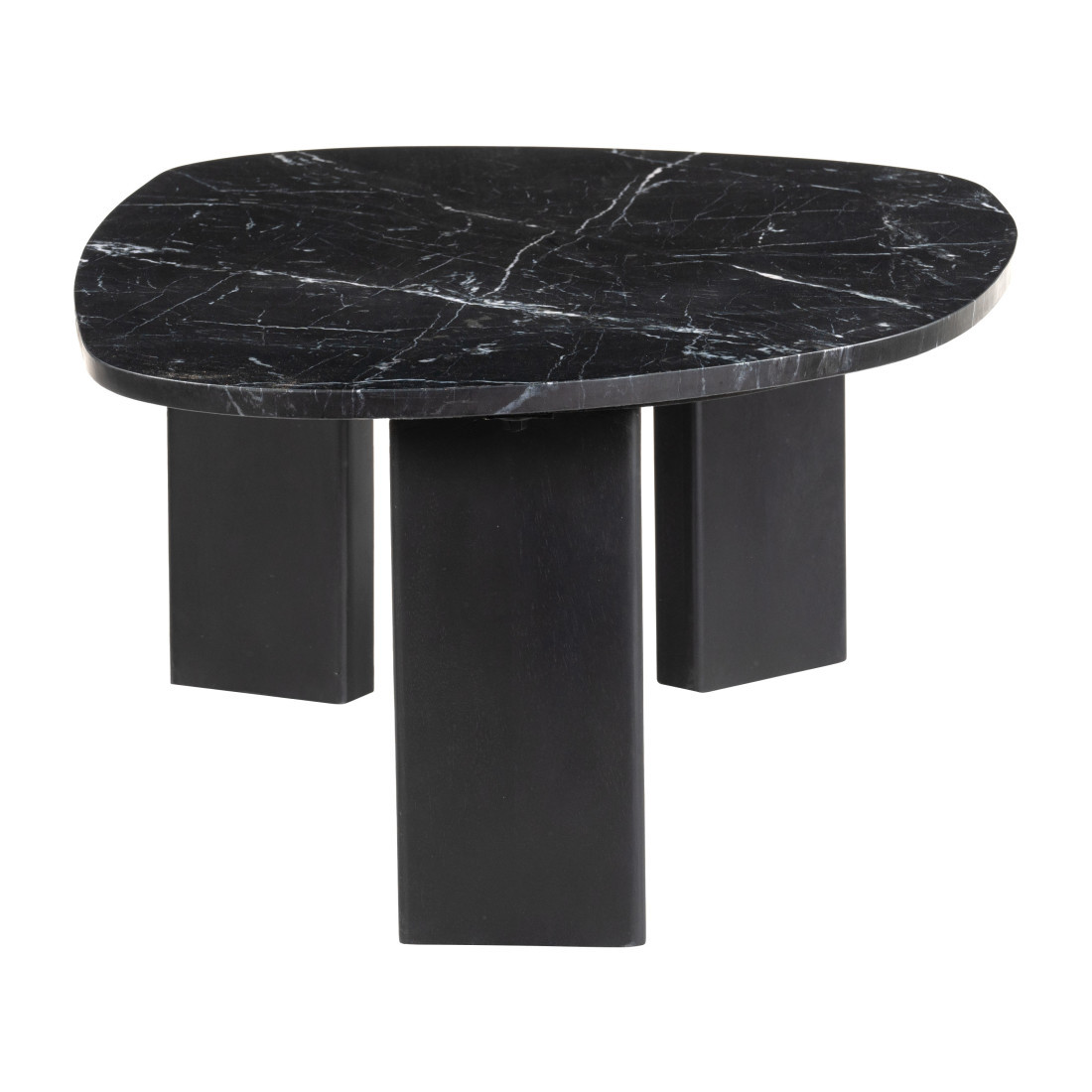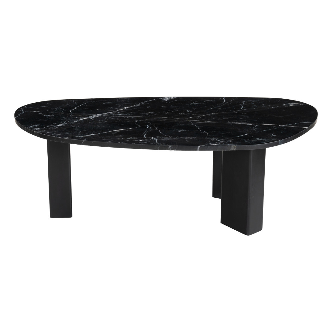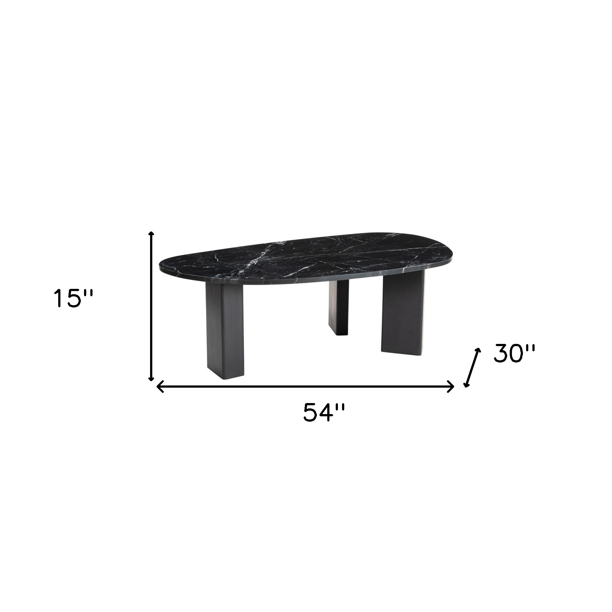 Make your living room or family room really stand out with this 54-inch black genuine marble and wood free form coffee table. A black painted solid and manufactured wood frame is finished off with a stunning black genuine marble top, giving this table a chic monotone look. This free_form table utilizes its unique shape to give your room a modern geometric accent. If you're looking for something that can fit into a living area, bedroom, or office, this coffee table is for you. 15-inch h x 54-inch w x 30-inch d.