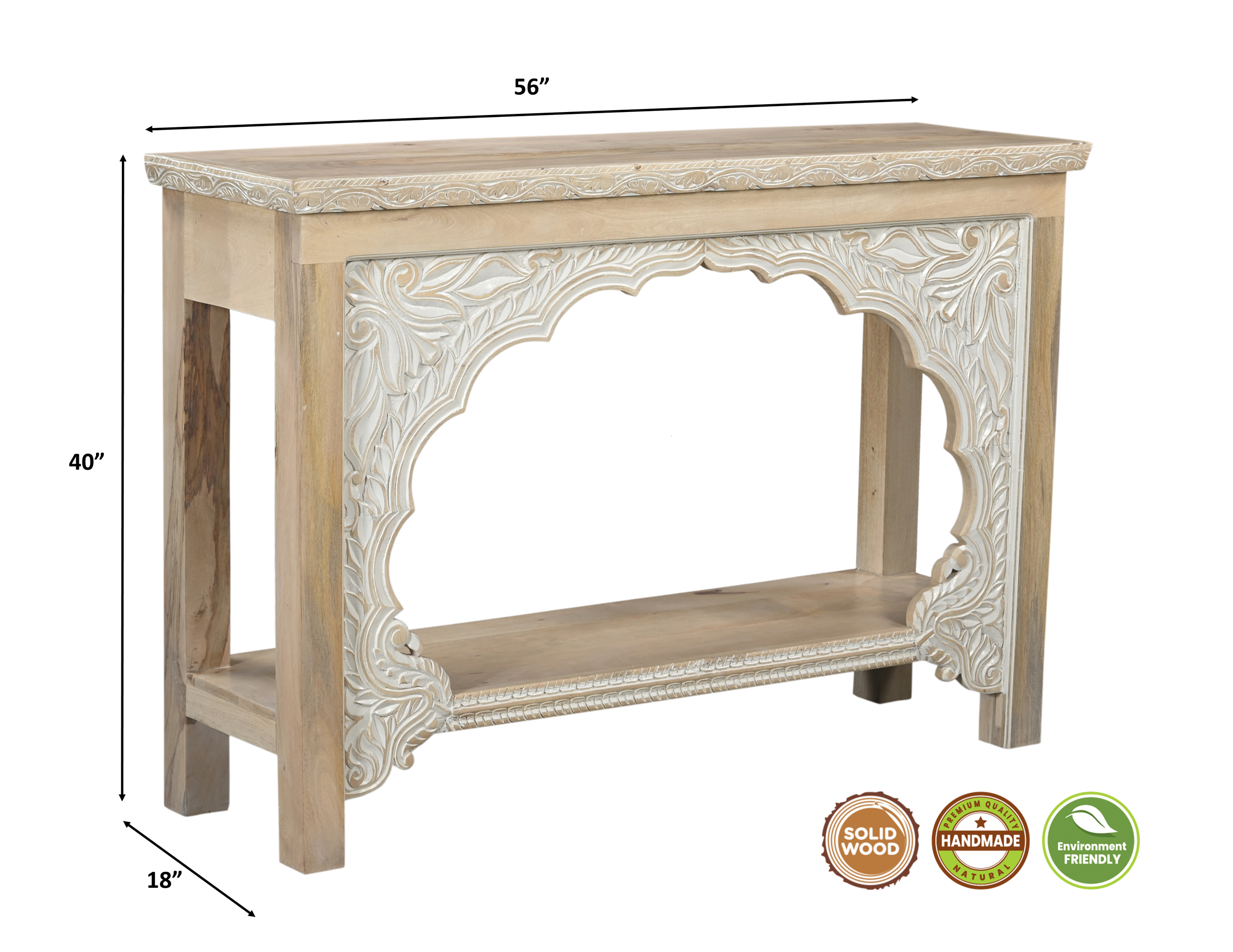 This 56-inch natural solid wood distressed console table with shelf is a high-quality, long-lasting piece of furniture that you can enjoy for years to come. This versatile table is a classic rectangular shape, which will easily fit into most any space in your home. The natural hardwood table surface makes this unit stand out with its high quality material and construction. The four leg of this unit is crafted with solid wood, leaving you with a console table that is of the finest quality and materials. Versatile in use, console tables can be used for a variety of purposes in a variety of rooms and settings. 40-inch h x 56-inch w x 18-inch d.
