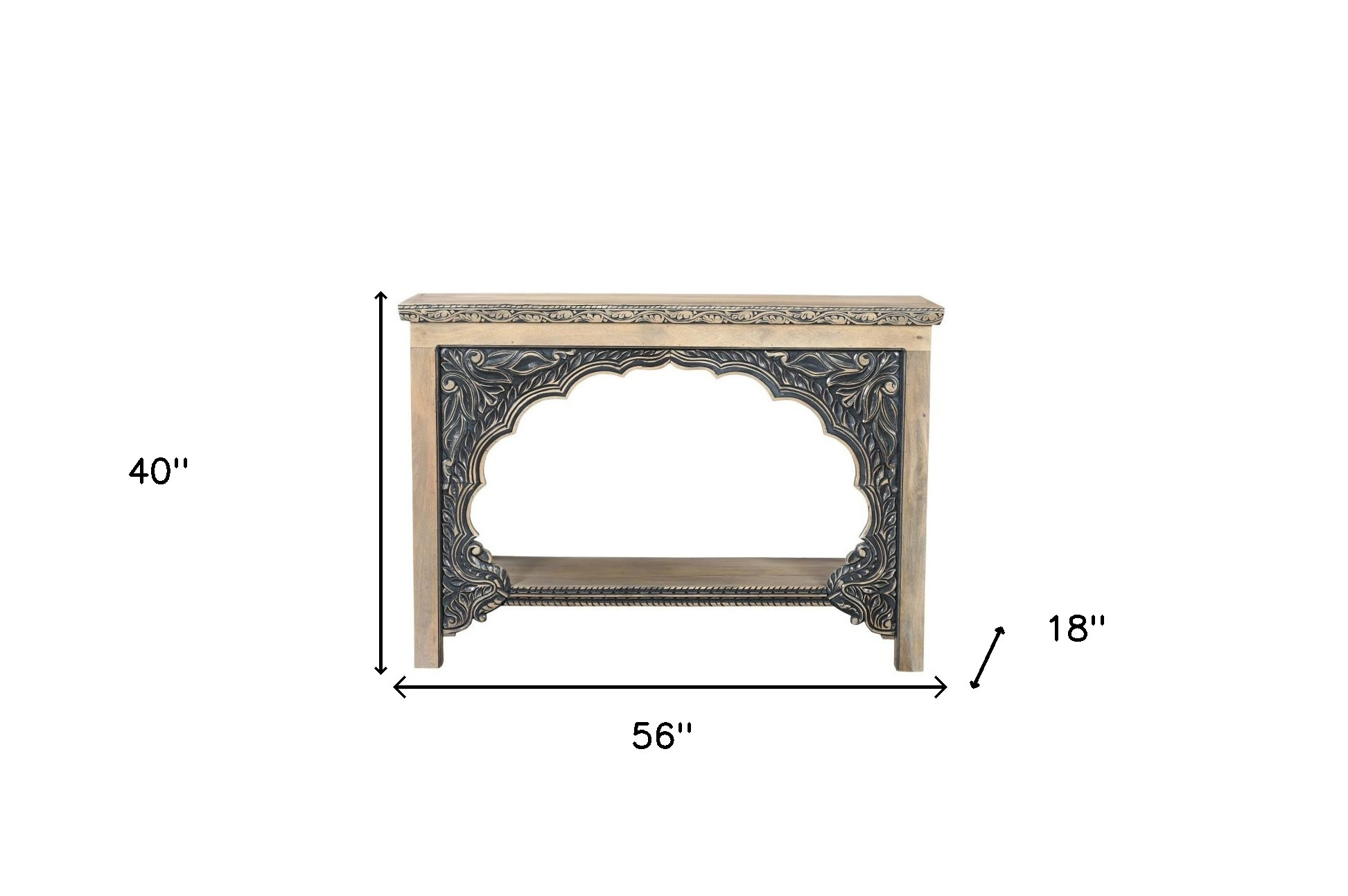 Make a statement in your entryway with our stunning 56-inch natural and black solid wood distressed console table with shelf. This rectangular table has clean lines and plenty of surface area. This unit has a natural genuuine hardwood tabletop. The four leg of this unit is crafted with solid wood, leaving you with a console table that is of the finest quality and materials. Ideal for living rooms, bedrooms, home offices, and lounge areas, this console table is not only good looking but multi-functional and practical addition to your space. 40-inch h x 56-inch w x 18-inch d.