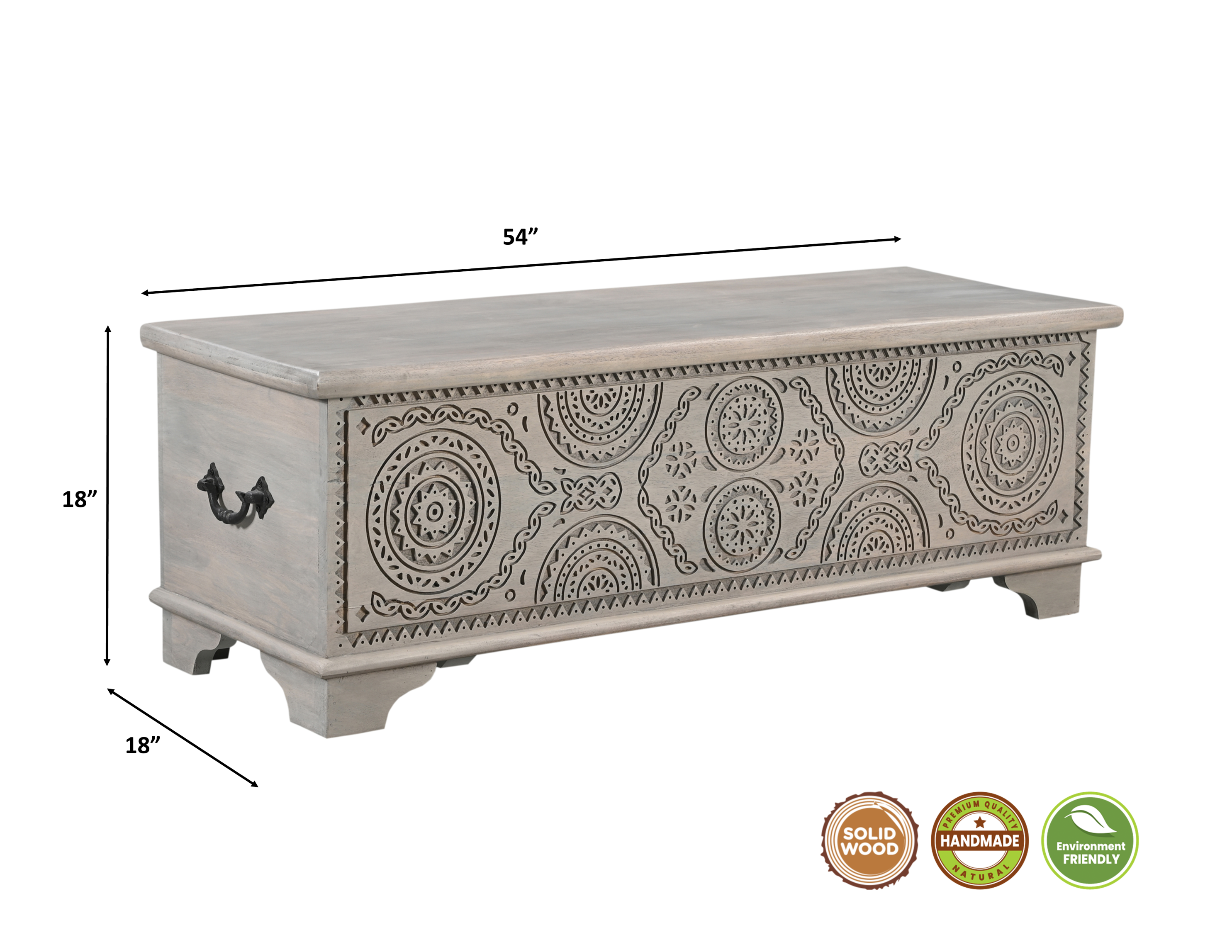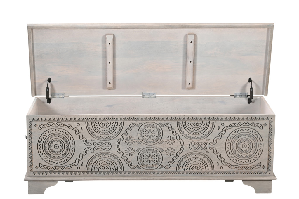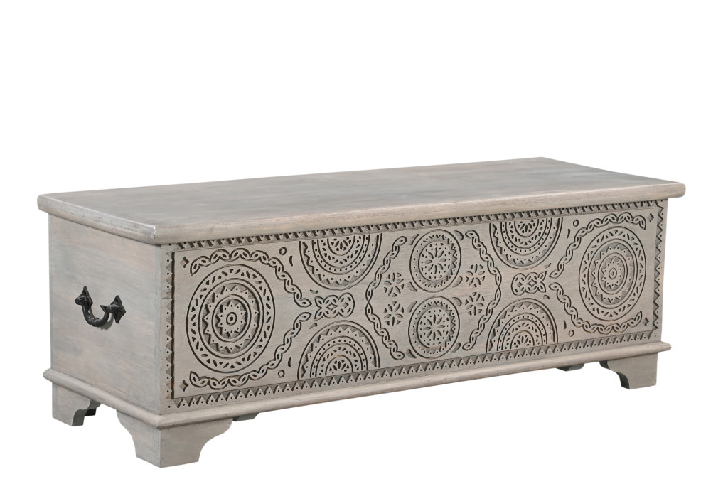 Get ready to relax with this 54-inch gray carved geo scroll solid wood storage ottoman. Designed to discretely add hidden storage to your room without sacrificing style. This multi-functional storage piece is handcrafted from high quality solid mango wood in a gray color with geometric carved detailing throughout the base and top. The purposefully distressed finish gives this versatile ottoman an authentically rustic feel. Easy to blend into most any room, a ottoman is a way to add a good looking accent to your space that can also be practical and useful. 18-inch h x 54-inch w x 18-inch d.