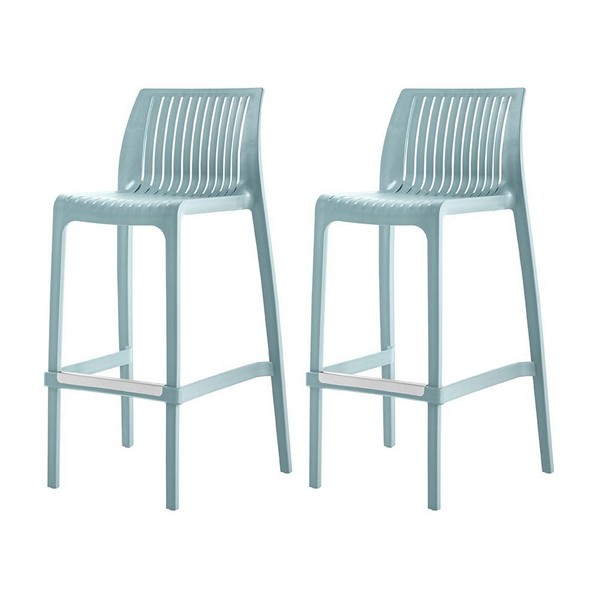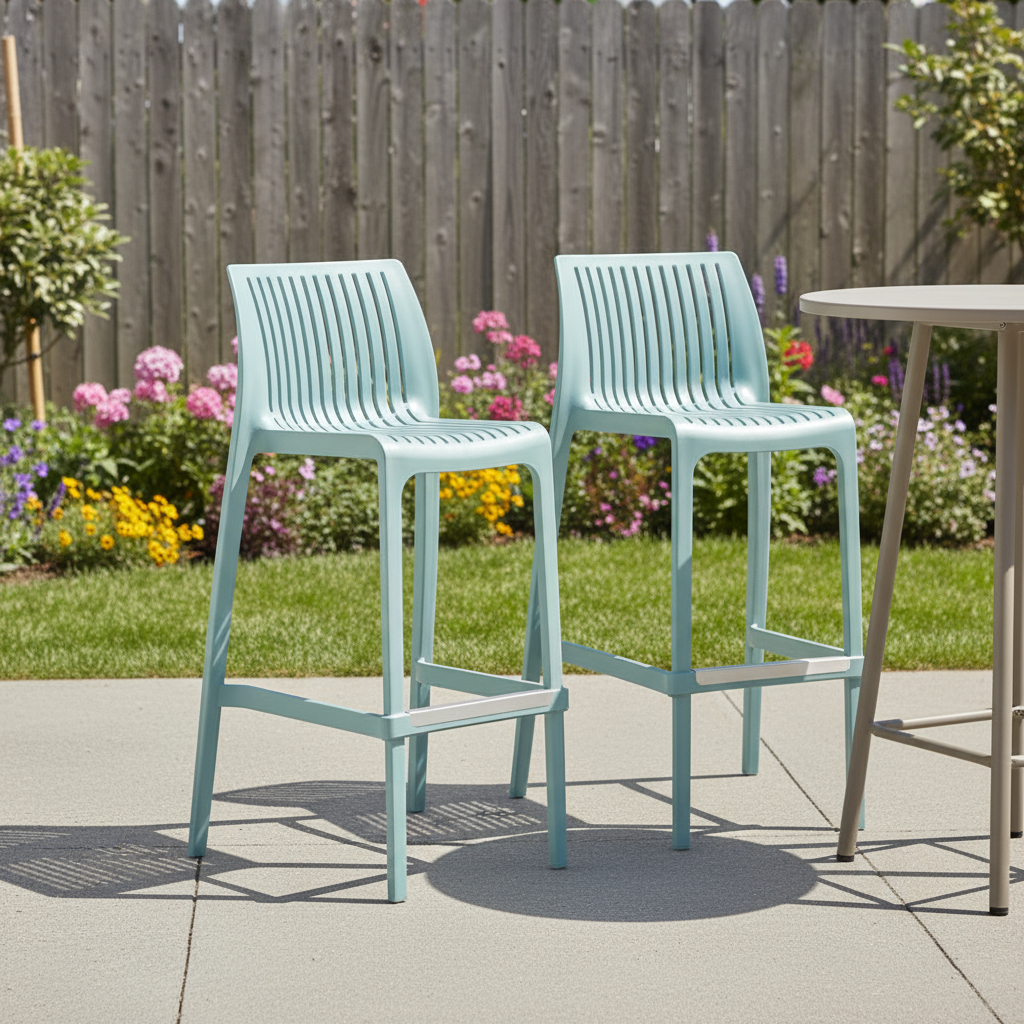 Comfort and design come together nicely in this set of two 30-inch baby blue heavy duty plastic low back outdoor bar height chairs. Let the captivating baby blue color serve as an artistic expression, leaving a lasting impression that embodies your individuality. Not only good looking and stylish, this chair also features a square shaped seat and a low back for the ultimate in comfort and enjoyment. For outdoor gatherings on the deck, yard, patio or poolside, this bar stool is a comfy and trendy option. 40.20-inch h x 19.90-inch w x 20.00-inch d.
