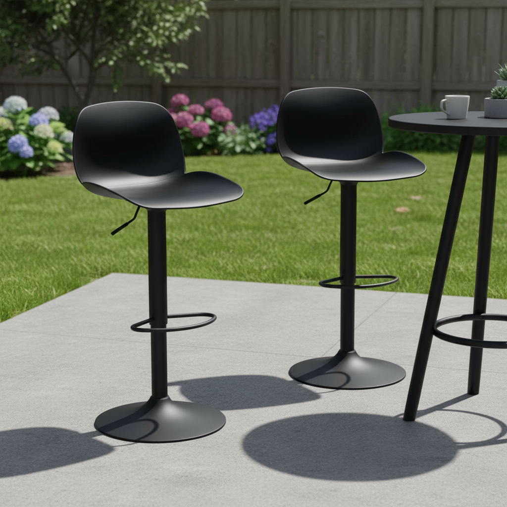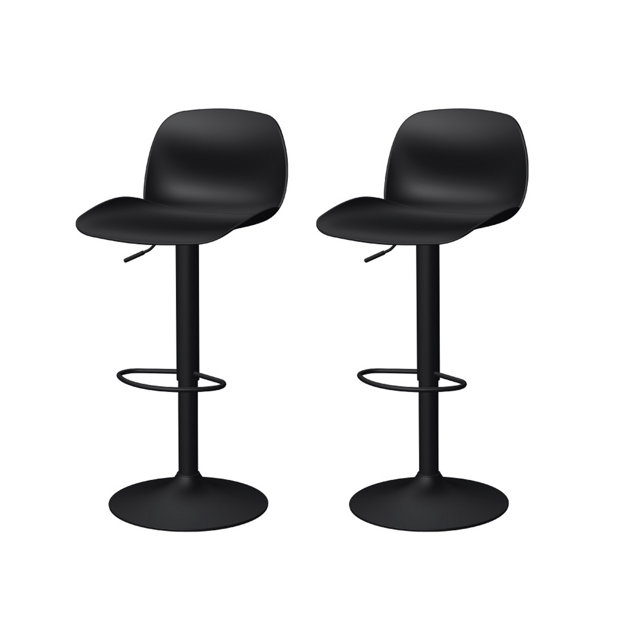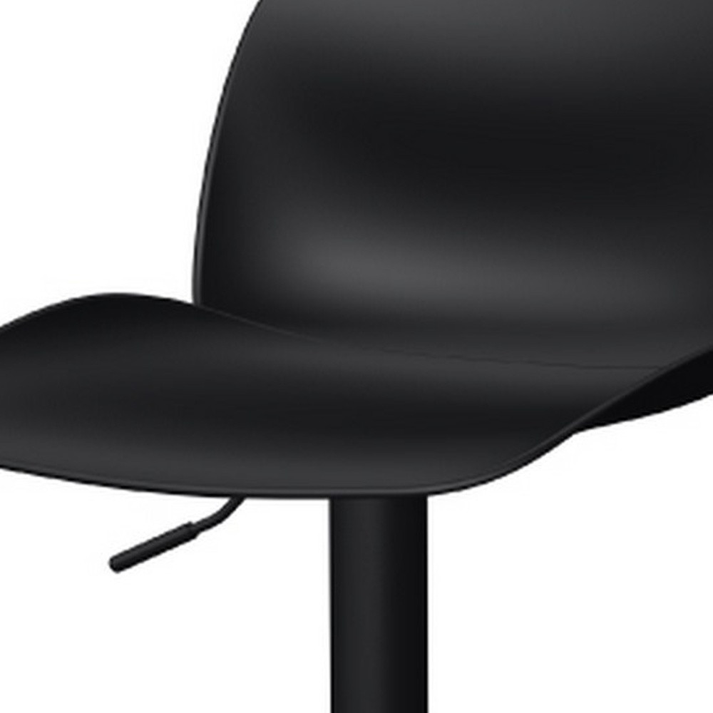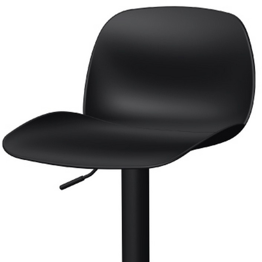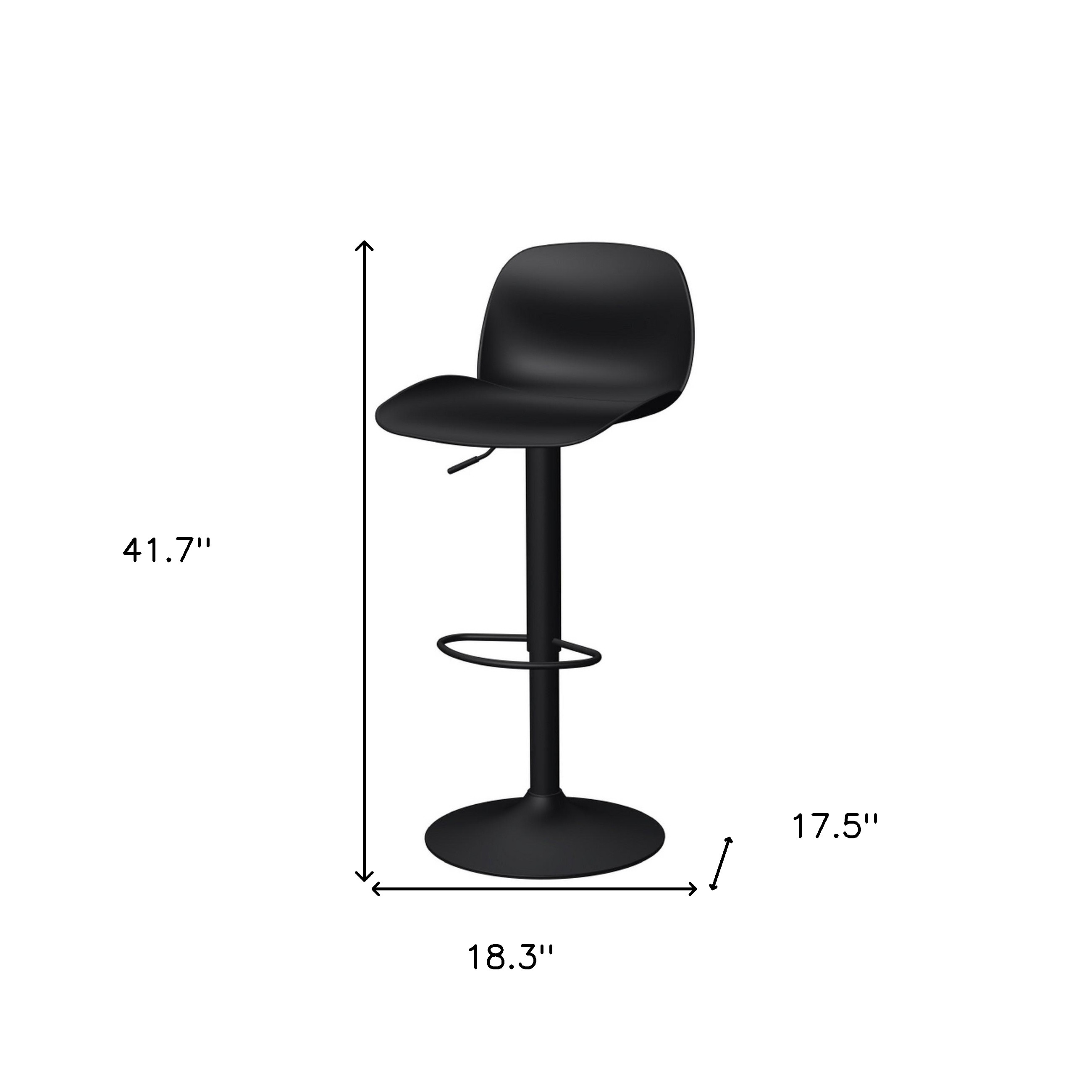 Comfortable enough to sit in for awhile, this set of two black heavy duty plastic and metal low back adjustable height swivel bar chairs will transcend the look of your room. The base of this stool is made from metal in a black, that matches the plastic, also in black. A low back mixed with a square shaped seat design makes this chair both comfortable and fashionable. 41.70-inch h x 18.30-inch w x 17.50-inch d.
