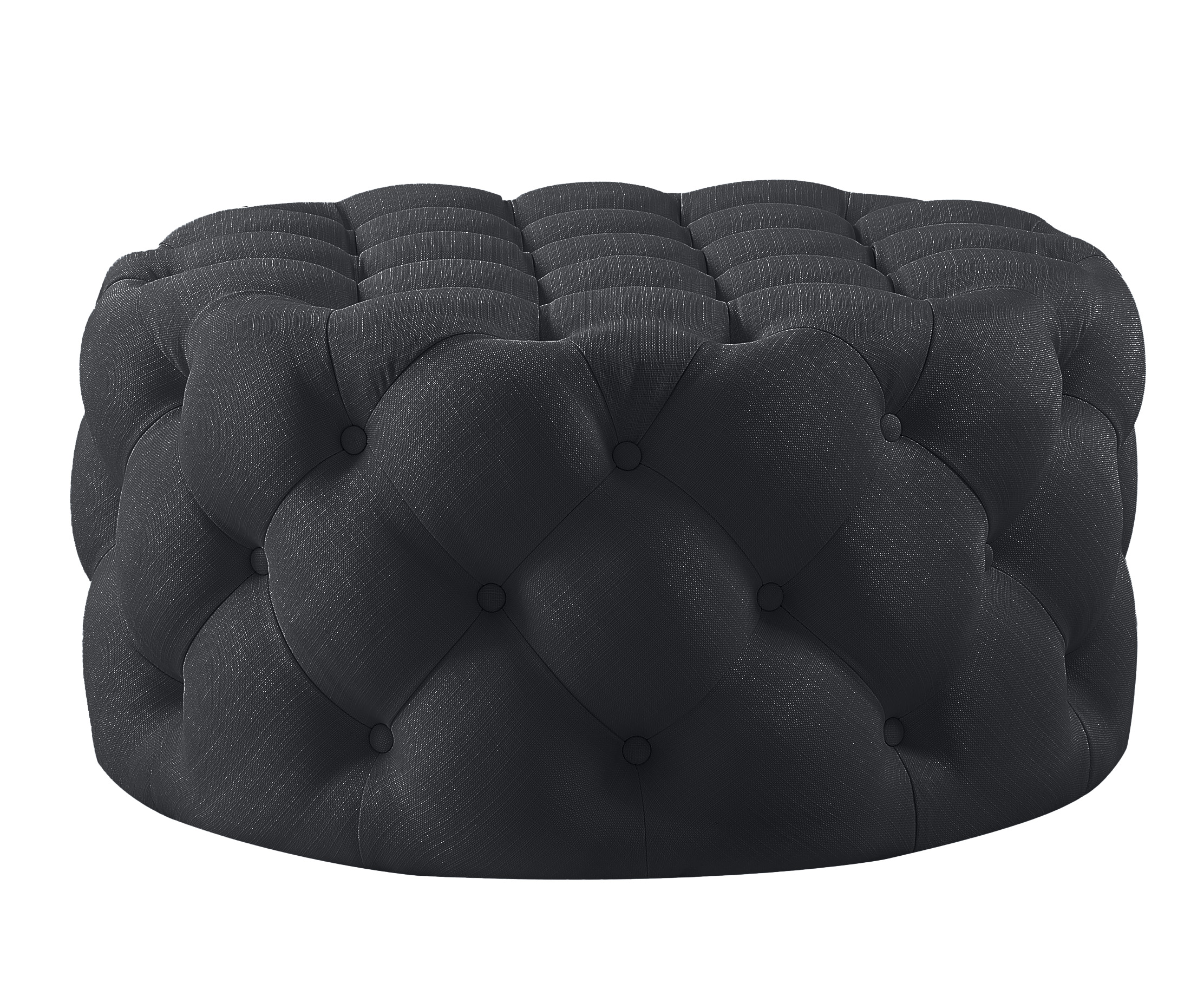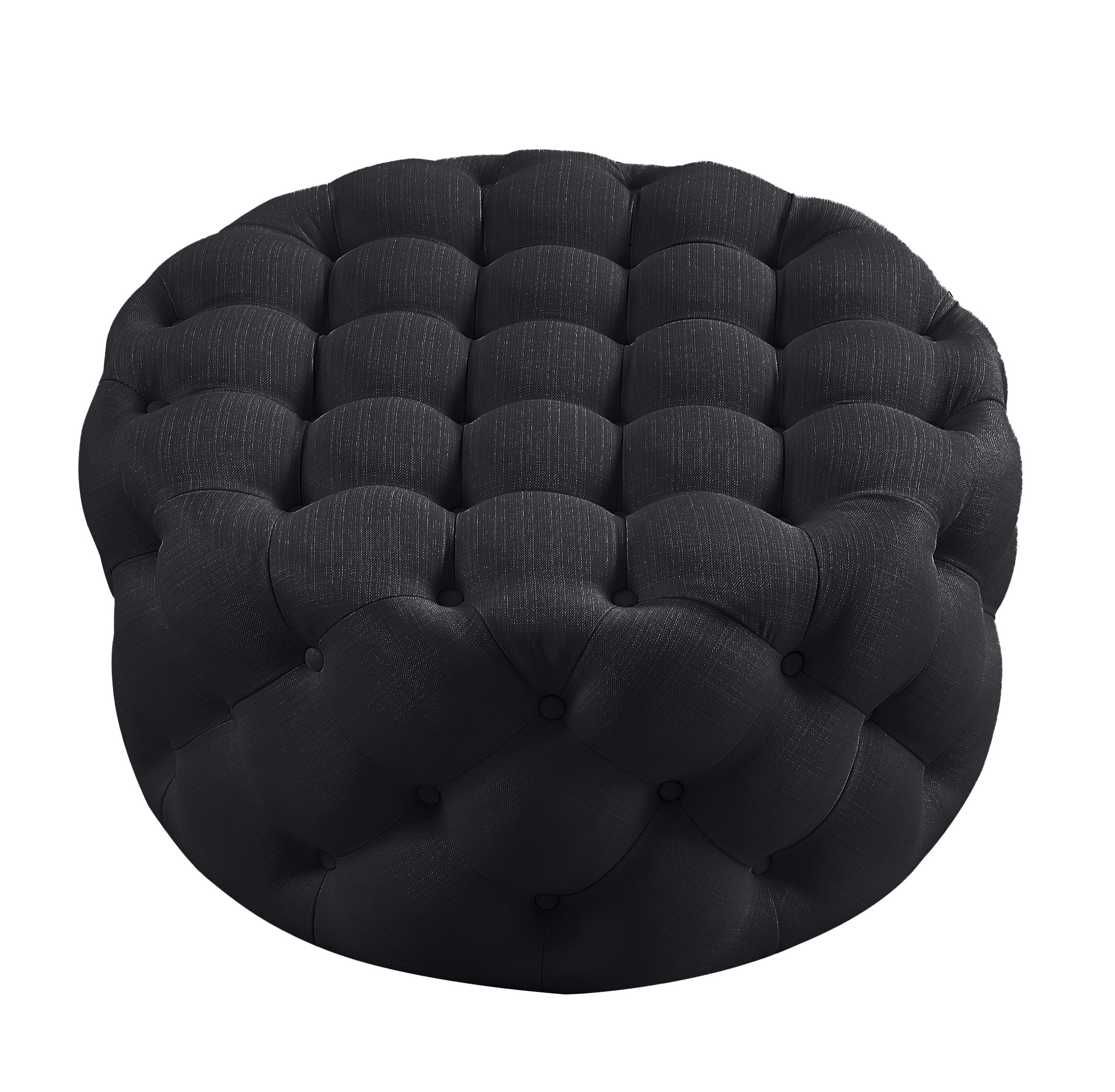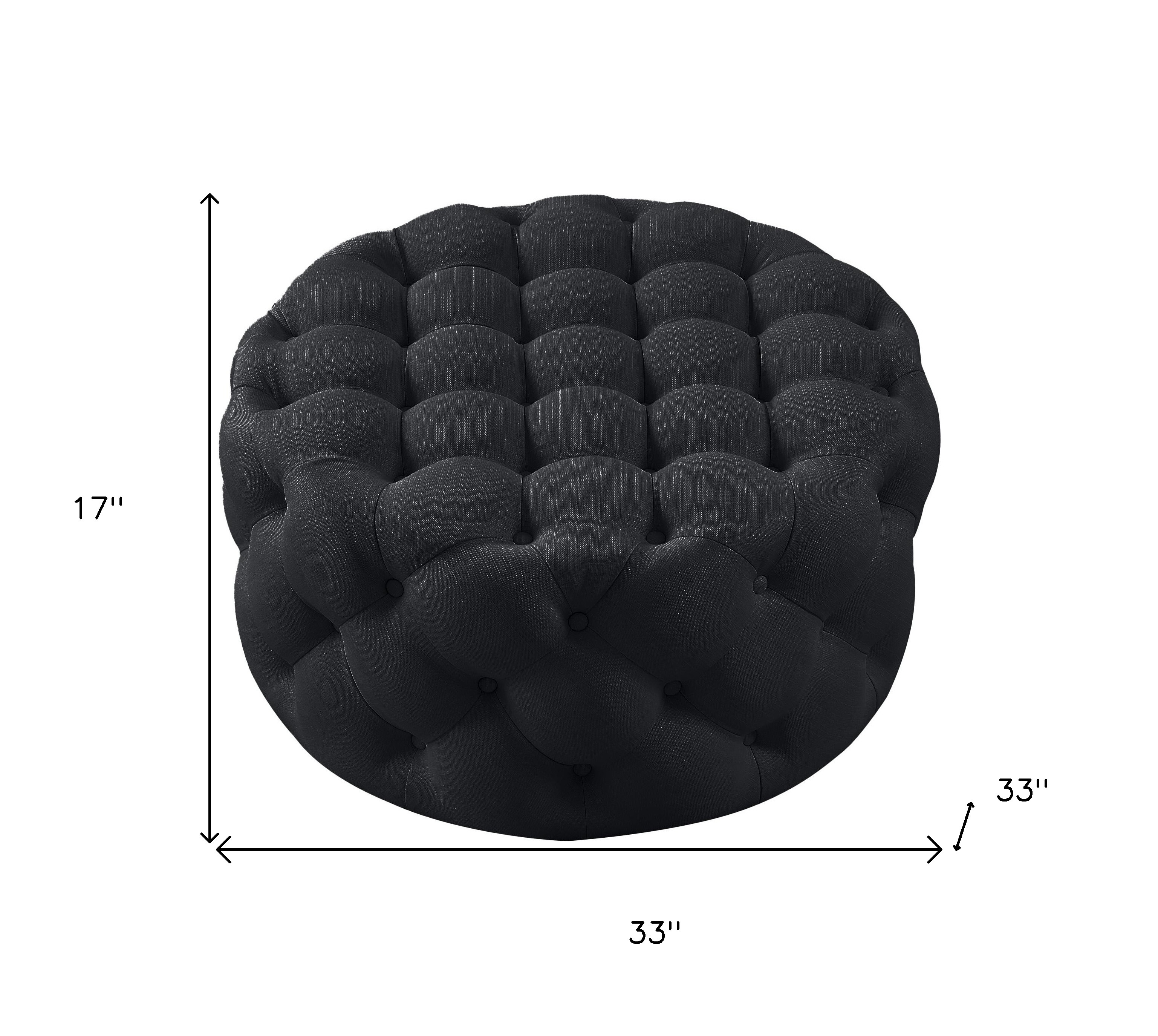 linen tufted round cocktail ottoman, tufted round cocktail ottoman, round cocktail ottoman, black linen tufted round cocktail, 33" black linen tufted round |
