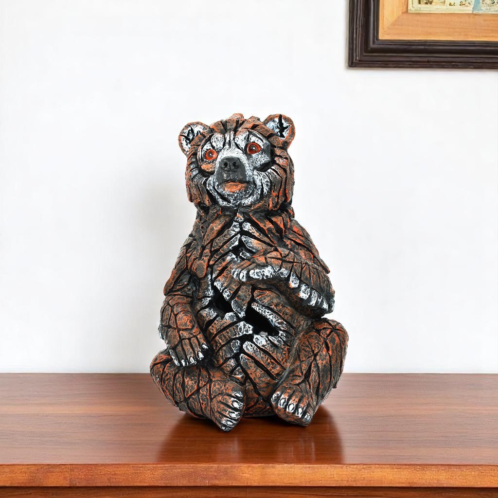 Unique and decorative, this 6-inch brown white and black resin bear tabletop sculpture will leave a lasting impression. Update your room with this woodland animal decor. A perfect decorative addition for anyone who loves a stylish look and feel. This machine-made piece showcases a charming bear, perfect for animal lovers seeking a touch of nature-inspired elegance. Crafted from durable resin, it seamlessly blends with various design aesthetics. Its transitional style ensures it complements both modern and traditional interiors, enhancing any tabletop setting gracefully. 6-inch h x 3.5-inch w x 3-inch d.