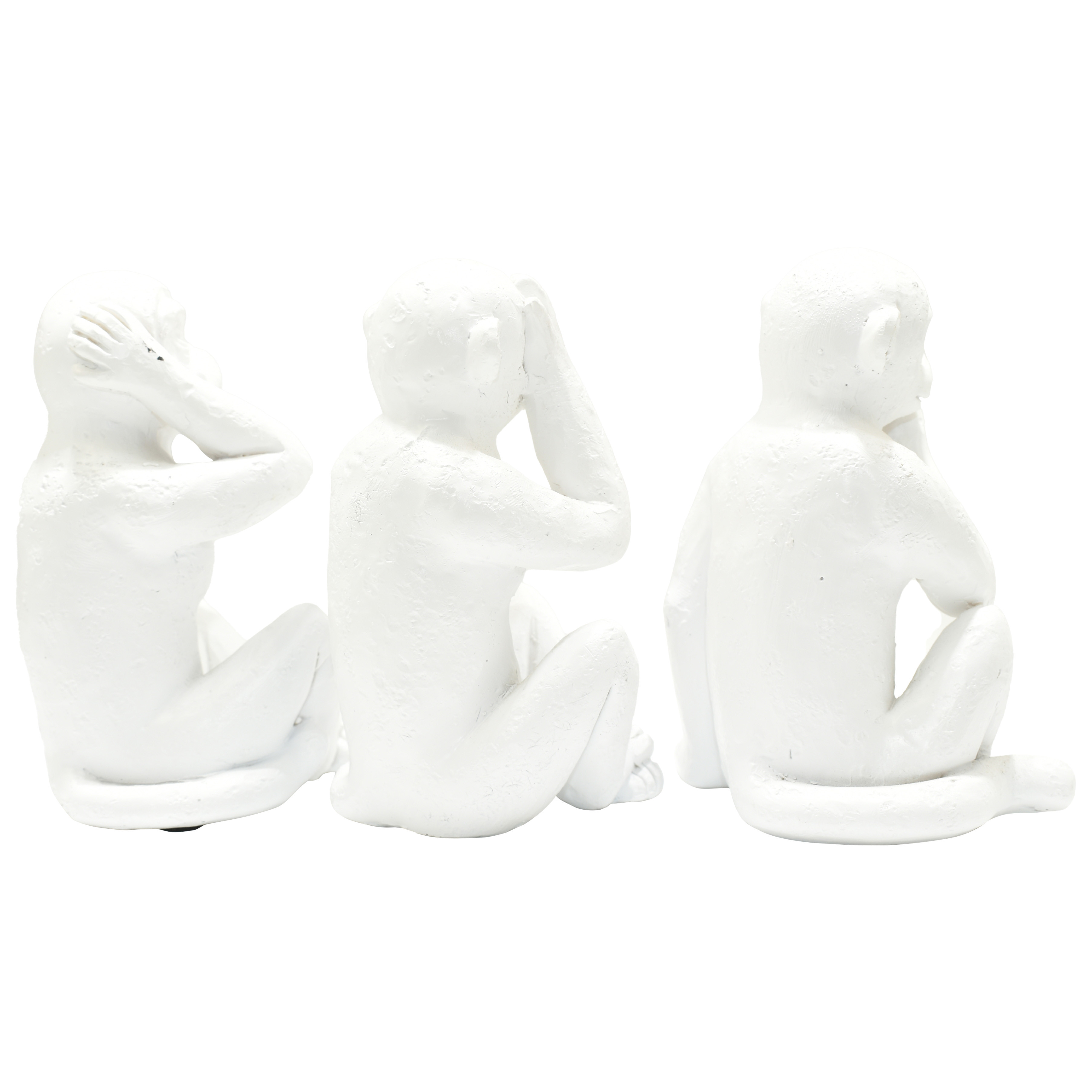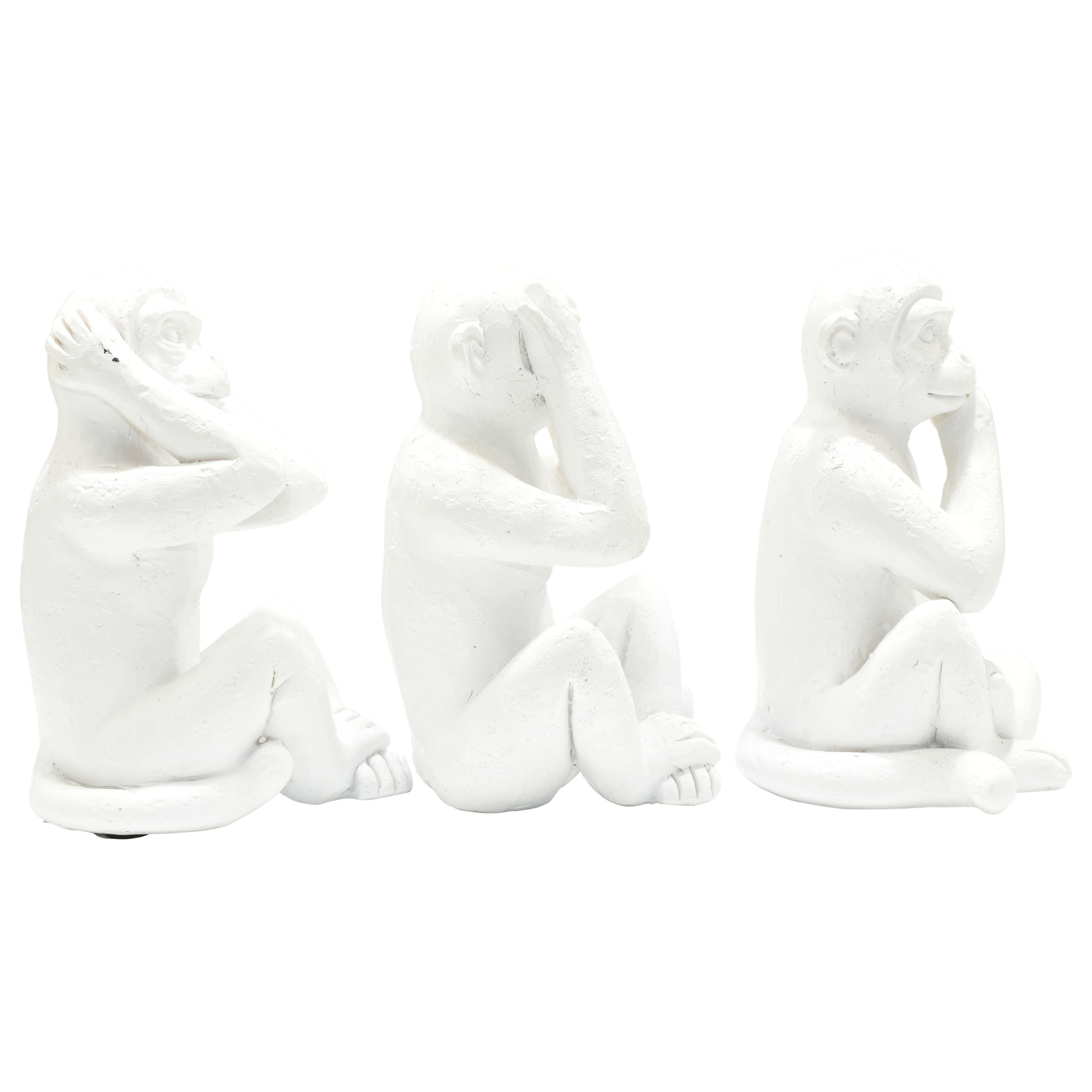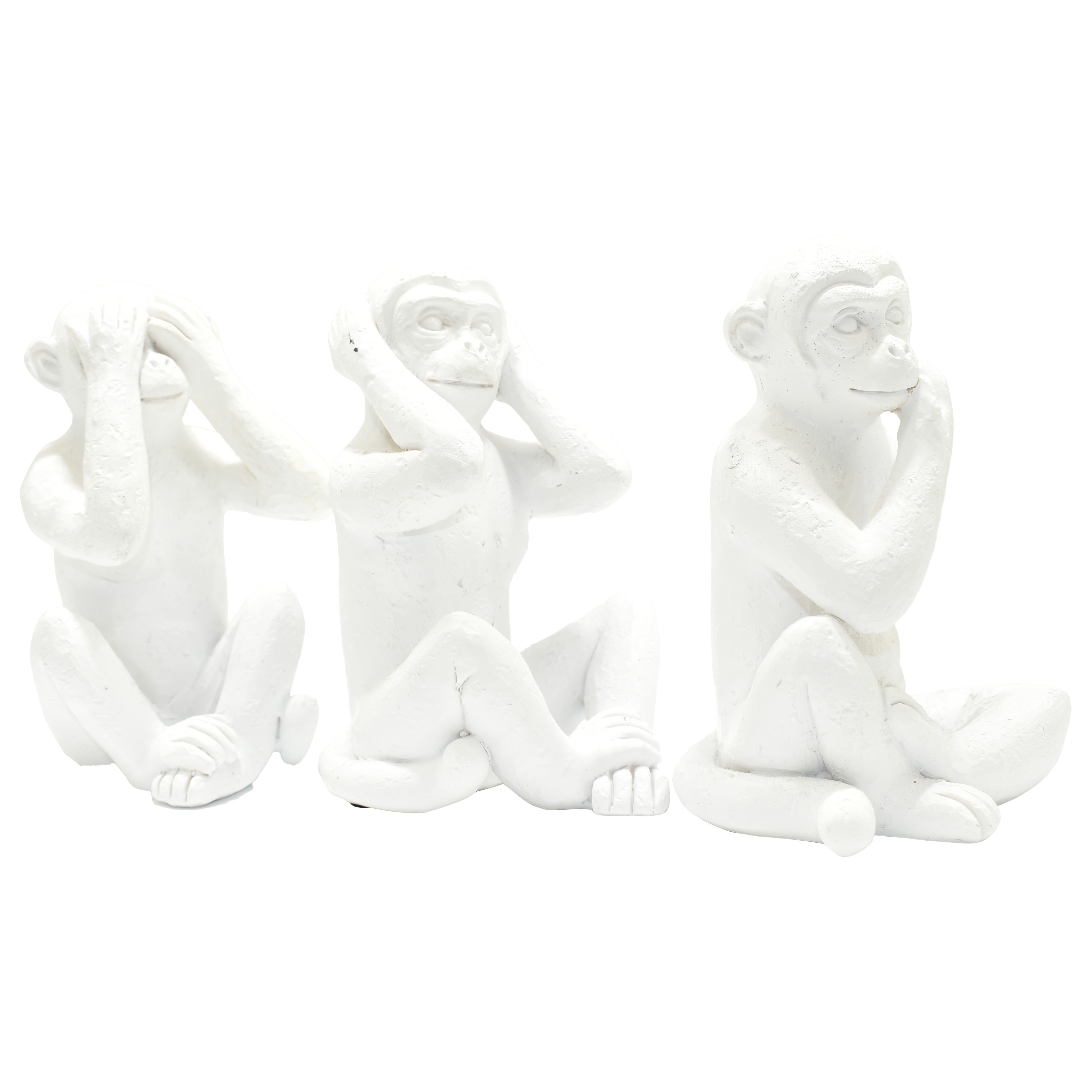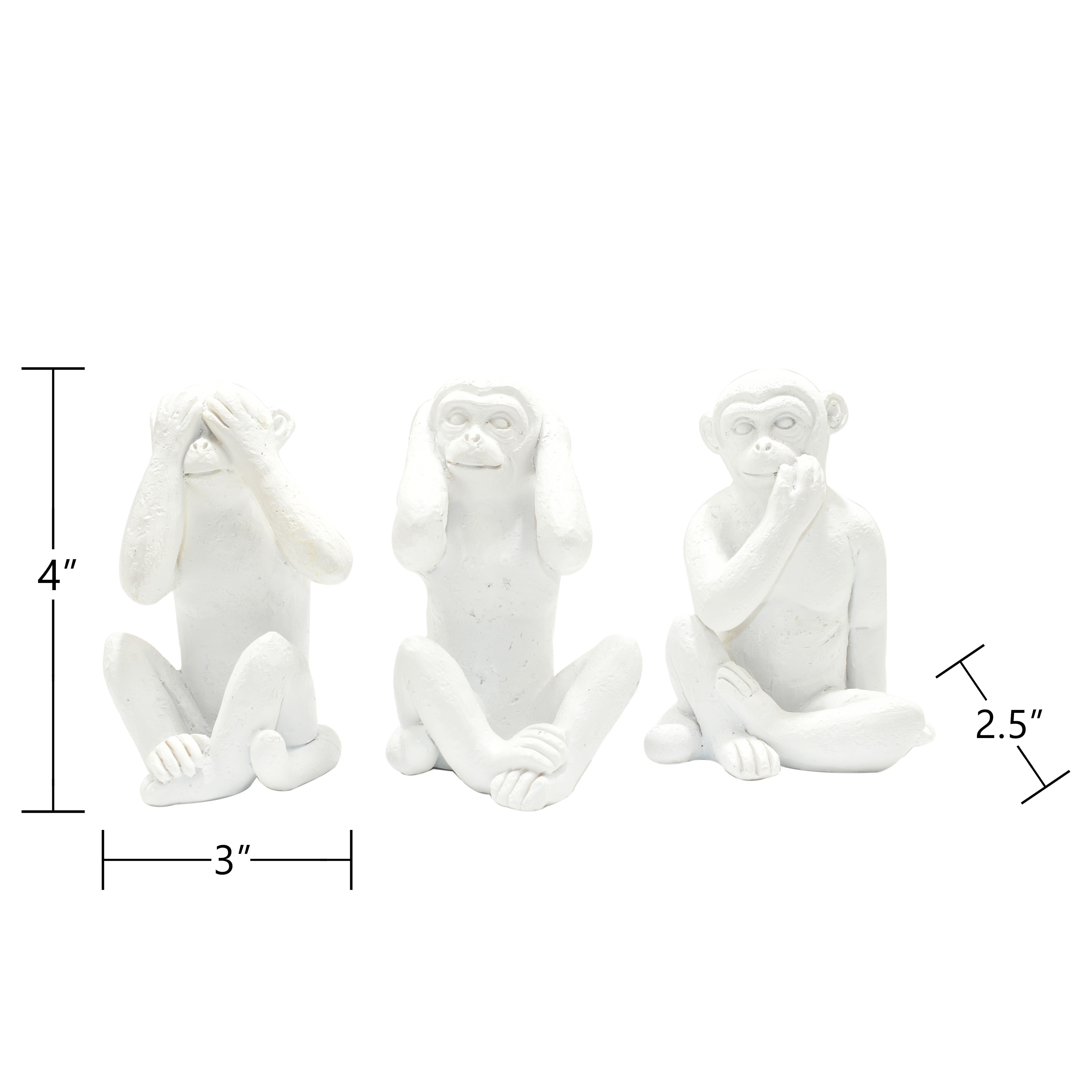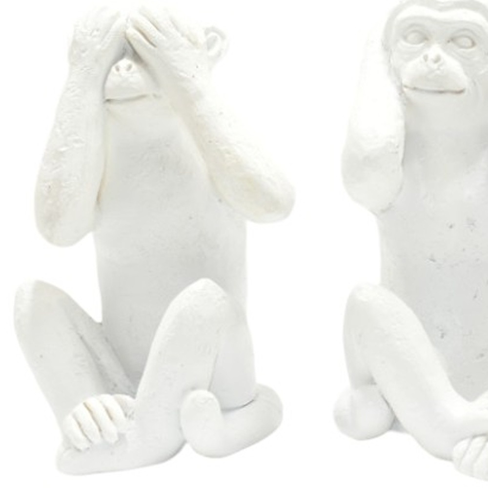 The set of three white resin monkey tabletop sculpture is the perfect decorative accessory for your home. Update your room with this great jungle animal decor. A perfect decorative addition for anyone who loves a stylish look and feel. Crafted from durable resin, this transitional sculpture brings a playful yet sophisticated touch to your space. With three pieces in the set, it creates a captivating focal point on any tabletop or shelf. Elevate your decor with these charming animal figures that embody a sense of whimsy and elegance. 4-inch h x 3-inch w x 2.5-inch d.