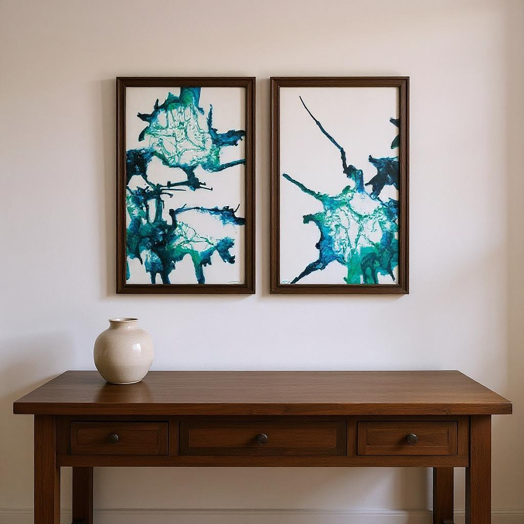 Unique and decorative, this set of two abstract ocean living black framed wall art will leave a lasting impression. This acrylic painting is a way to express your artistic style and add some fashion to your walls. Reproduced for you on paper, this hanging decorative accent will be a trendy and fashionable way to dress your walls. Hang on your wall to add some up to date fashion and decoration. Instantly liven up your space with this art that brings color and dimension to your walls. 14-inch h x 14-inch w x 1-inch d.