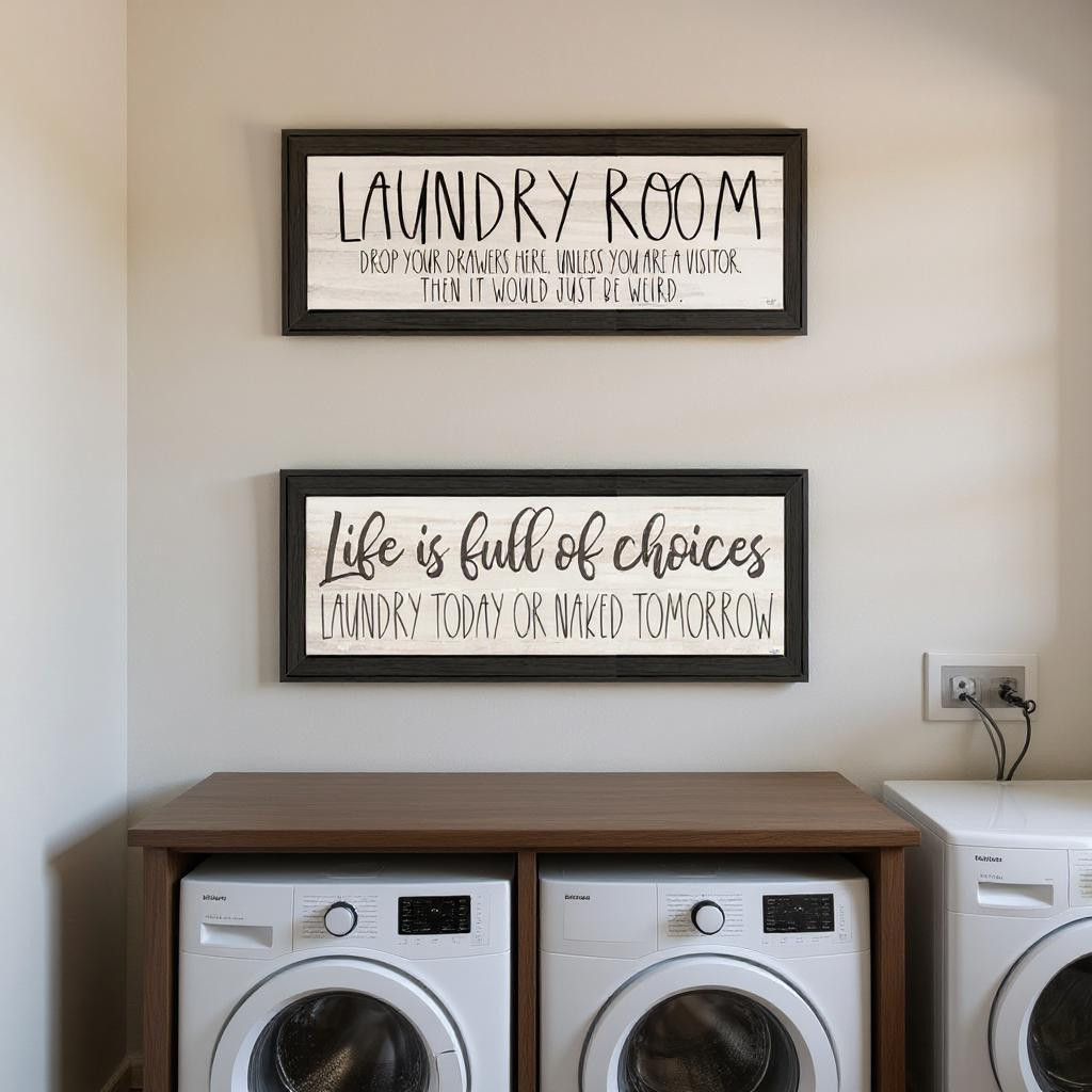 Unique and decorative, this set of two life is full of choices. Laundry today or naked tomorrow. Black framed laundry wall art will leave a lasting impression. This acrylic painting is a way to express your artistic style and add some fashion to your walls. Reproduced for you on paper, this hanging decorative accent will be a trendy and fashionable way to dress your walls. Hang on your wall to add some up to date fashion and decoration. Utilize this opportunity to create a focal point in the room with this fabulous wall decor option. 15-inch h x 39-inch w x 1-inch d.