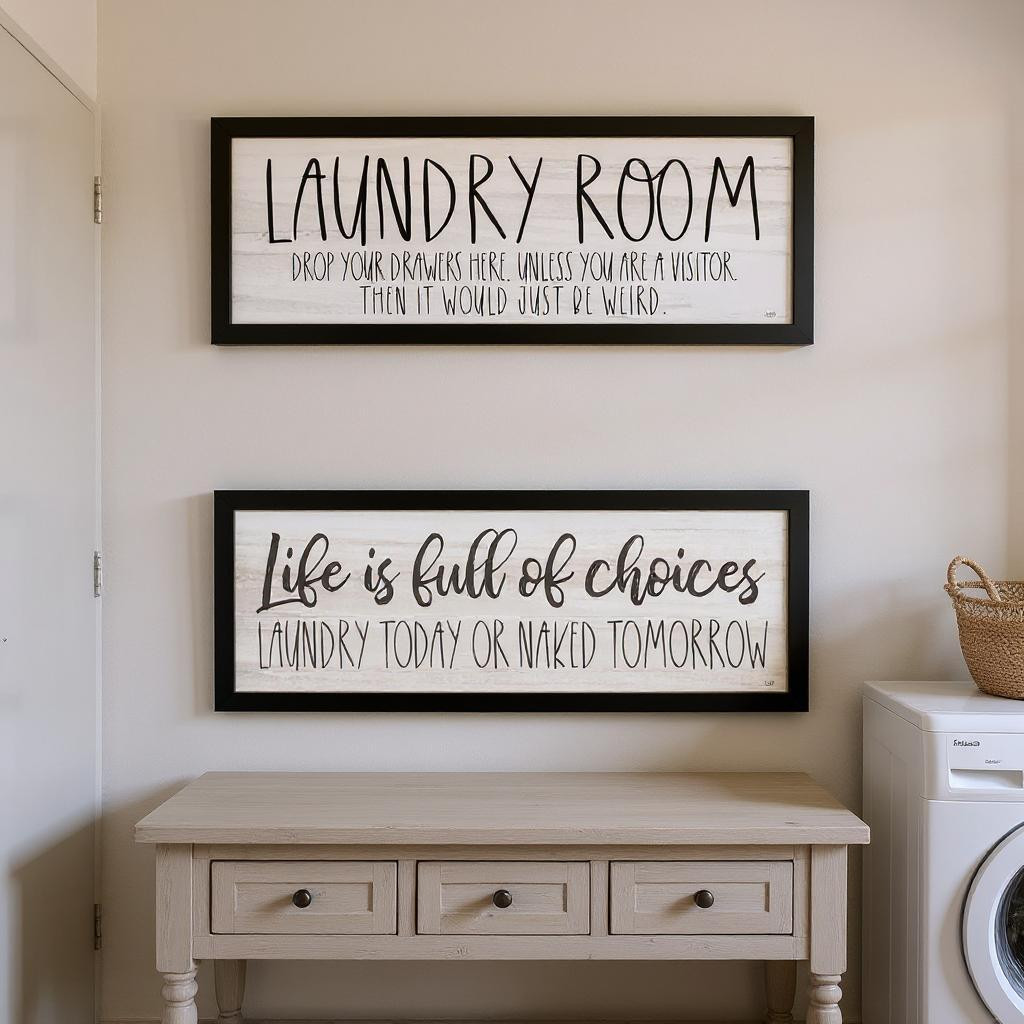 The set of two life is full of choices. Laundry today or naked tomorrow. Black framed laundry wall art is the perfect decorative accessory for your home. This acrylic painting is a way to express your artistic style and add some fashion to your walls. Reproduced for you on paper, this hanging decorative accent will be a trendy and fashionable way to dress your walls. Hang on your wall to add some up to date fashion and decoration. Utilize this opportunity to create a focal point in the room with this fabulous wall decor option. 15-inch h x 39-inch w x 1-inch d.
