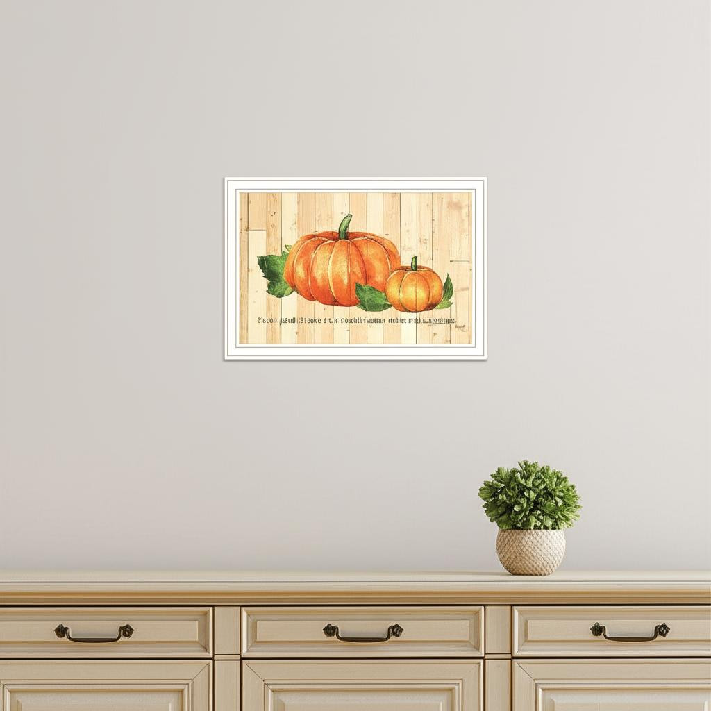 Bring some sizzle to your space with this eye-catching set of two happy fall-october pumpkins white framed wall art. This acrylic painting is a way to express your artistic style and add some fashion to your walls. Reproduced for you on paper, this hanging decorative accent will be a trendy and fashionable way to dress your walls. Hang on your wall to add some up to date fashion and decoration. Instantly liven up your space with this art that brings color and dimension to your walls. 14-inch h x 20-inch w x 1-inch d.
