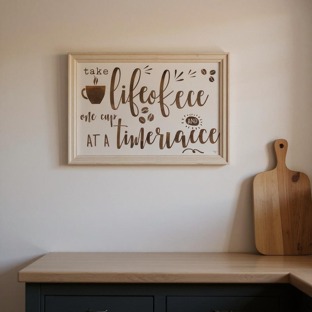 The set of two one cup at a time. Black framed kitchen wall art is the perfect decorative accessory for your home. This acrylic painting is a way to express your artistic style and add some fashion to your walls. Reproduced for you on paper, this hanging decorative accent will be a trendy and fashionable way to dress your walls. Hang on your wall to add some up to date fashion and decoration. Instantly liven up your space with this art that brings color and dimension to your walls. 14-inch h x 14-inch w x 1-inch d.
