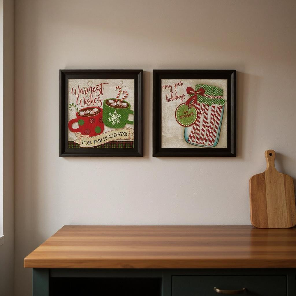 Unique and decorative, this set of two hot cocoa and candy canes black framed kitchen wall art will leave a lasting impression. This acrylic painting is a way to express your artistic style and add some fashion to your walls. Reproduced for you on paper, this hanging decorative accent will be a trendy and fashionable way to dress your walls. Hang on your wall to add some up to date fashion and decoration. Utilize this opportunity to create a focal point in the room with this fabulous wall decor option. 14-inch h x 14-inch w x 1-inch d.