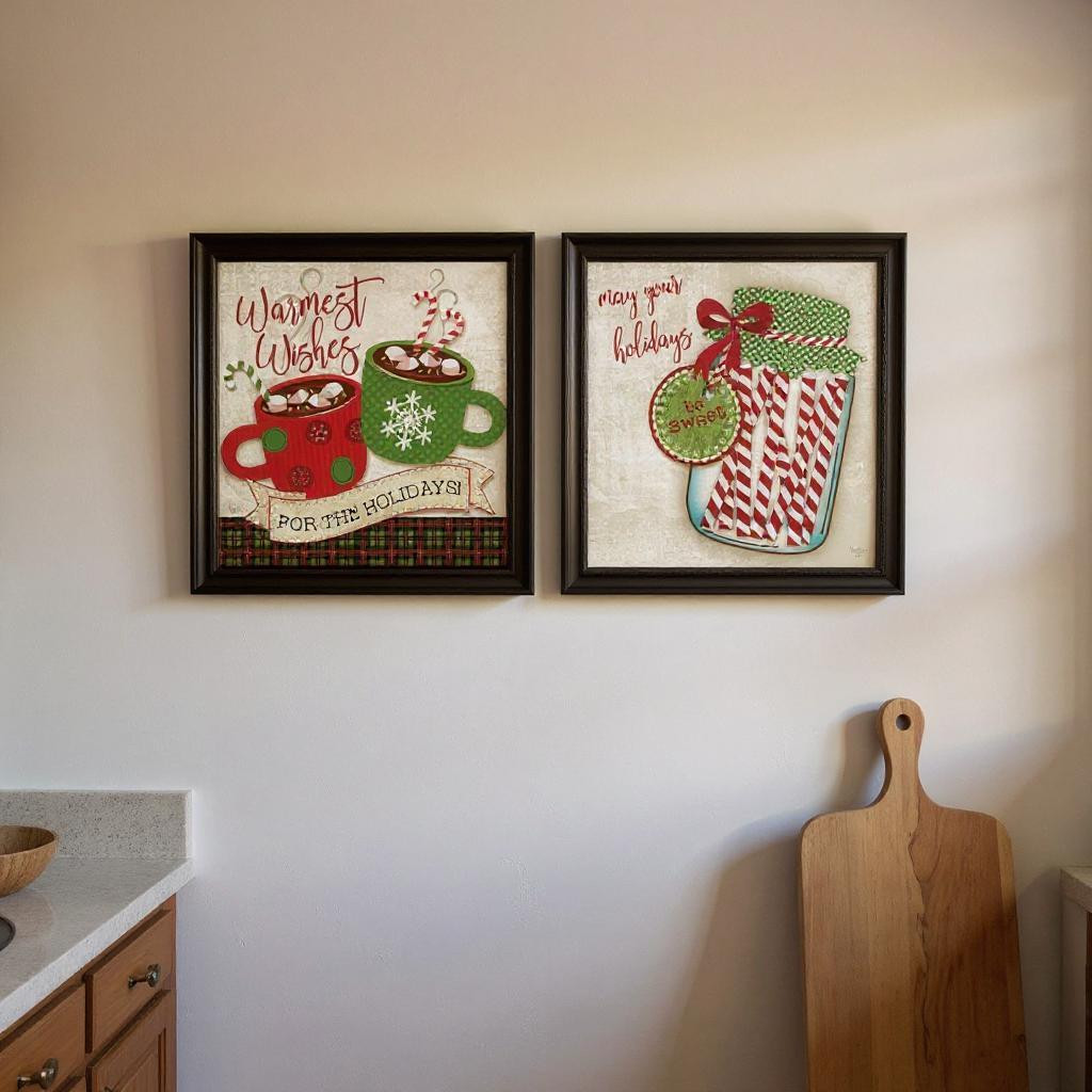 Bring some sizzle to your space with this eye-catching set of two hot cocoa and candy canes black framed kitchen wall art. This acrylic painting is a way to express your artistic style and add some fashion to your walls. Reproduced for you on paper, this hanging decorative accent will be a trendy and fashionable way to dress your walls. Adding this hanging wall art to your space to make your room feel more finished and attractive. Instantly liven up your space with this art that brings color and dimension to your walls. 14-inch h x 14-inch w x 1-inch d.