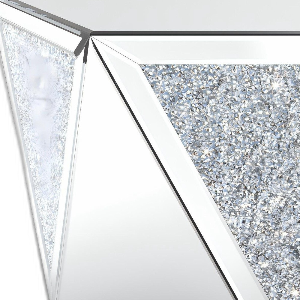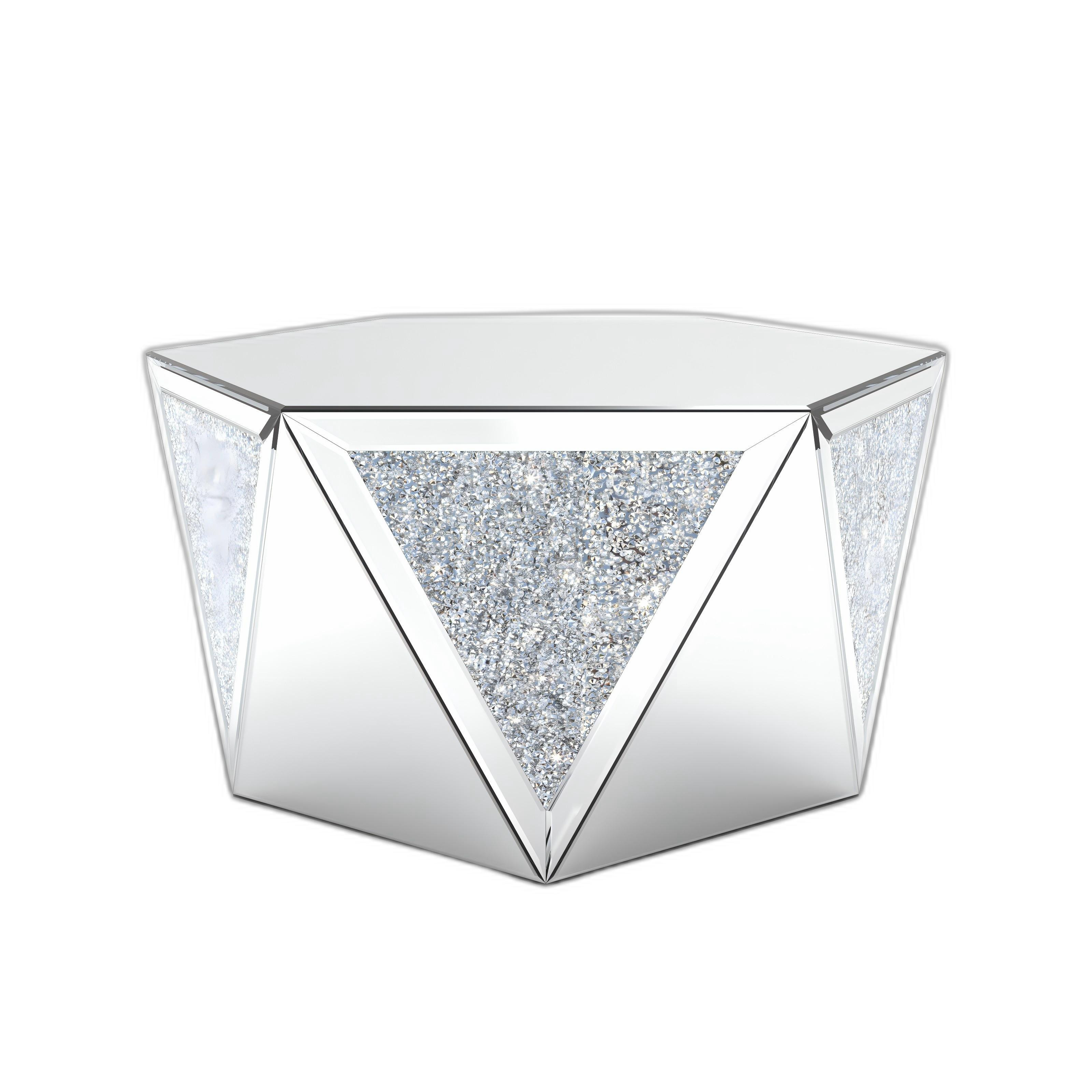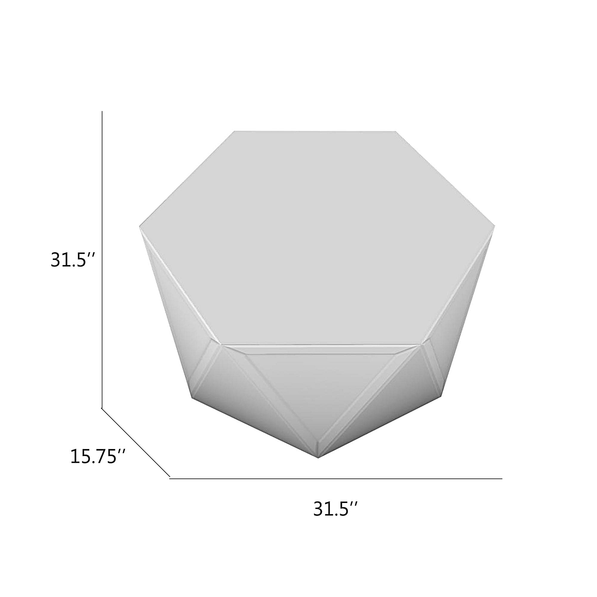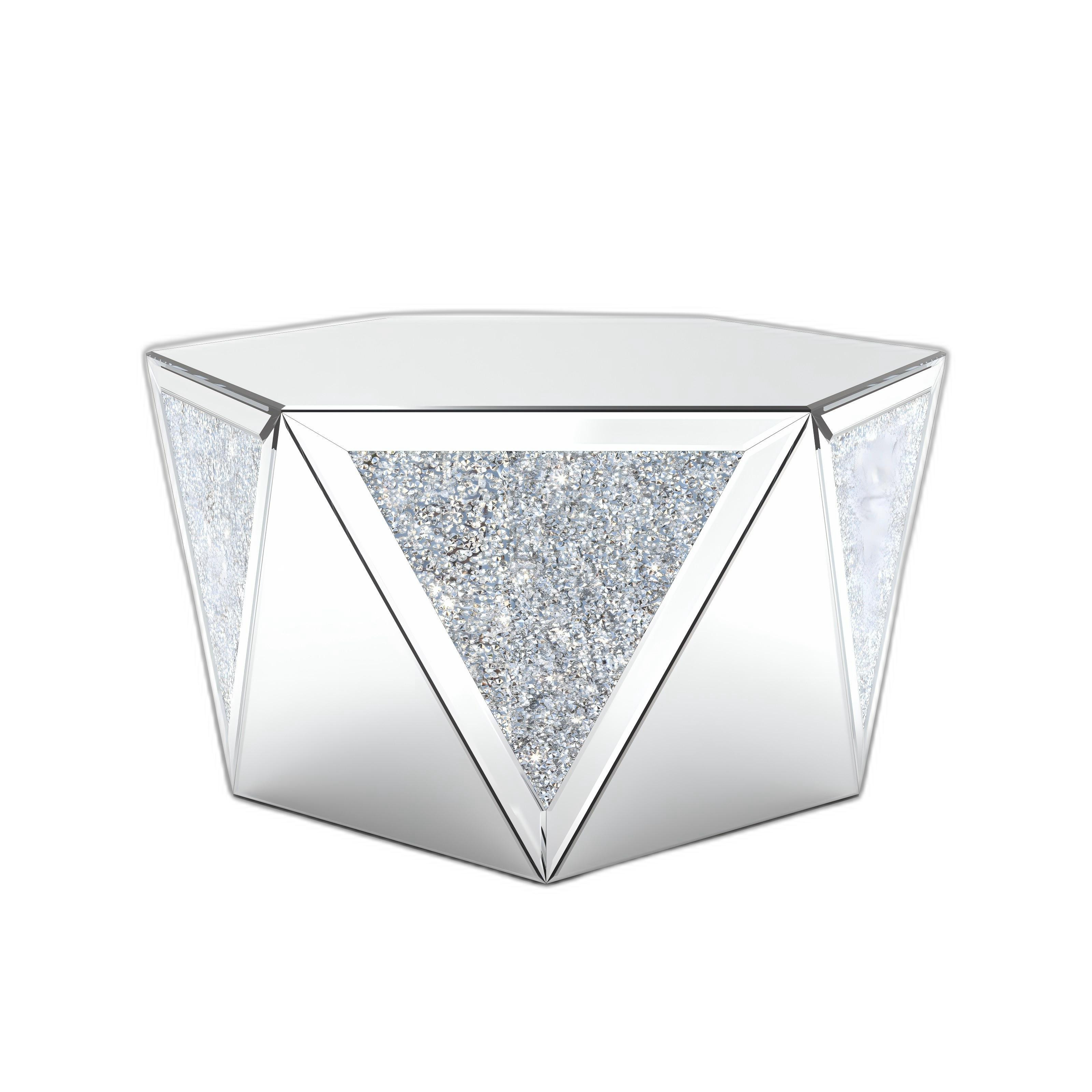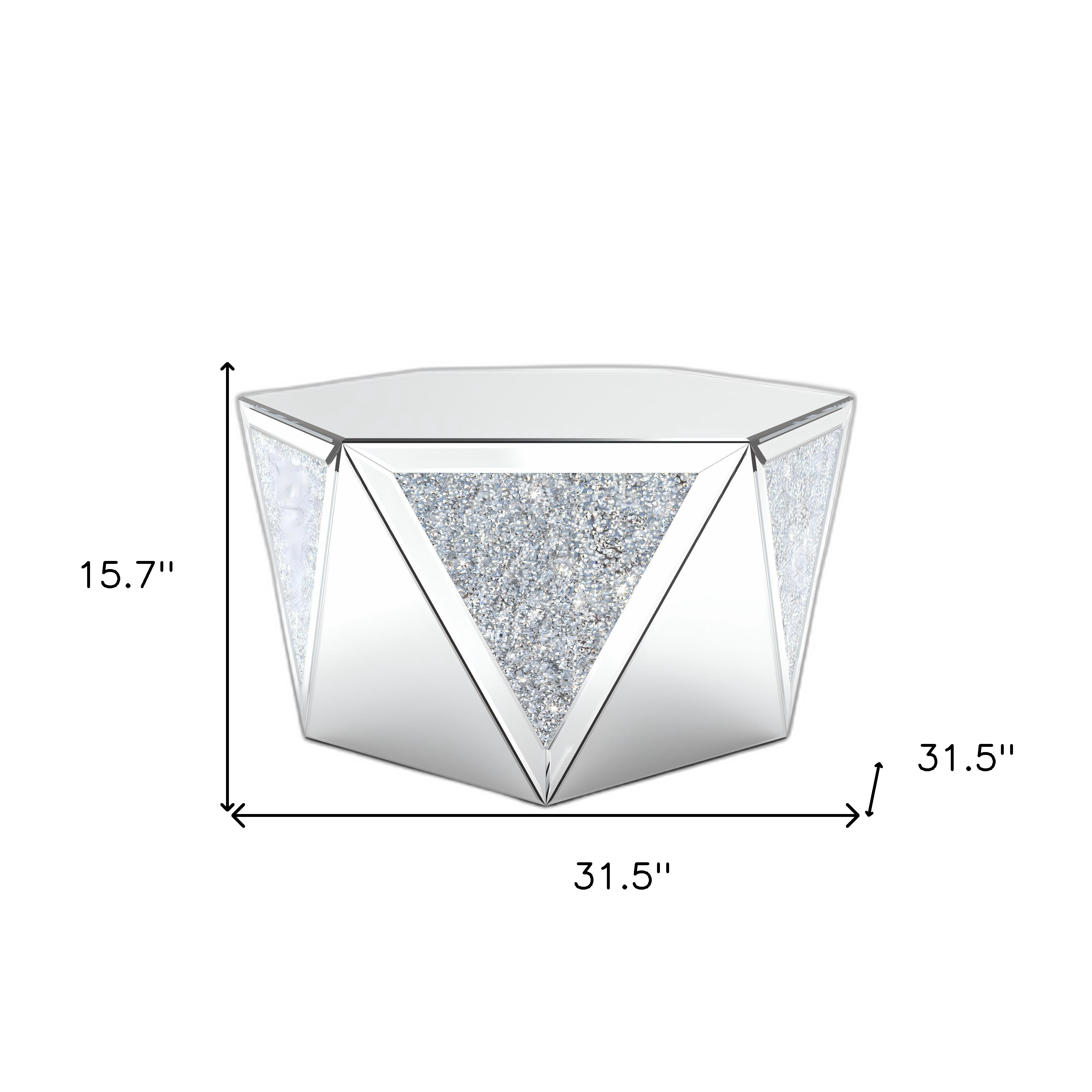 Add handsome, fashionable design to your living space with this 32-inch silver mirrored glass and faux crystal hexagon drum coffee table. This table features a unique shape with a touch of glam lux styling. Reflective pieces of mirrored glass and faux crystals give this table a glamorous and glitzy look. It has an attractive design that will definitely breathe some fresh air into your interior. 15.70-inch h x 31.50-inch w x 31.50-inch d.