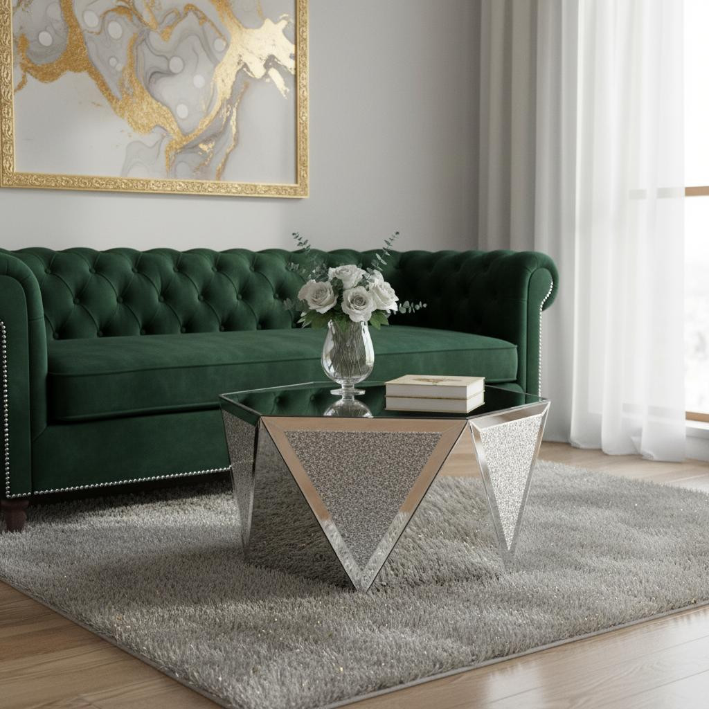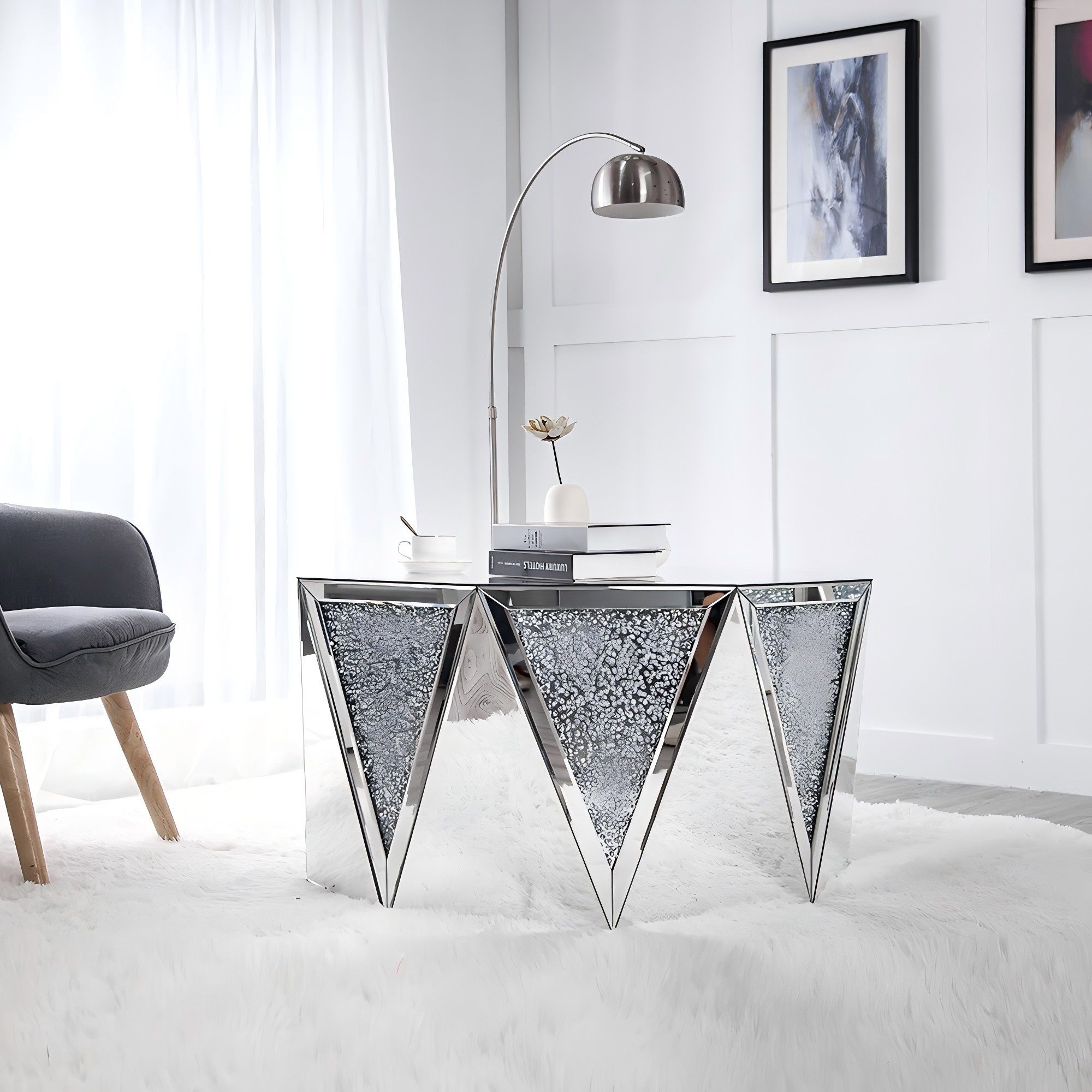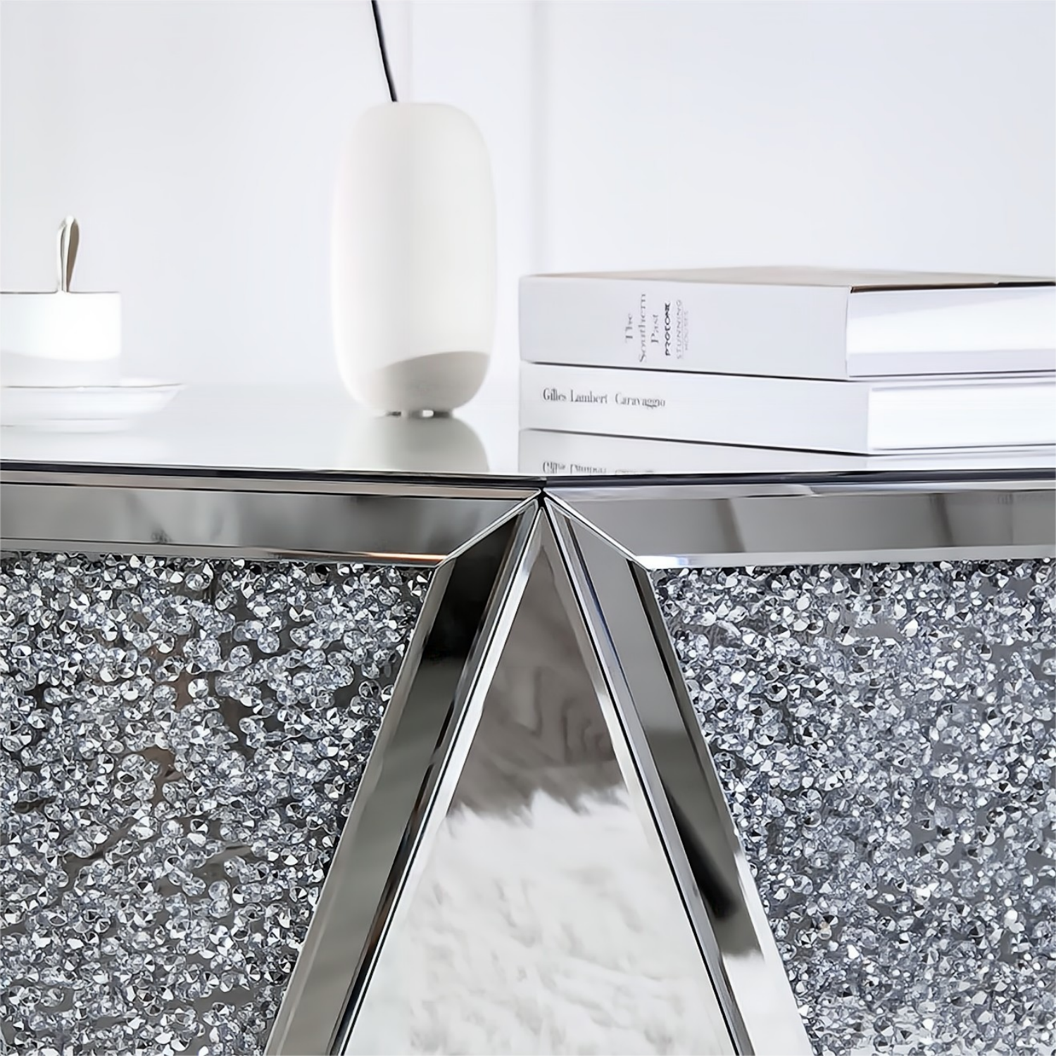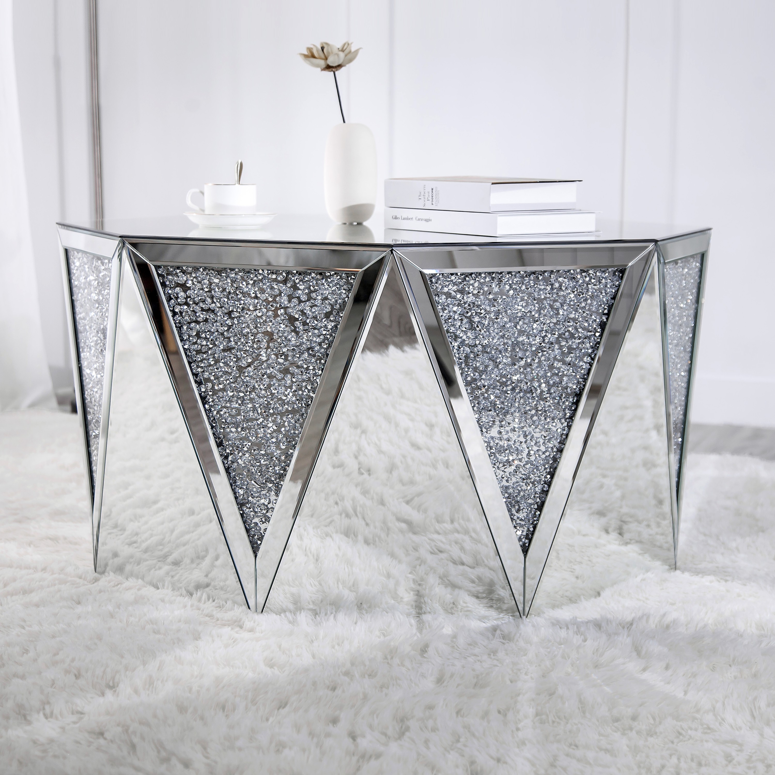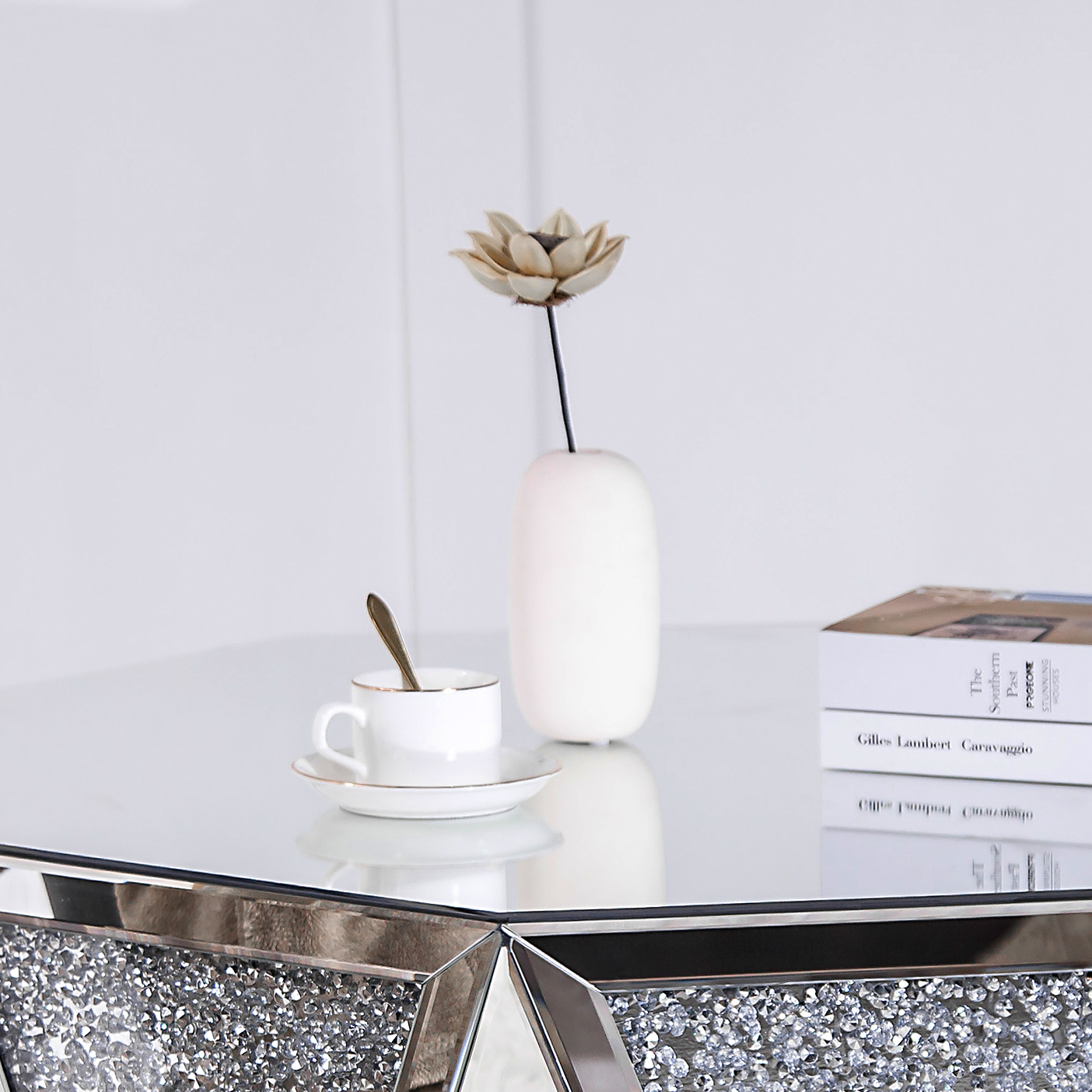 Add handsome, fashionable design to your living space with this 32-inch silver mirrored glass and faux crystal hexagon drum coffee table. This table features a unique shape with a touch of glam lux styling. Reflective pieces of mirrored glass and faux crystals give this table a glamorous and glitzy look. It has an attractive design that will definitely breathe some fresh air into your interior. 15.70-inch h x 31.50-inch w x 31.50-inch d.