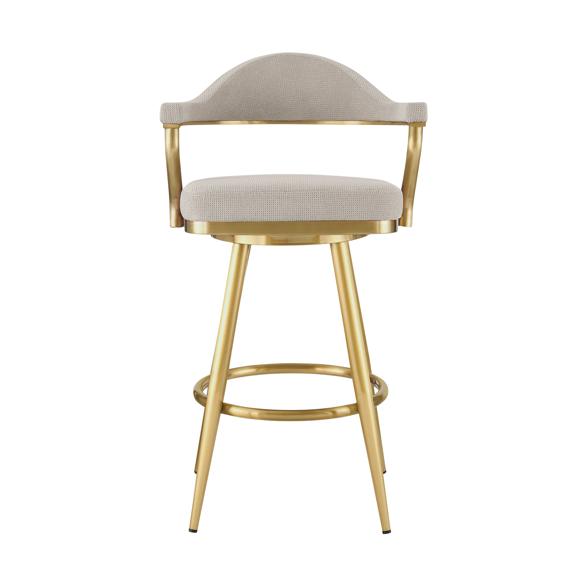 With this 26-inch taupe and gold fabric and stainless steel counter height swivel bar chair you can add design and extra seating to your space. The base of this stool is made from stainless steel in a gold color that is a nice contrast to the taupe fabric seat. The bucket shape of the seat combines with a low back to give this chair a comfortable and fashionable look. The armchair design gives you a great place to comfortably rest your arms. 37-inch H x 22-inch W x 23-inch D