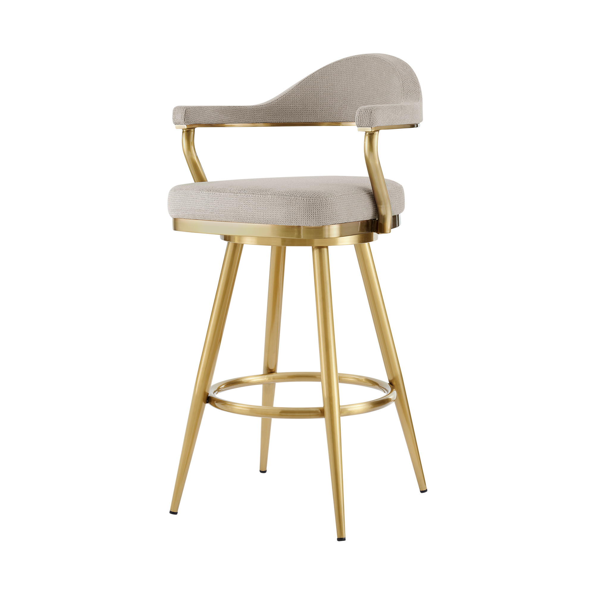 Bring a trendy bar vibe to your space, with this 30-inch taupe and gold fabric and stainless steel bar height swivel bar chair. The base of this stool is made from stainless steel in a gold color that is a nice contrast to the taupe fabric seat. Not only good looking and stylish, this chair features a square shaped seat and a low back for the ultimate in comfort and enjoyment. The armchair design gives you a great place to comfortably rest your arms. 41-inch H x 22-inch W x 23-inch D