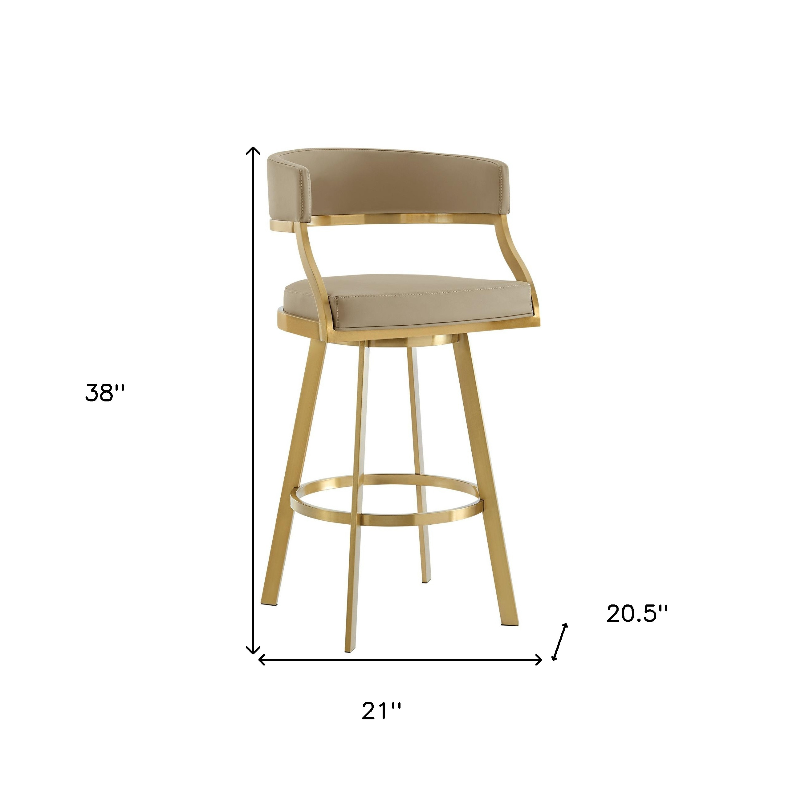 With this 26-inch sand and gold faux leather and stainless steel low back counter height swivel bar chair you can add design and extra seating to your space. The gold coloration of the high quality stainless steel base marries nicely with the sand faux leather seat. Designed with armrests for your comfort, this chair also features a footrest for comfort and convenience. Not only good looking and stylish, this chair features a square shaped seat and a low back for the ultimate in comfort and enjoyment. 38.00-inch h x 21.00-inch w x 20.50-inch d.