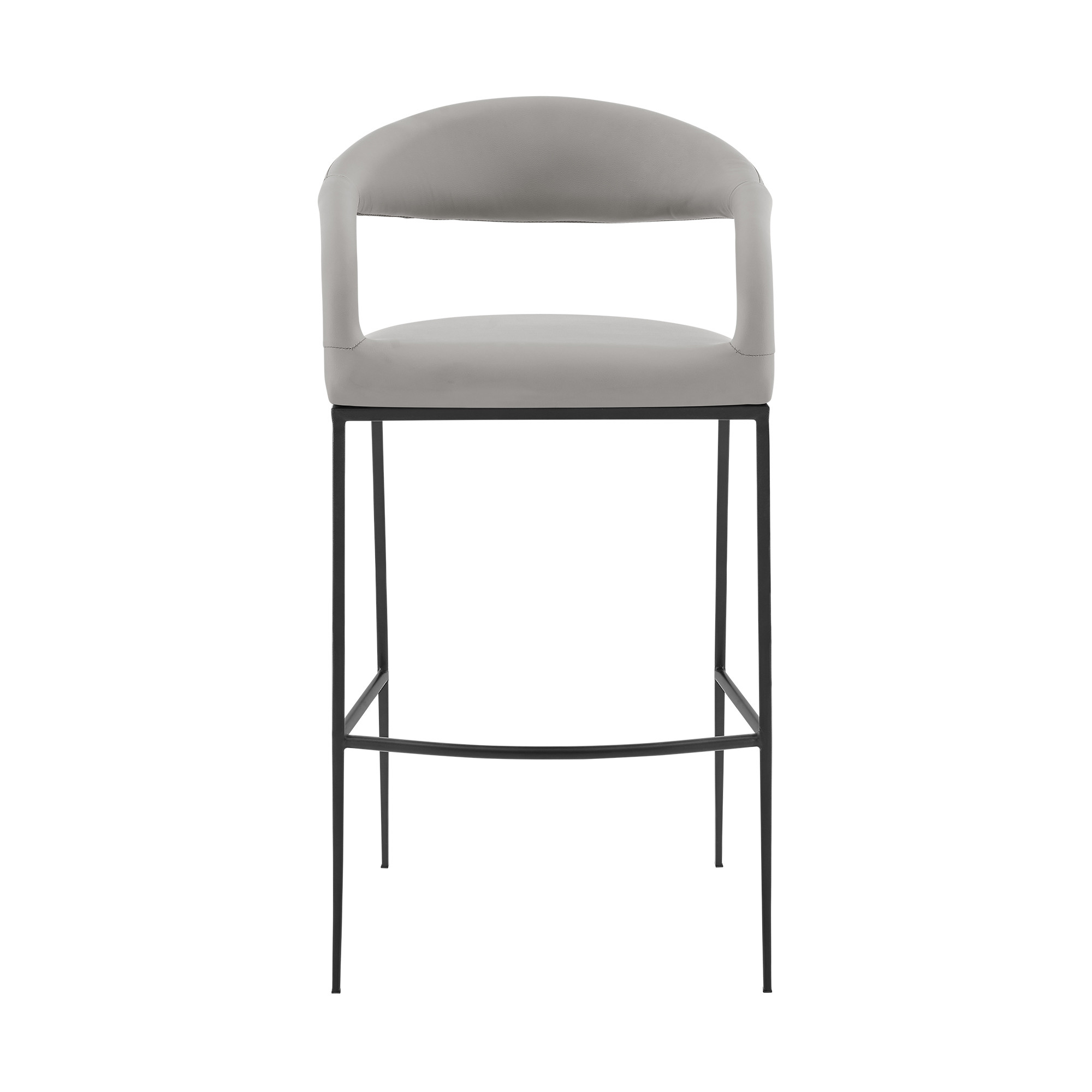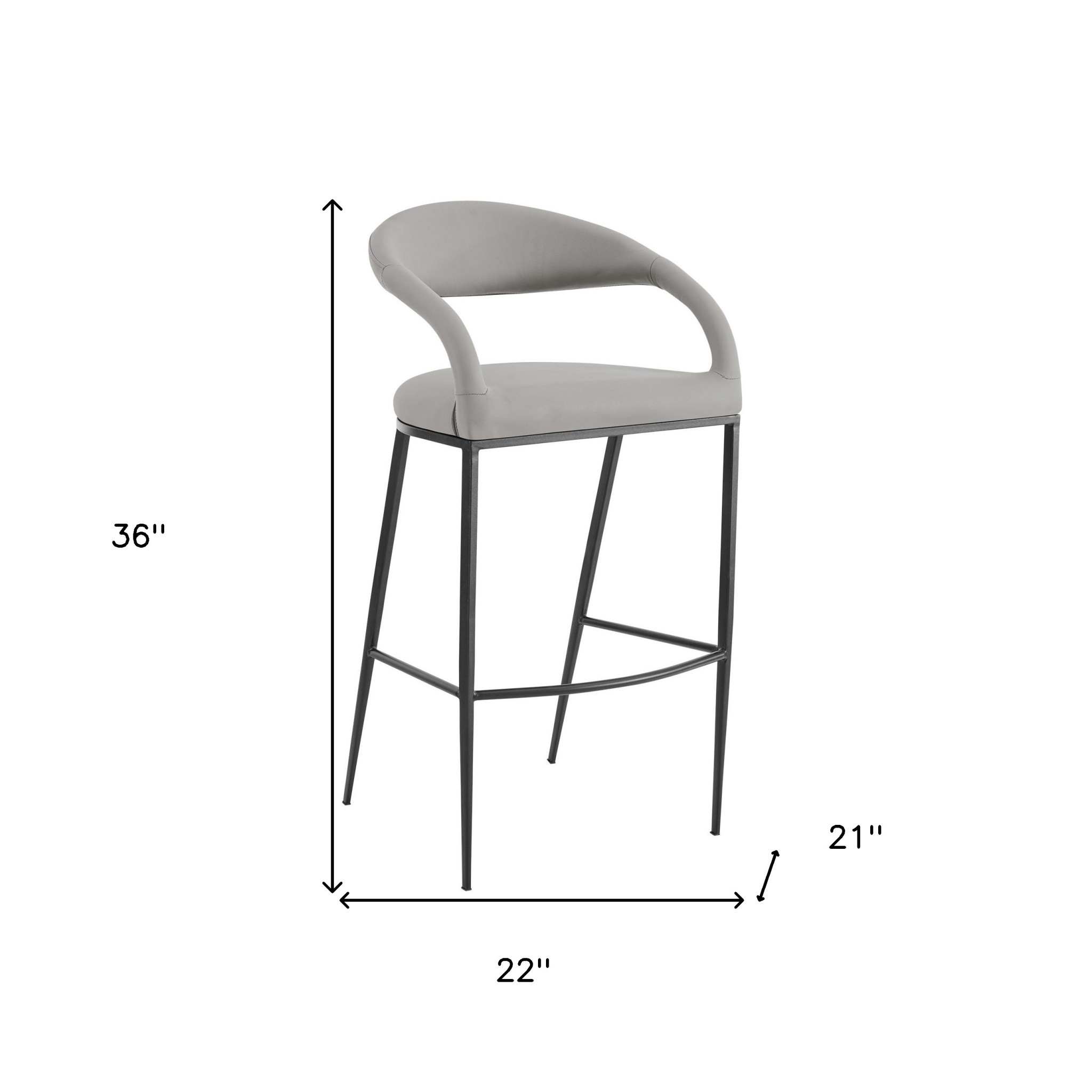 Bring a trendy bar vibe to your space, with this 26-inch light gray and black faux leather and iron low back counter height bar chair. The black coloration of the high quality iron base marries nicely with the light gray faux leather seat. The bucket shape of the seat combines with a low back to give this chair a comfortable and fashionable look. The armchair design gives you a great place to comfortably rest your arms. 36-inch H x 21-inch W x 22-inch D