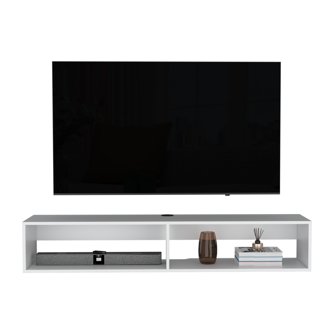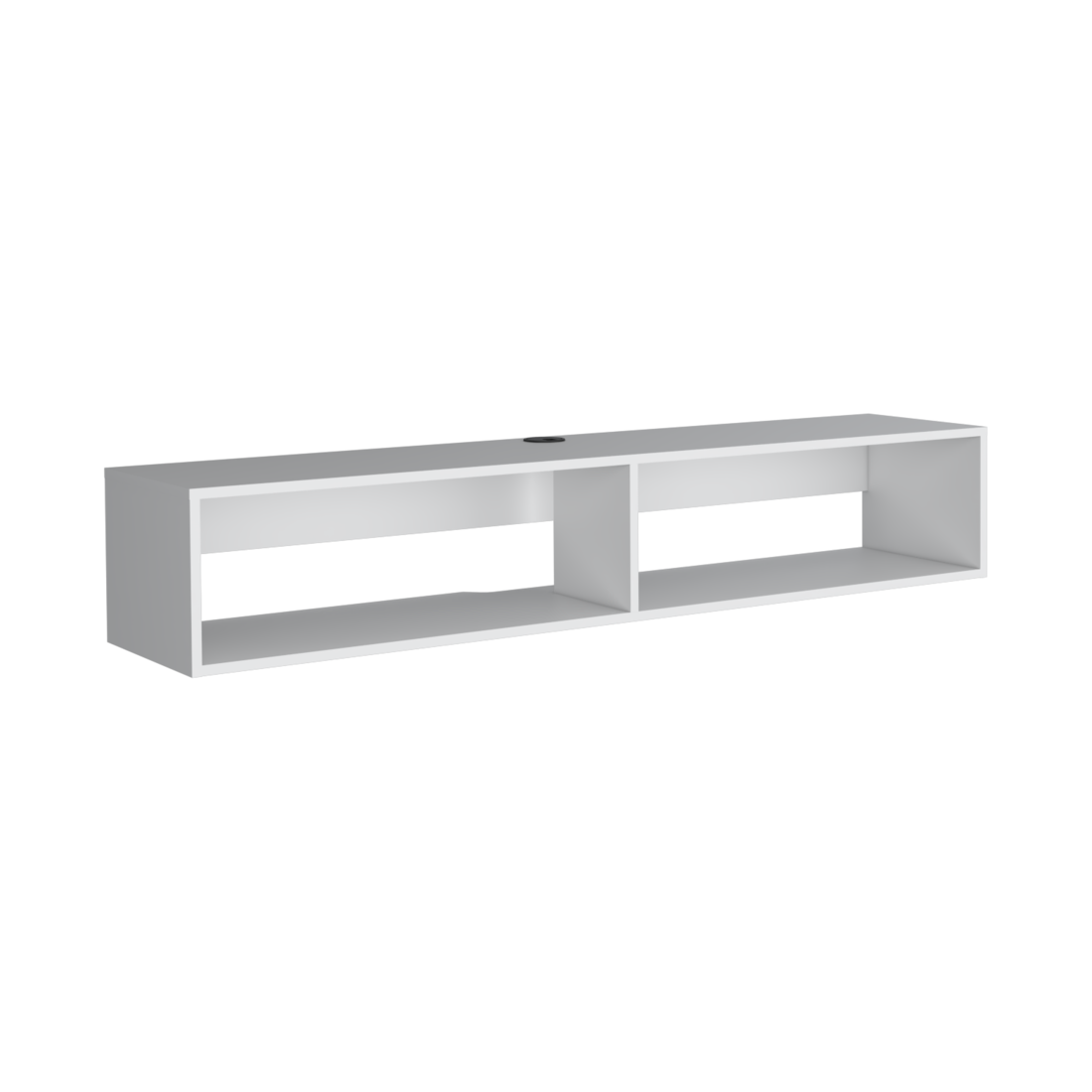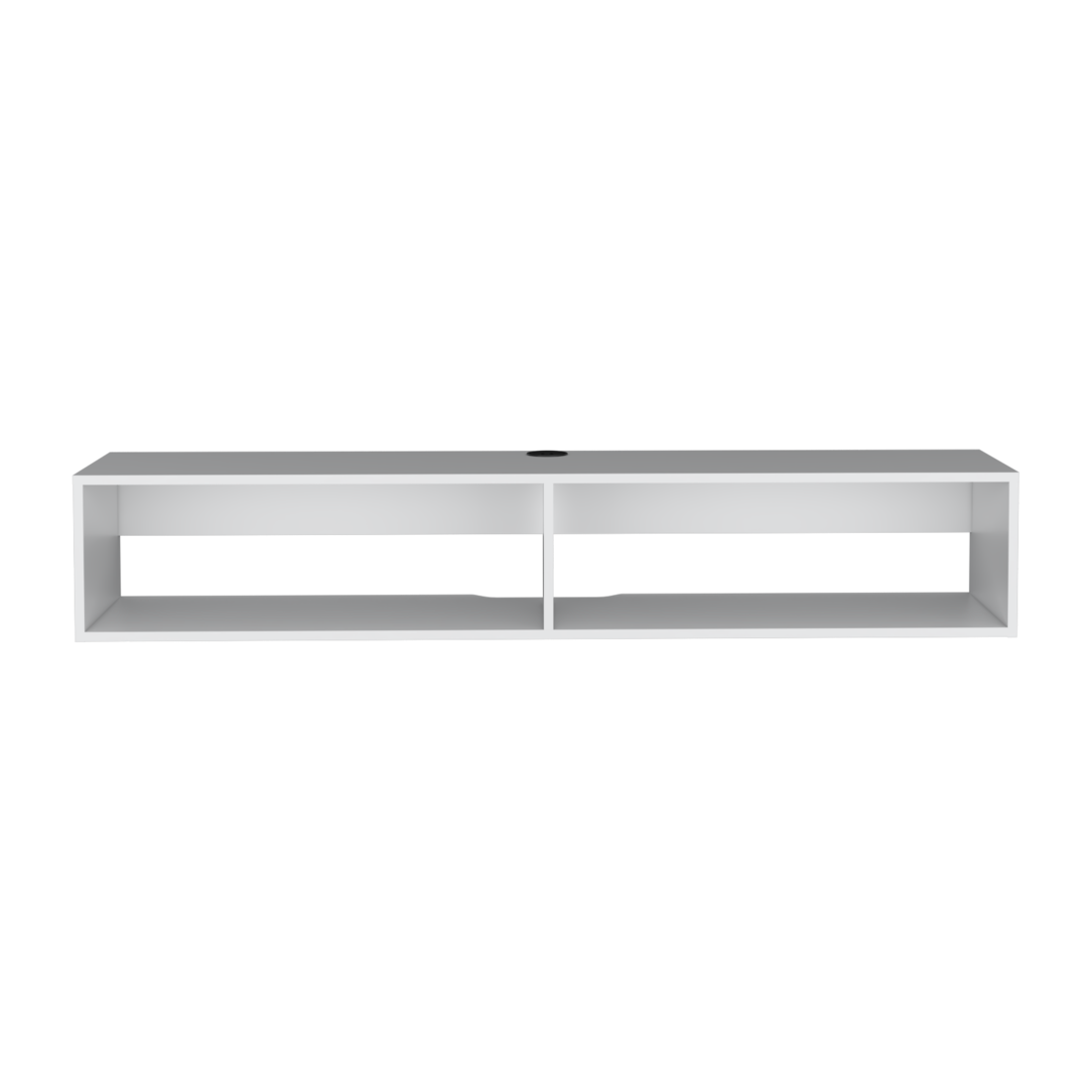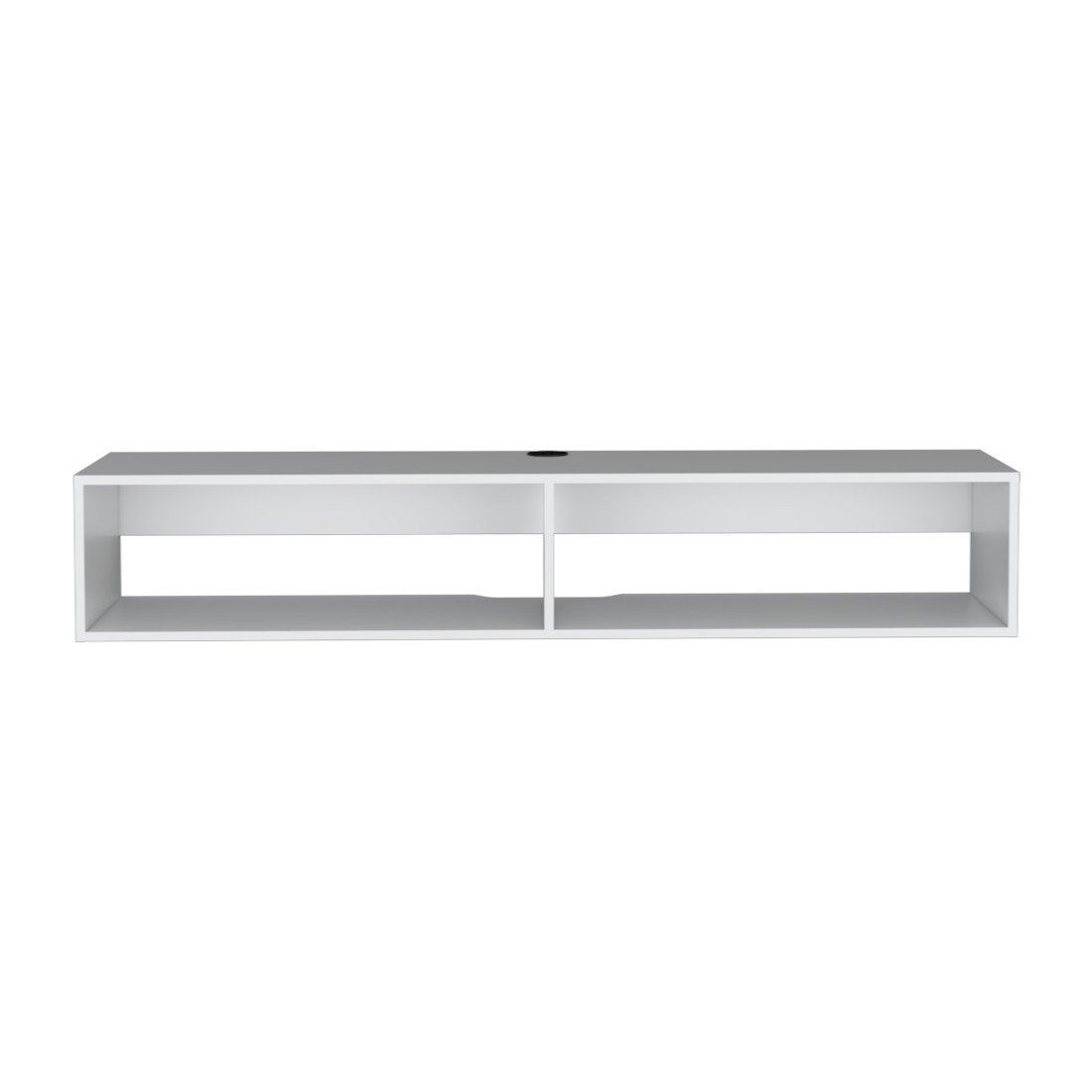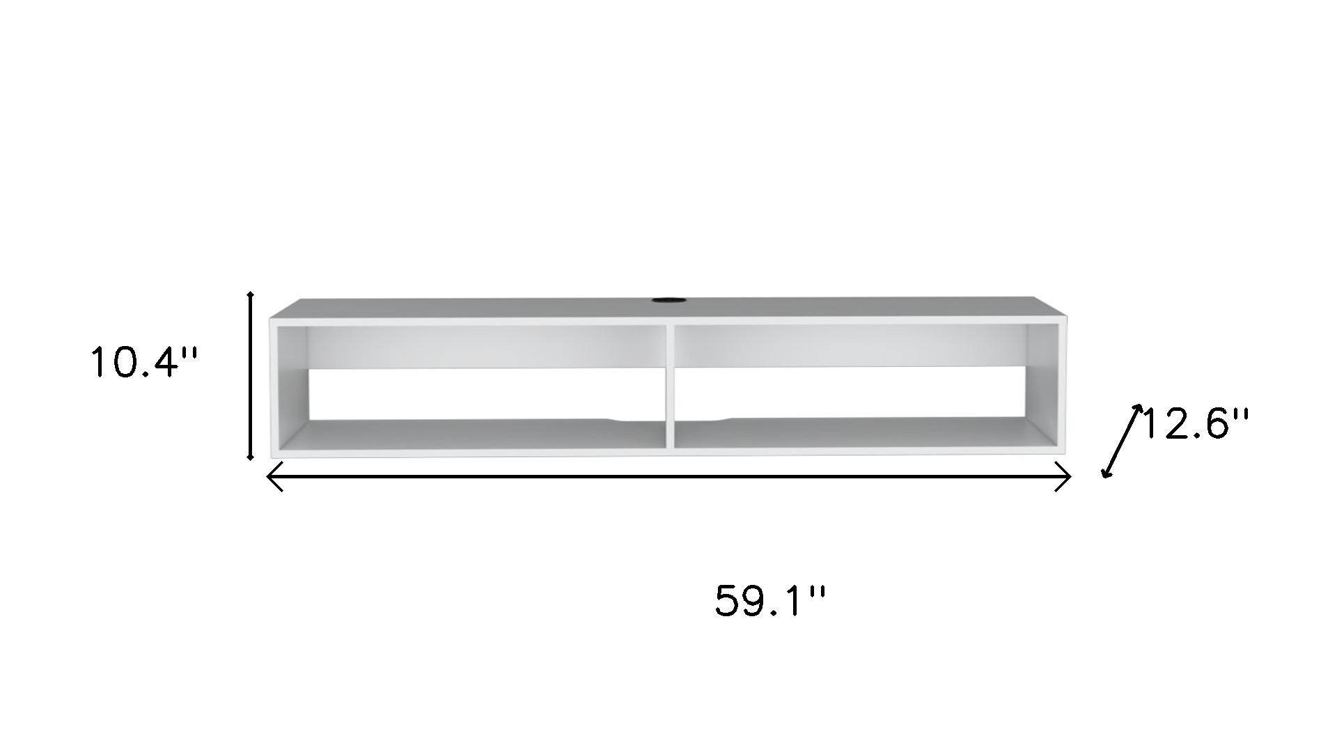 Experience entertainment right in the comfort of your own home with the 59-inch white floating mount tv stand. To add to the versatility, this piece features open non-concealed storage that can be used for not only storage but display as well. A cord cut out hole is ideal for wire and cable managment to keep your space looking tidy. Ideal for tv placement and storage in your living room, bedroom or office. 10.4-inch H x 59.1-inch W x 12.6-inch D