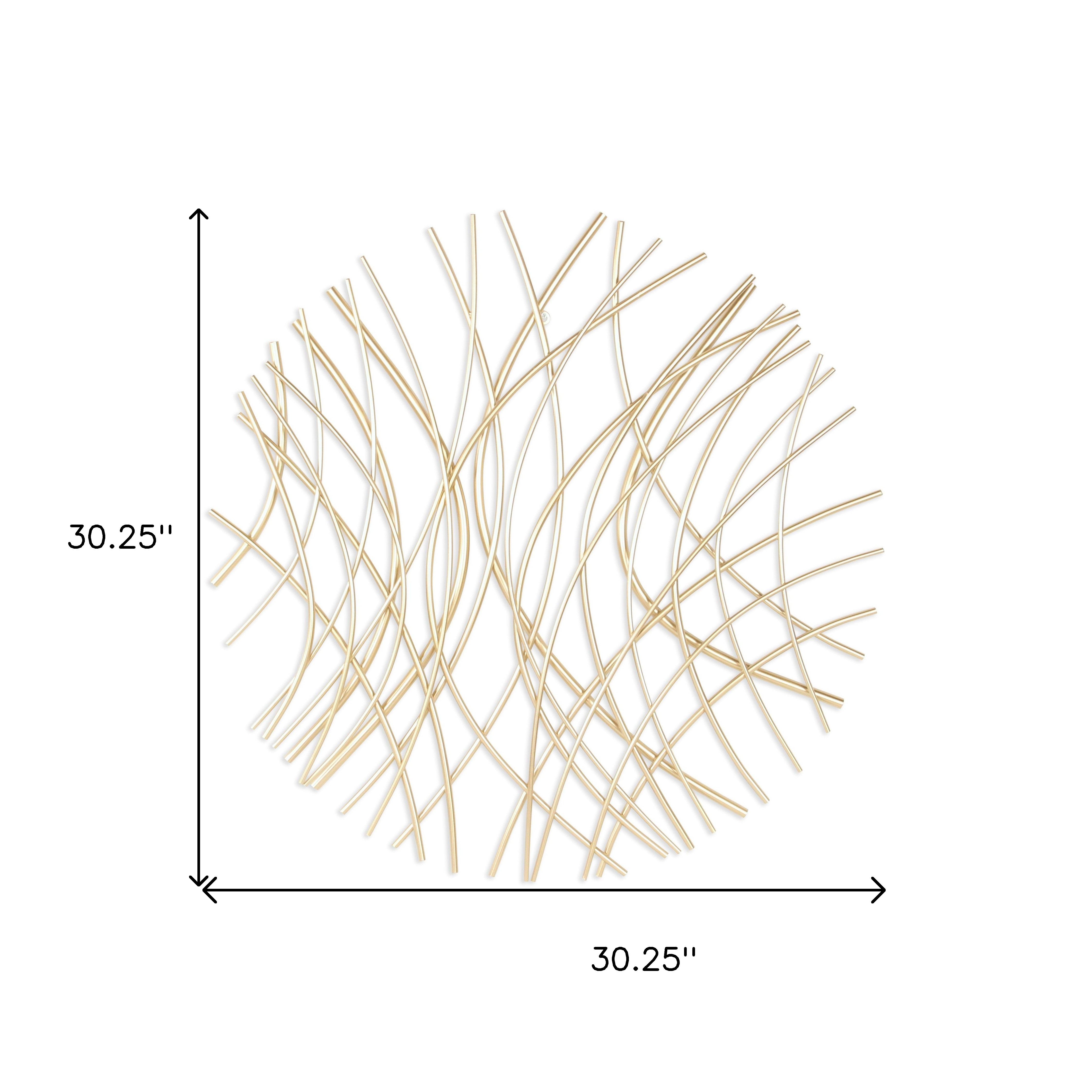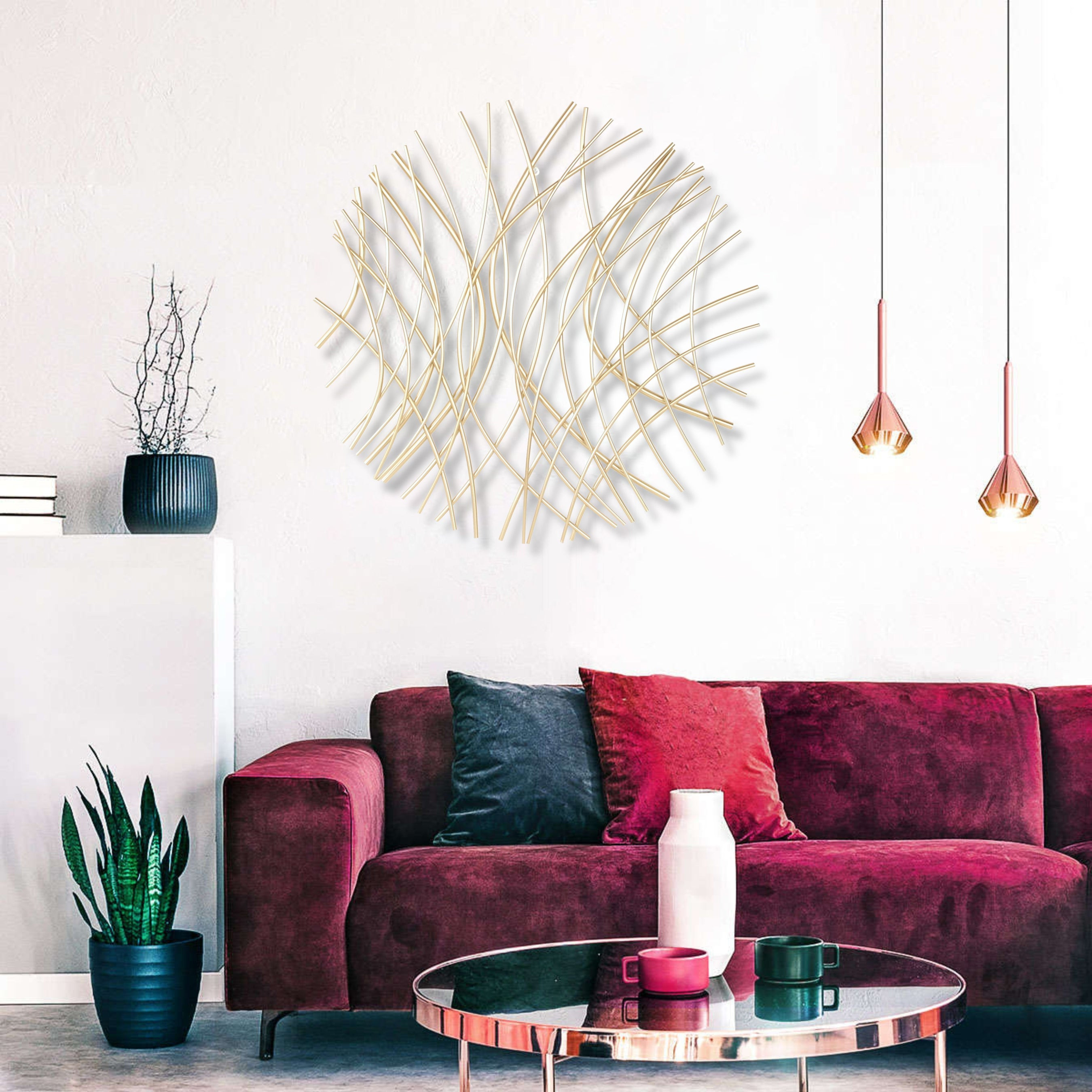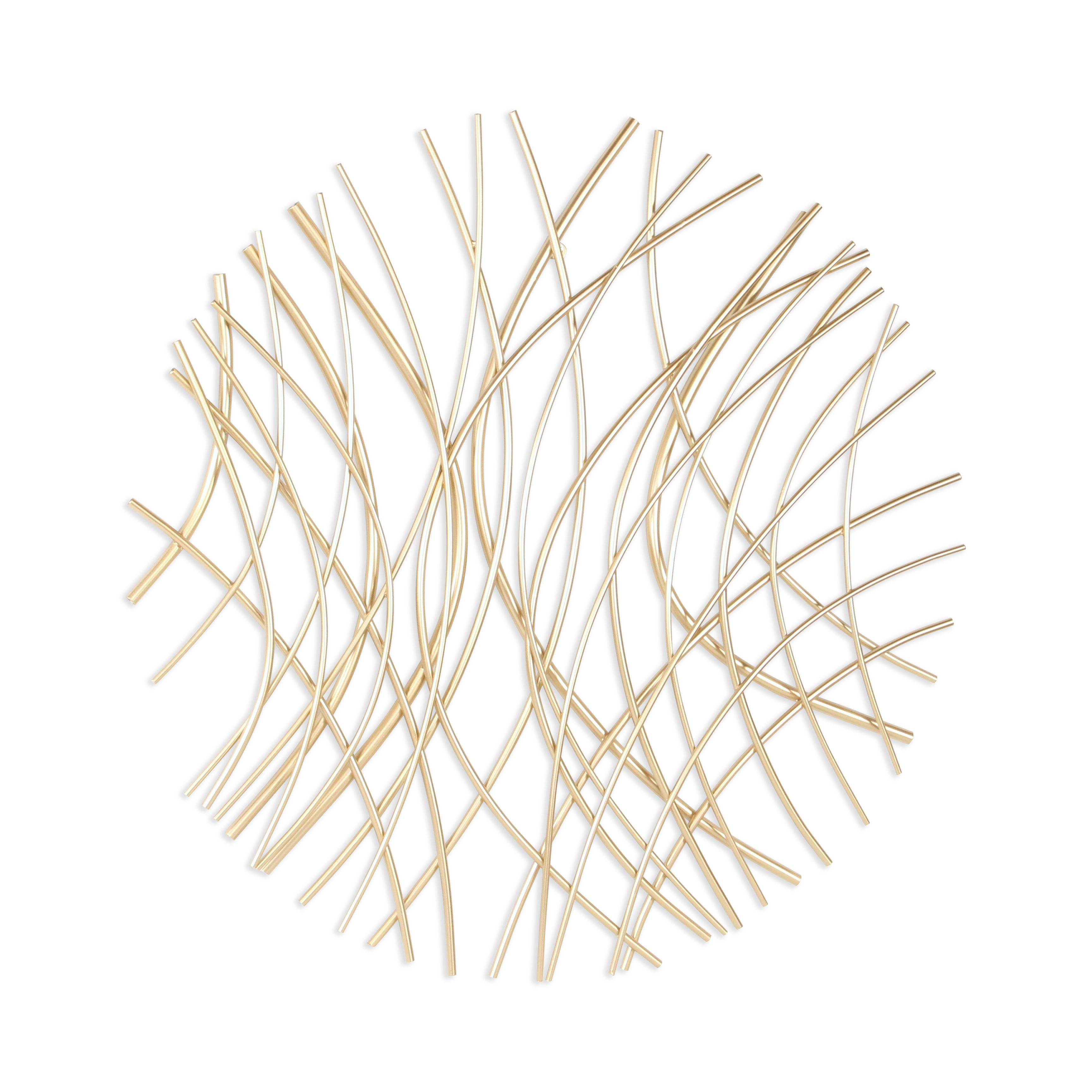 Add an air of fashion to your room and rejuvenate the space with this 30-inch x 30-inch gold metal circle abstract hanging dimensional sculpture. Easily create a focal point in your room with this large, circular shaped modern decor that features a unique and abstract design. Handmade with care, this piece brings some authenticity to your surroundings. Instantly liven up your space with this art that brings color and dimension to your walls. 30.25-inch h x 30.25-inch w x 1.25-inch d.