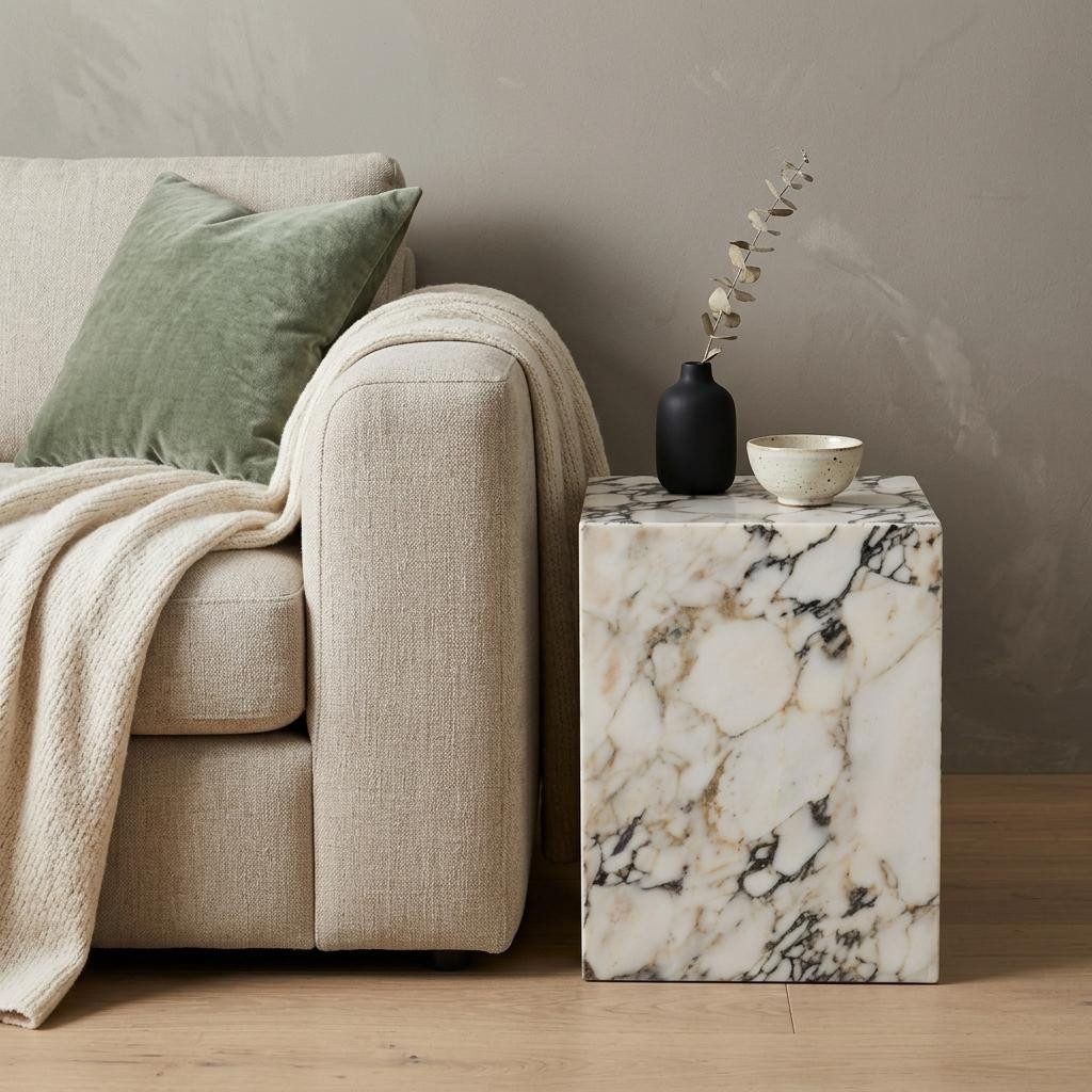 Show off your exquisite taste with this 20-inch ivory marble and wood square block end table. The ivory coloration runs throughout this good looking manufactured wood and marble table. A great accent on either side of the sofa or bed, this adorable end or side table is just what you need. This versatile table is a great accent for most any room. 20-inch h x 15-inch w x 15-inch d.
