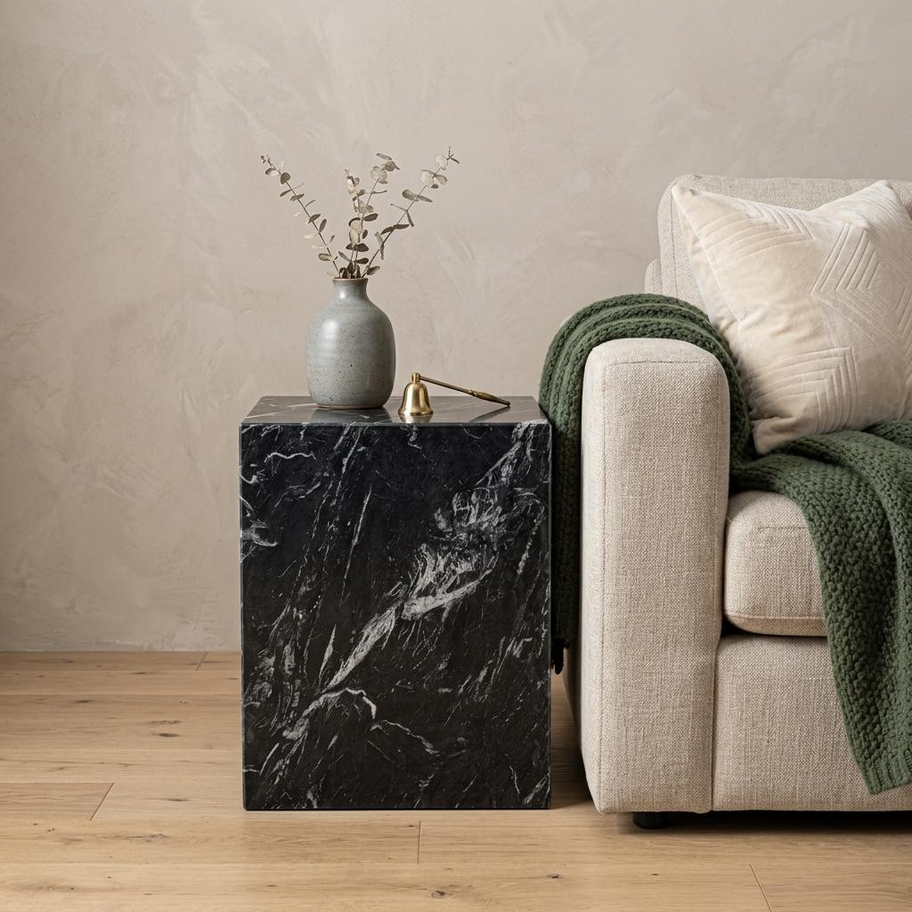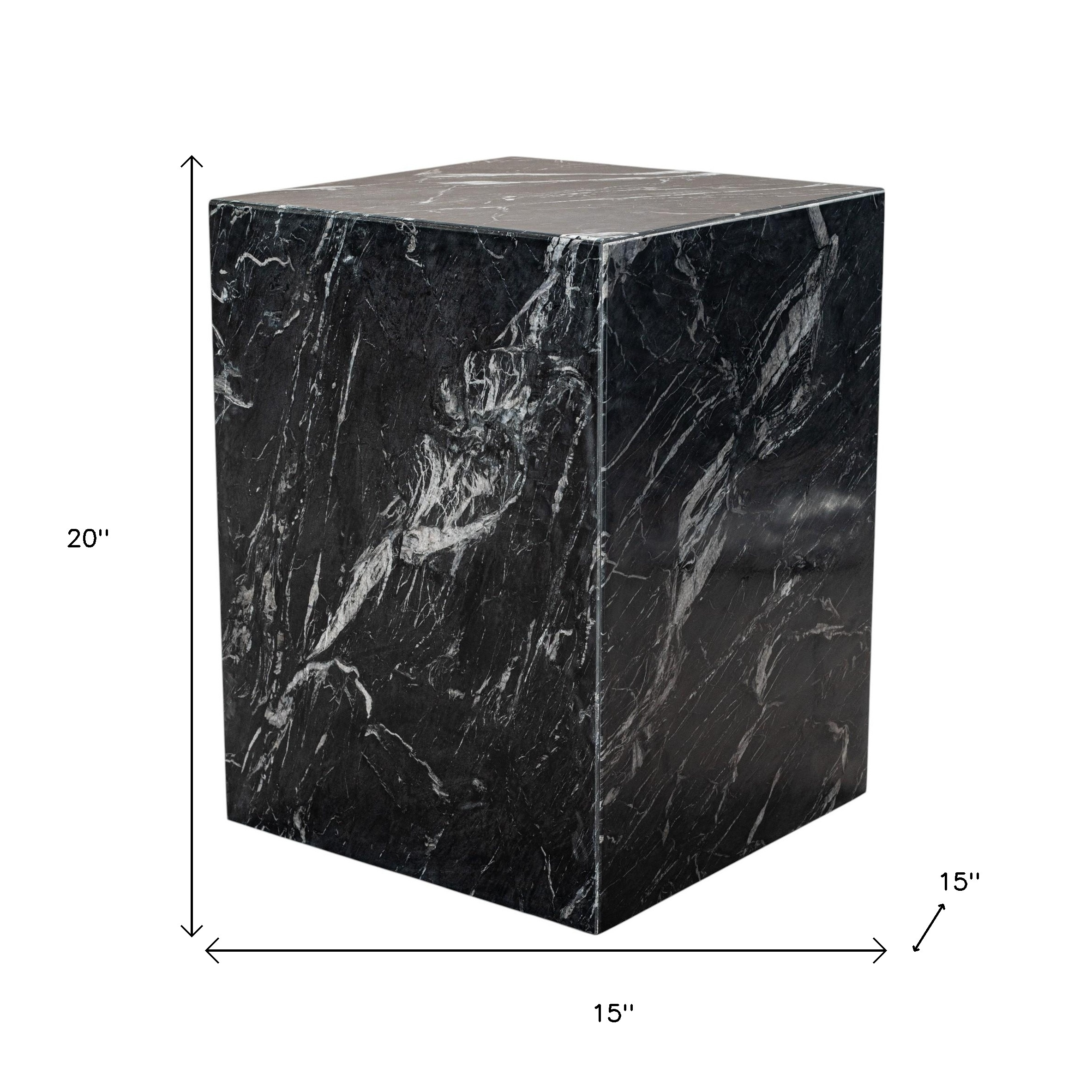 Show off your exquisite taste with this 20-inch black marble square block end table. Genuine sleek black marble covers a sturdy manufactured wood base to give this table a modern chic, fresh and updated look. An ideal location for placing your snacks and drinks, and a place to keep your lamp, frames, or other accessories. You can also use it as an entryway table to hold your keys. 20-inch h x 15-inch w x 15-inch d.