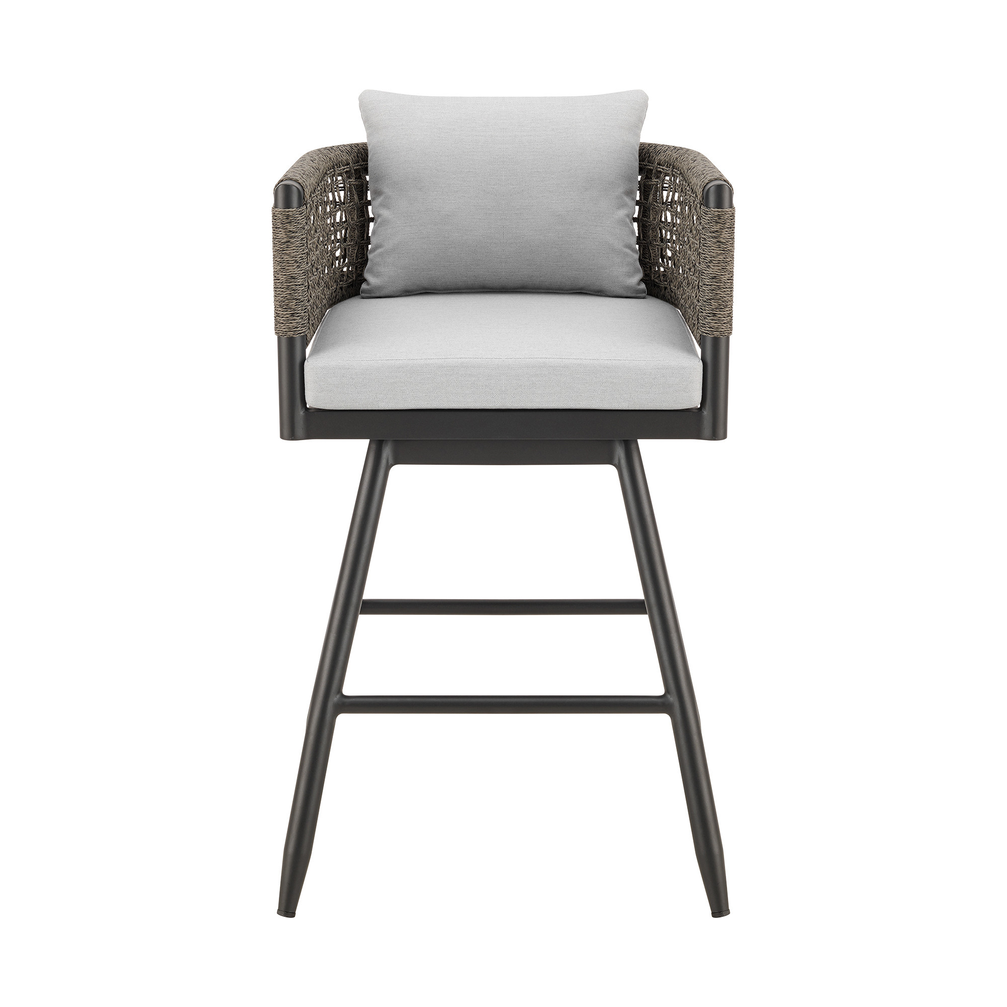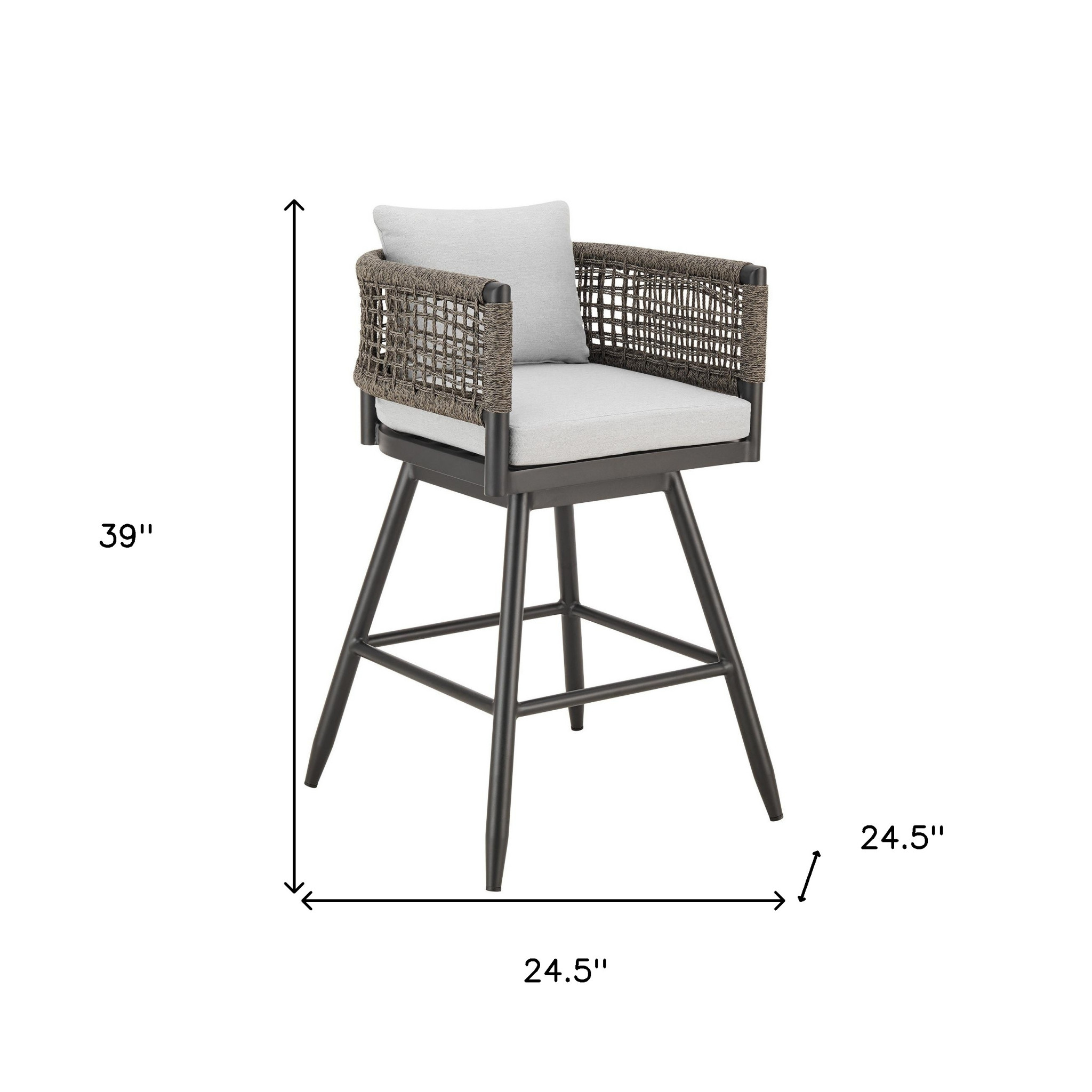 This 30-inch black and light gray aluminum swivel rope back outdoor bar height chair with footrest will be the perfect way to add some cool design and utility to your space similar to what you find in your favorite outdoor cafes or bars. Includes detachable cushions that provide you with the option to bring them indoors during unfavorable weather conditions, keeping them protected and ensuring their longevity. The bucket shape of the seat combines with a low back to give this chair a comfortable and fashionable look. Designed with armrests for your comfort, this chair also features a footrest for balance and convenience. For outdoor gatherings on the deck, yard, patio or poolside, this bar stool is a comfy and trendy option. 39-inch h x 24.5-inch w x 24.5-inch d.