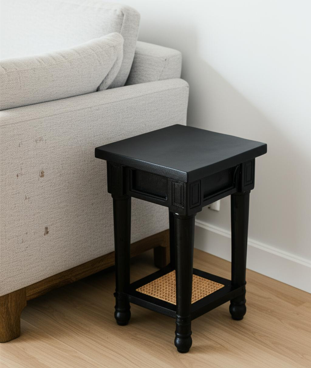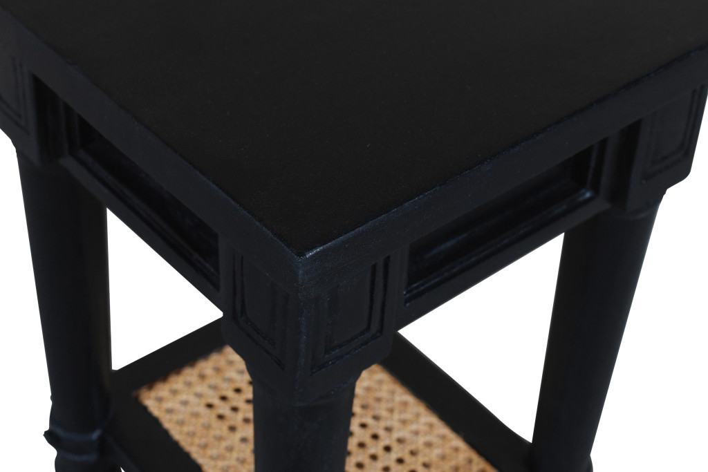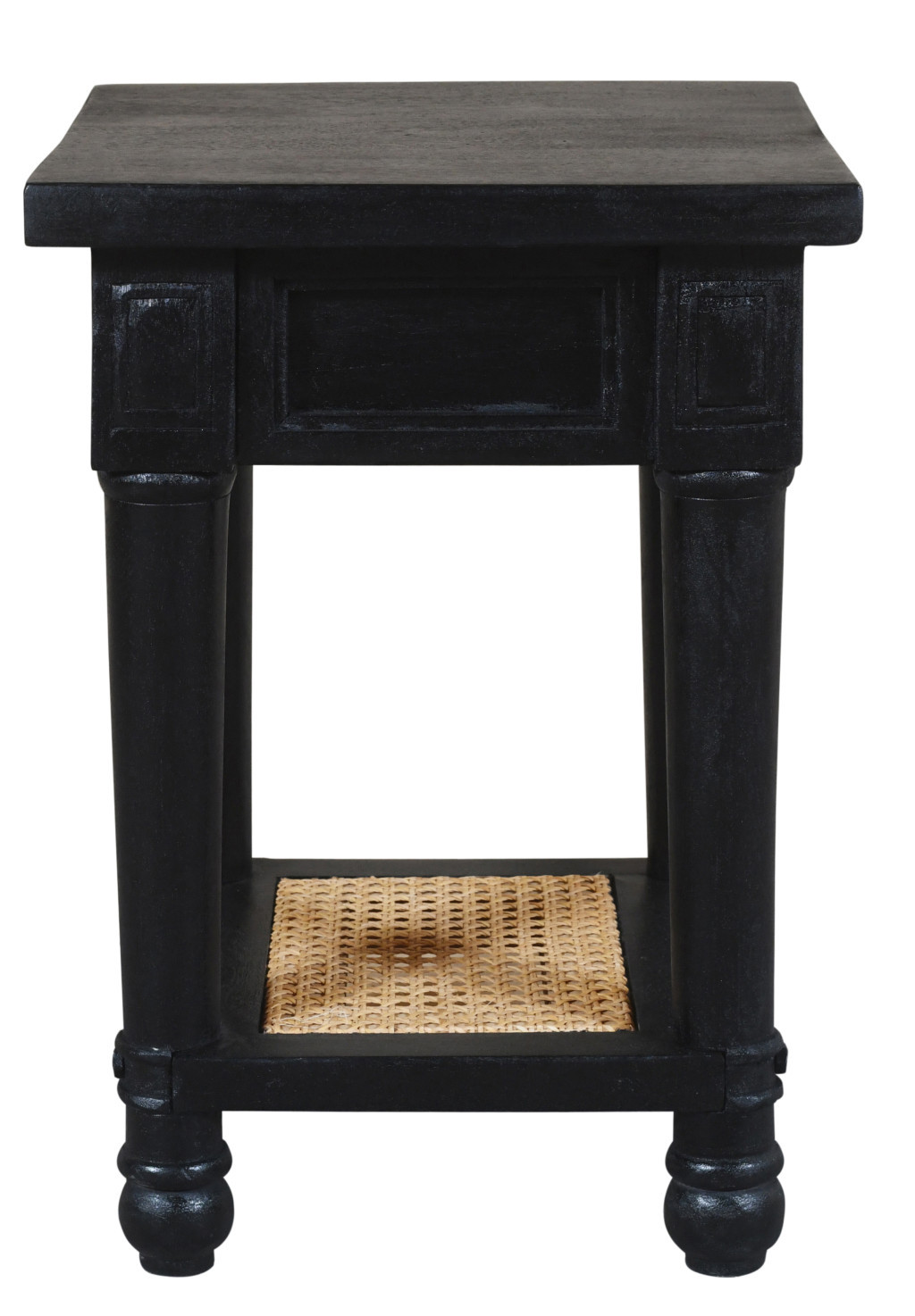 Distinctive in style the 20-inch black and natural solid wood and cane square end table with shelf radiates a versatile charm. This table features quality construction from solid wood and an updated monotone color scheme with black as the main color on both the top and the base. Help to keep your space organized with the included single shelf. An ideal location for placing your snacks and drinks, and a place to keep your lamp, frames, or other accessories. You can also use it as an entryway table to hold your keys. 20-inch h x 14-inch w x 14-inch d.