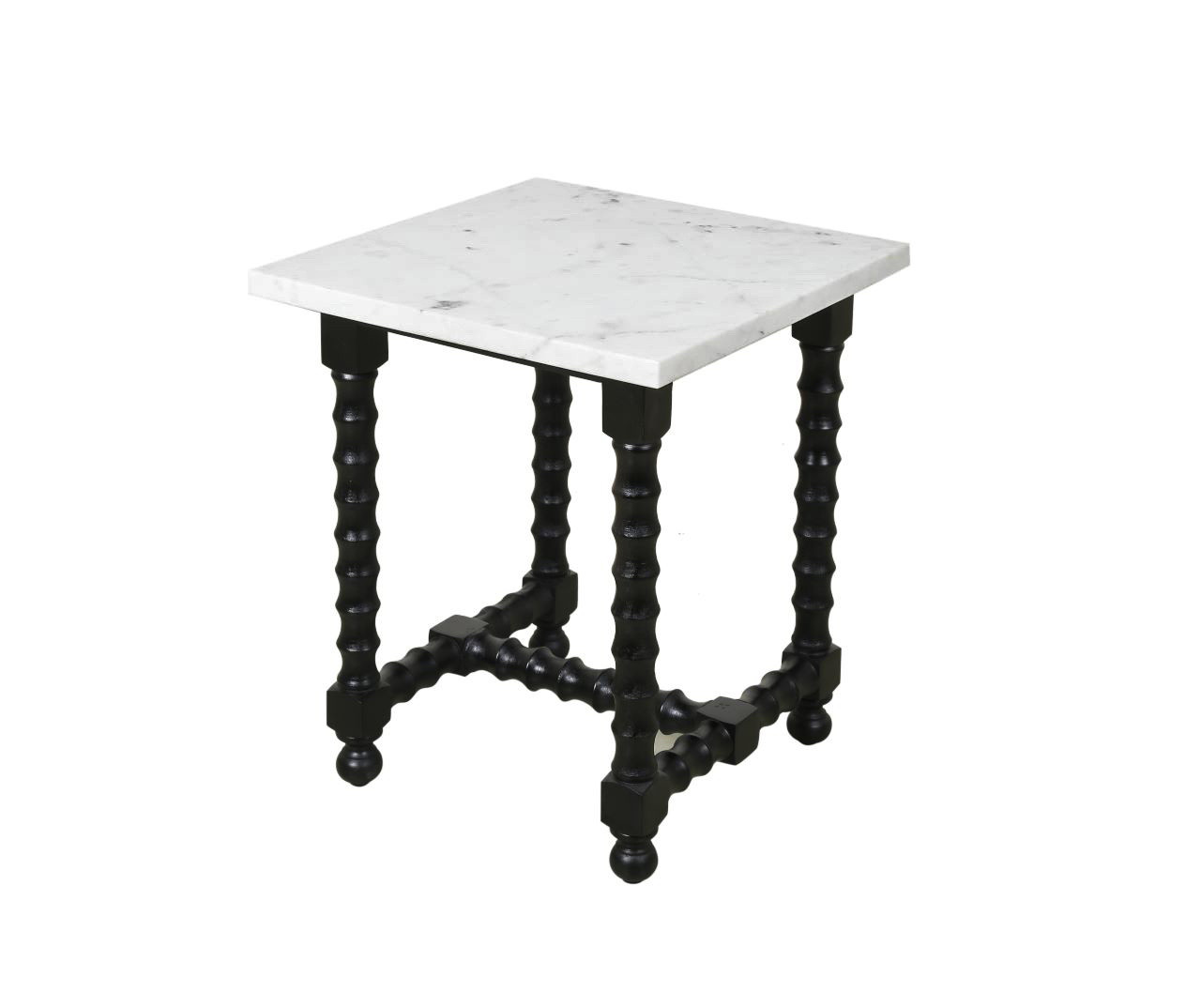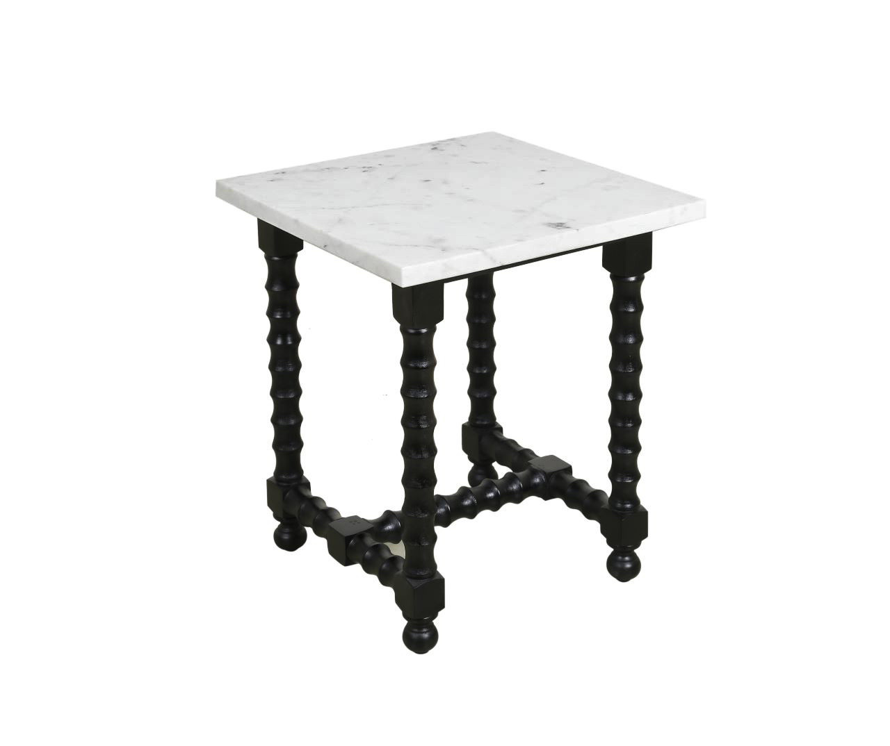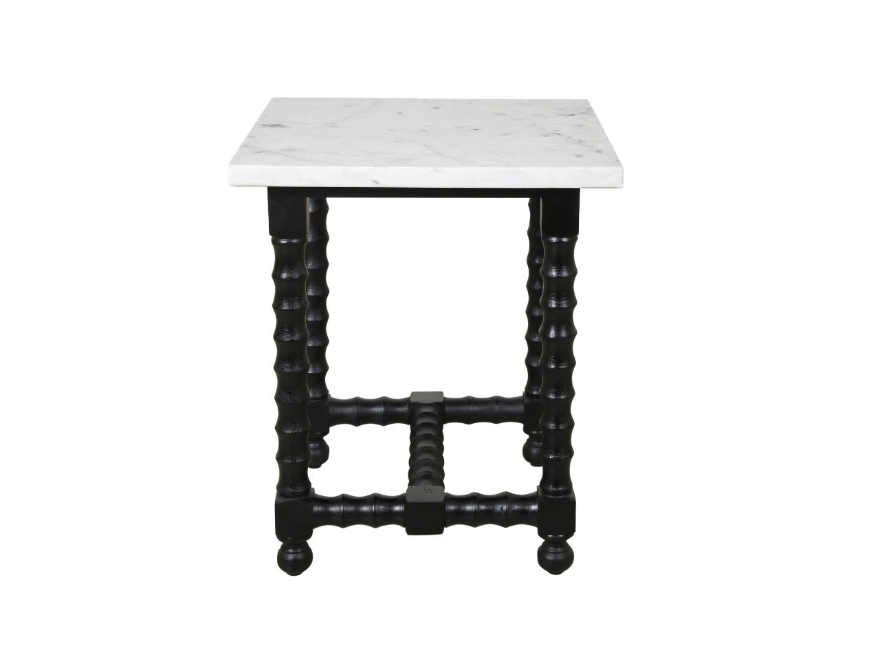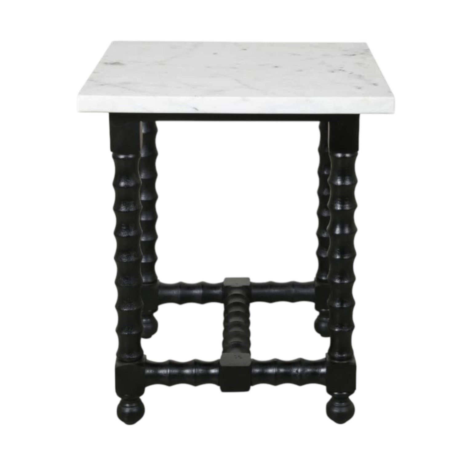Optimize your space and add some charm to your room with the 24-inch white and black marble and solid wood square trestle end table. The white marble top of this table is a nice contrast to the high quality, black solid mango wood of the base. Complete with a purposefully distressed finish, this table has an aged, vintage, and rustic feel. A great accent on either side of the sofa or bed, this adorable end or side table is just what you need. You can match it with other pieces to get the ideal look for your place. 24-inch h x 20-inch w x 20-inch d.