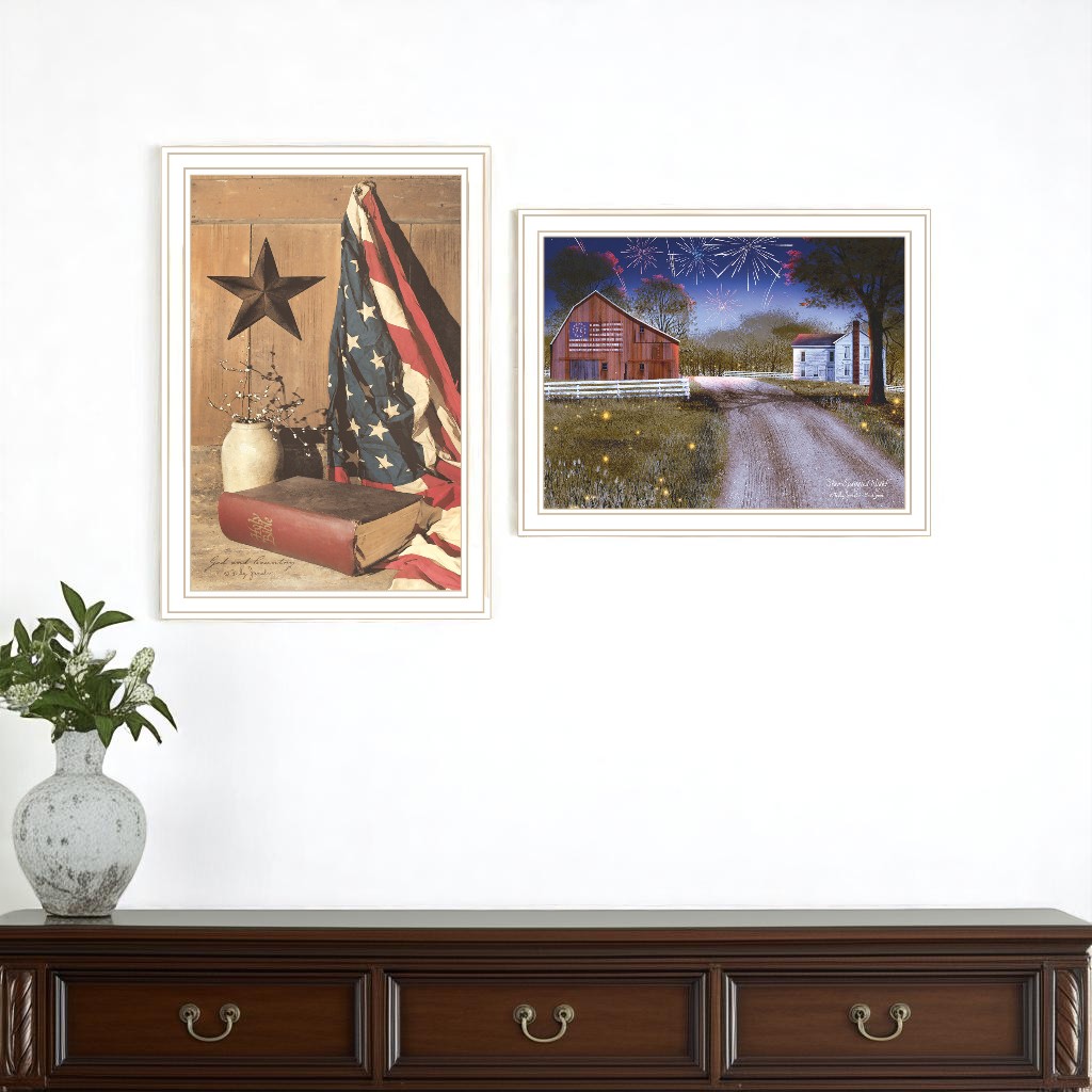 This set of two star spangled night god and country white framed wall art will add a beautiful decorative accent to your decor. This acrylic painting is a way to express your artistic style and add some fashion to your walls. Reproduced for you on paper, this hanging decorative accent will be a trendy and fashionable way to dress your walls. Hang on your wall to add some up to date fashion and decoration. Utilize this opportunity to create a focal point in the room with this fabulous wall decor option. 14-inch h x 14-inch w x 1-inch d.