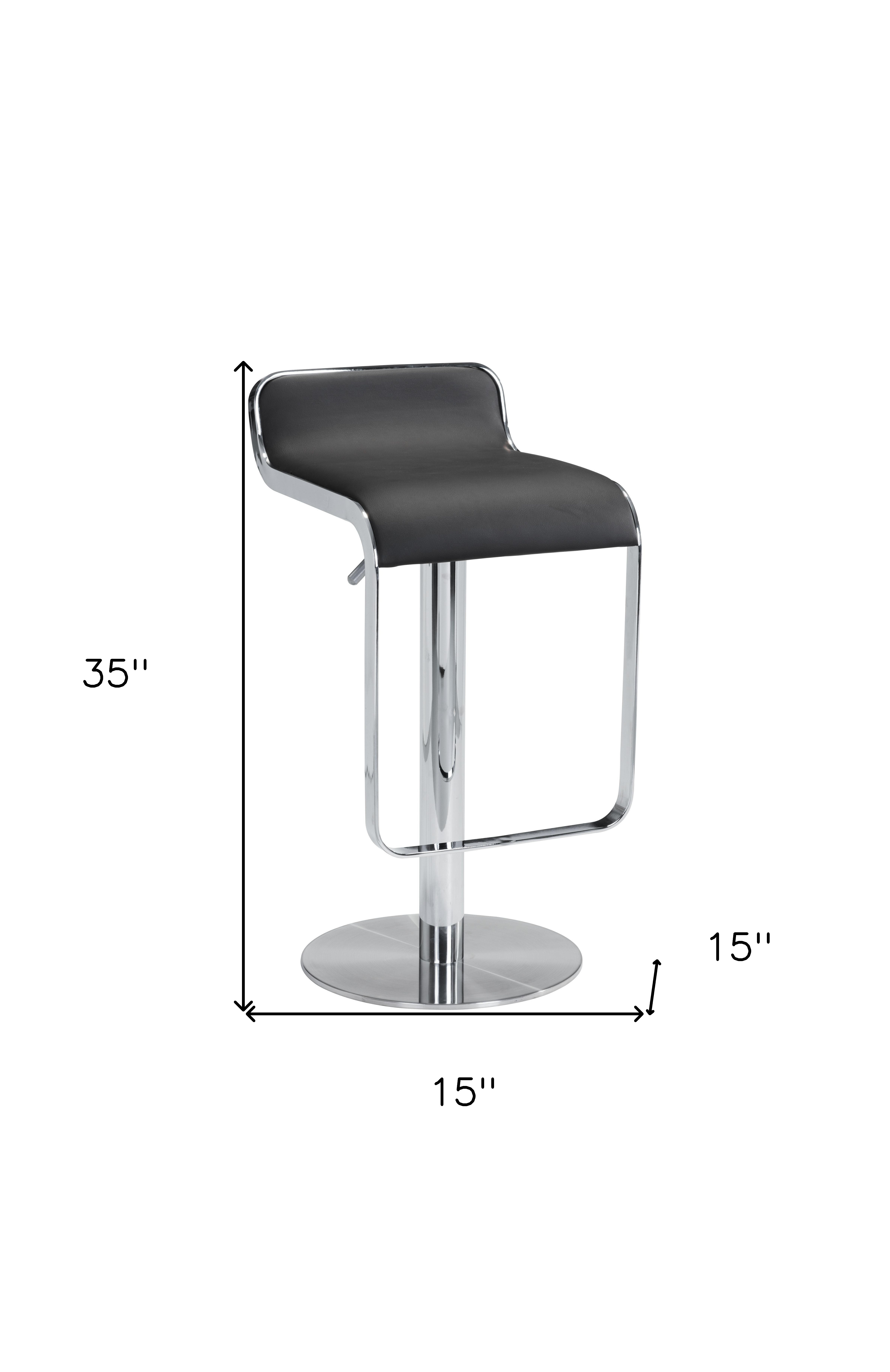 Comfort and design come together nicely in this black and silver faux leather and steel adjustable height swivel bar chair. The black upholstered seat of this stool is a nice contrast to the high quality, silver steel of the base. A full back mixed with a bucket shaped seat design makes this chair both comfortable and fashionable. 35.00-inch h x 15.00-inch w x 15.00-inch d.
