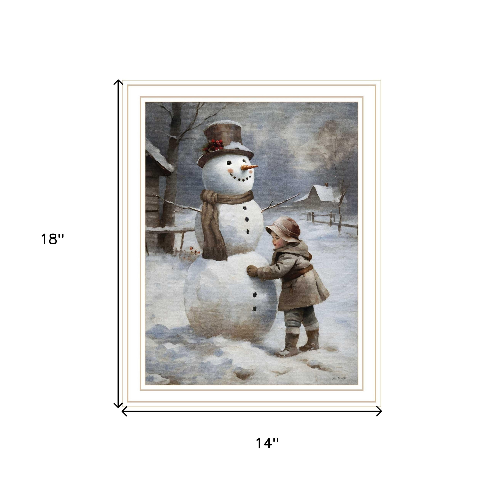 Set a festive christmas mood with this boy building a snowman white framed wall art. This acrylic painting is a way to express your artistic style and add some fashion to your walls. Reproduced for you on paper, this hanging decorative accent will be a trendy and fashionable way to dress your walls. Hang on your wall to add some up to date fashion and decoration. Utilize this opportunity to create a focal point in the room with this fabulous wall decor option. 18-inch h x 14-inch w x 1-inch d.