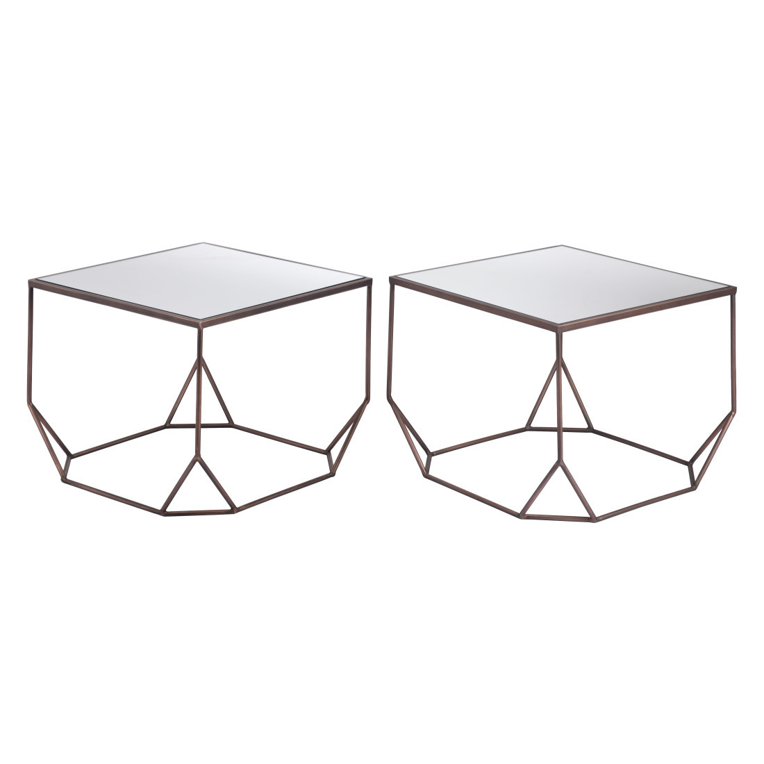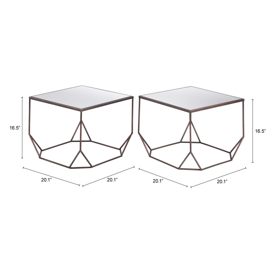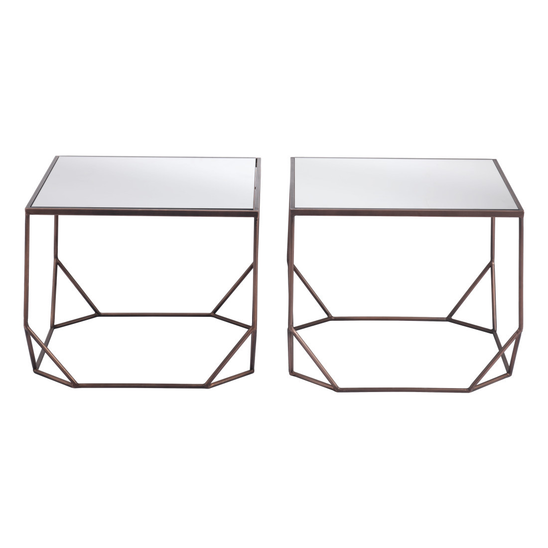 Increase your decorating options with this set of two silver and bronze mirrored glass and steel square abstract bunching coffee tables that will enhance your space. This pair can be pushed together to make a single table or used separately as you choose. A bronze steel open geometric frame is finished off with a mirrored glass top that is the epitome of quality construction and design. Reflective pieces of mirrored glass give this table a glamorous and unique look. This square table utilizes its unique shape to give your room a modern geometric accent. If you're looking for something that can fit into a living area, bedroom, or office, this coffee table is for you. 16.5-inch h x 21-inch w x 21-inch d.