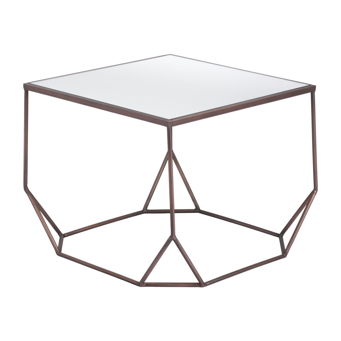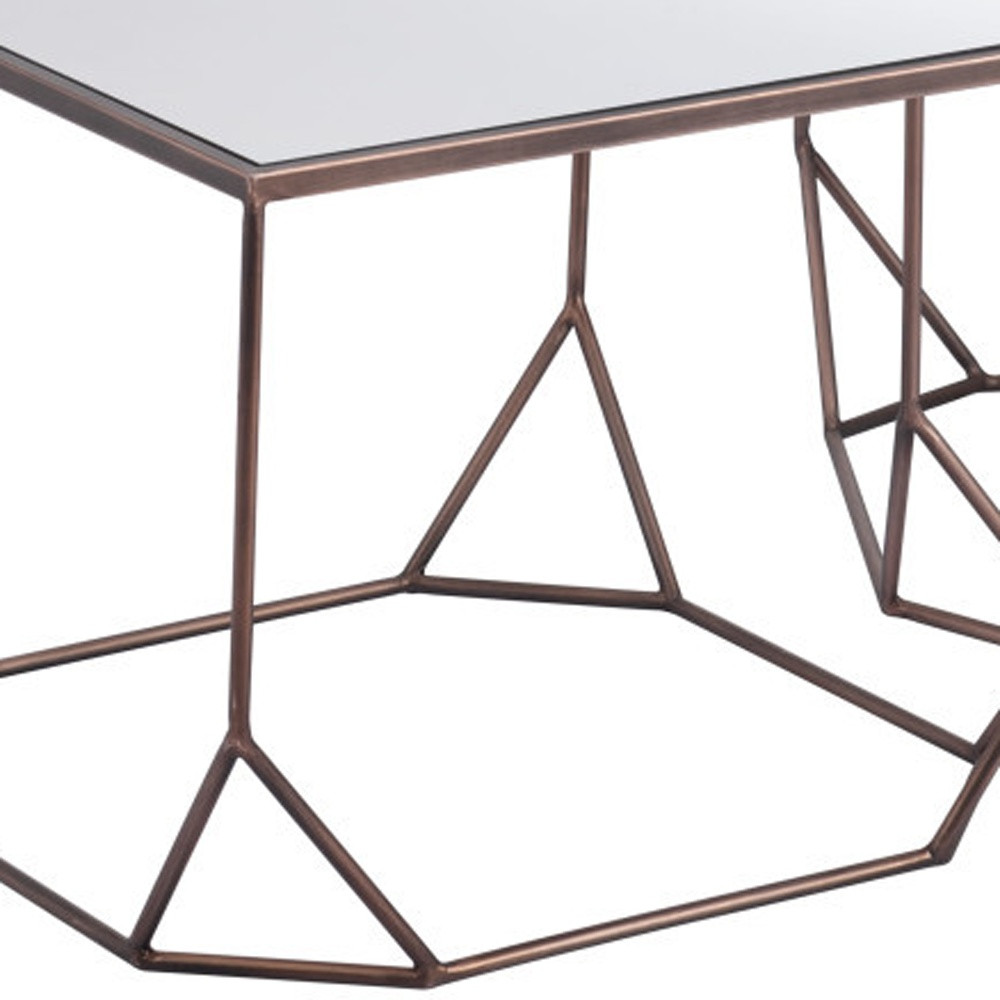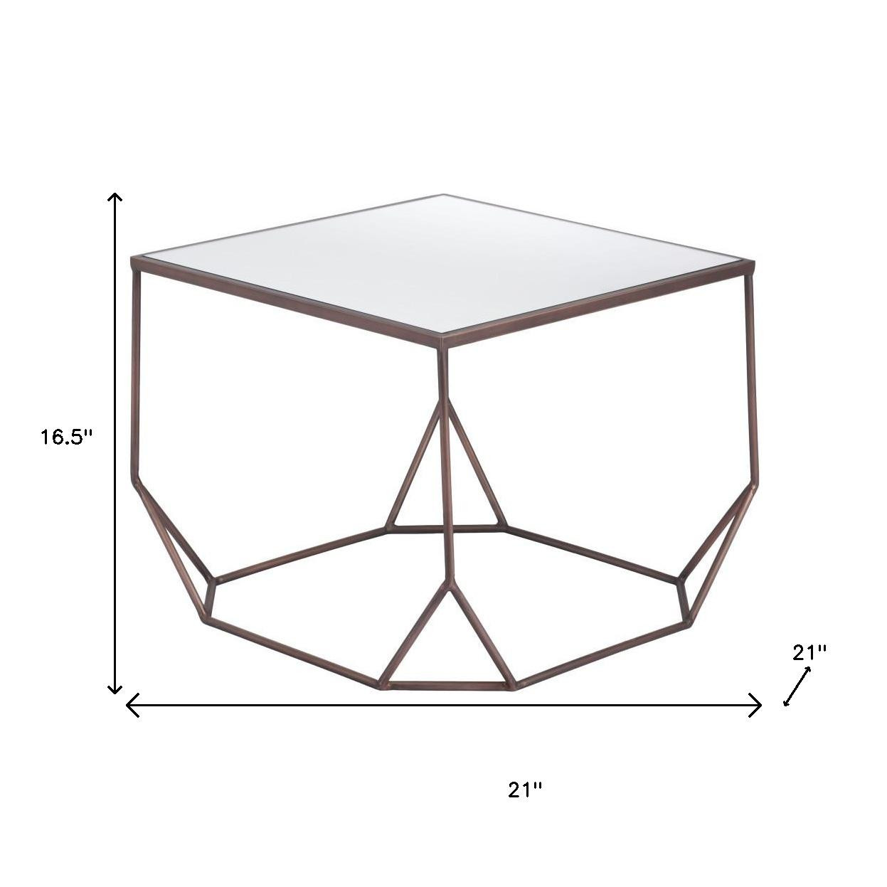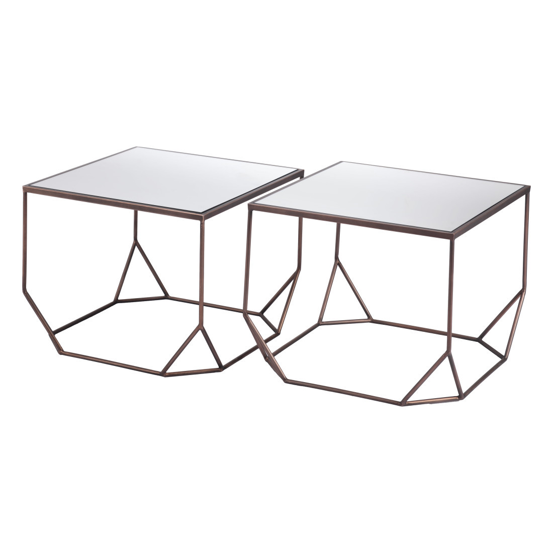 Increase your decorating options with this set of two silver and bronze mirrored glass and steel square abstract bunching coffee tables that will enhance your space. This pair can be pushed together to make a single table or used separately as you choose. A bronze steel open geometric frame is finished off with a mirrored glass top that is the epitome of quality construction and design. Reflective pieces of mirrored glass give this table a glamorous and unique look. This square table utilizes its unique shape to give your room a modern geometric accent. If you're looking for something that can fit into a living area, bedroom, or office, this coffee table is for you. 16.5-inch h x 21-inch w x 21-inch d.