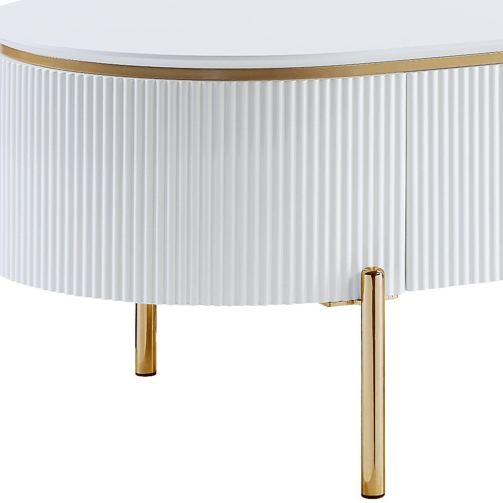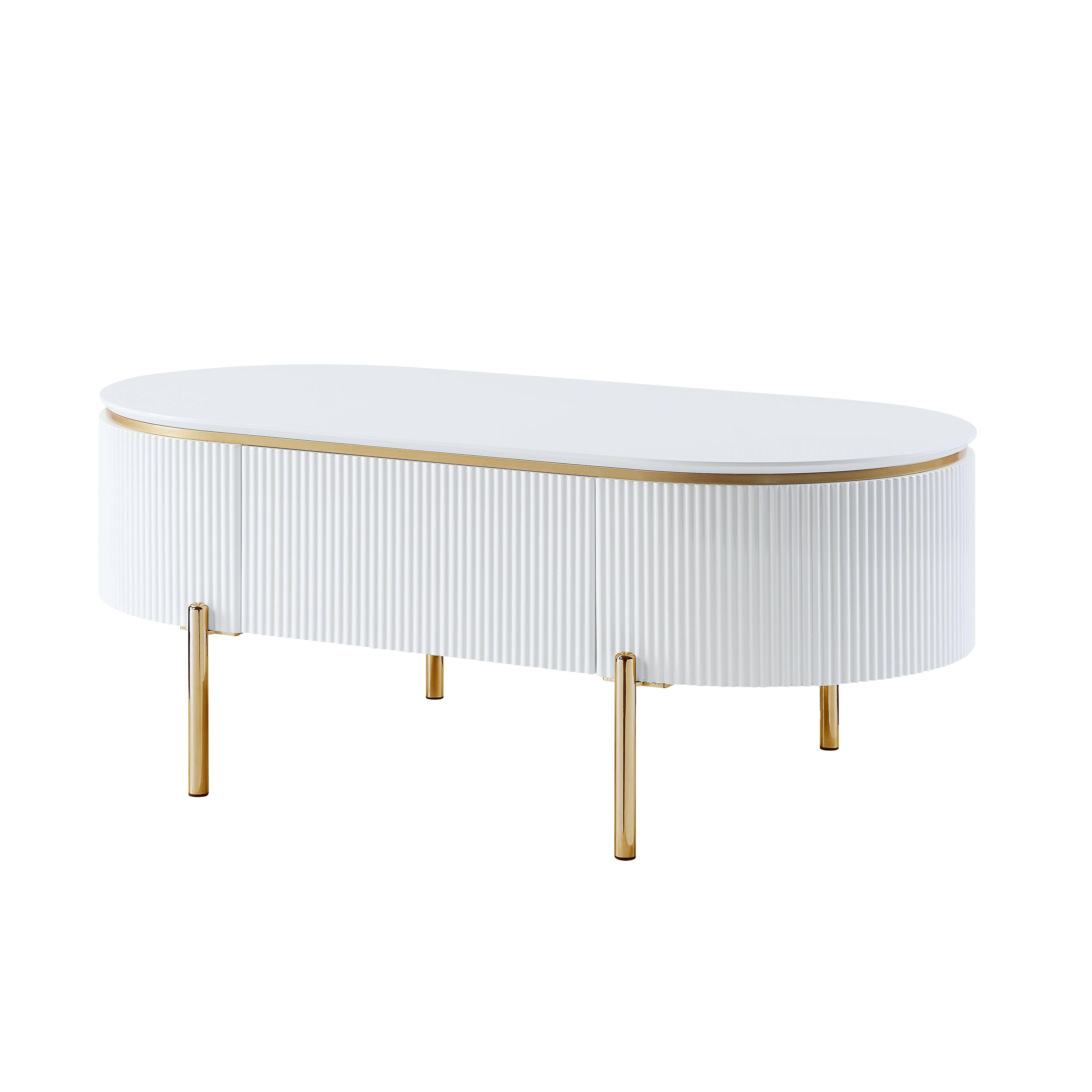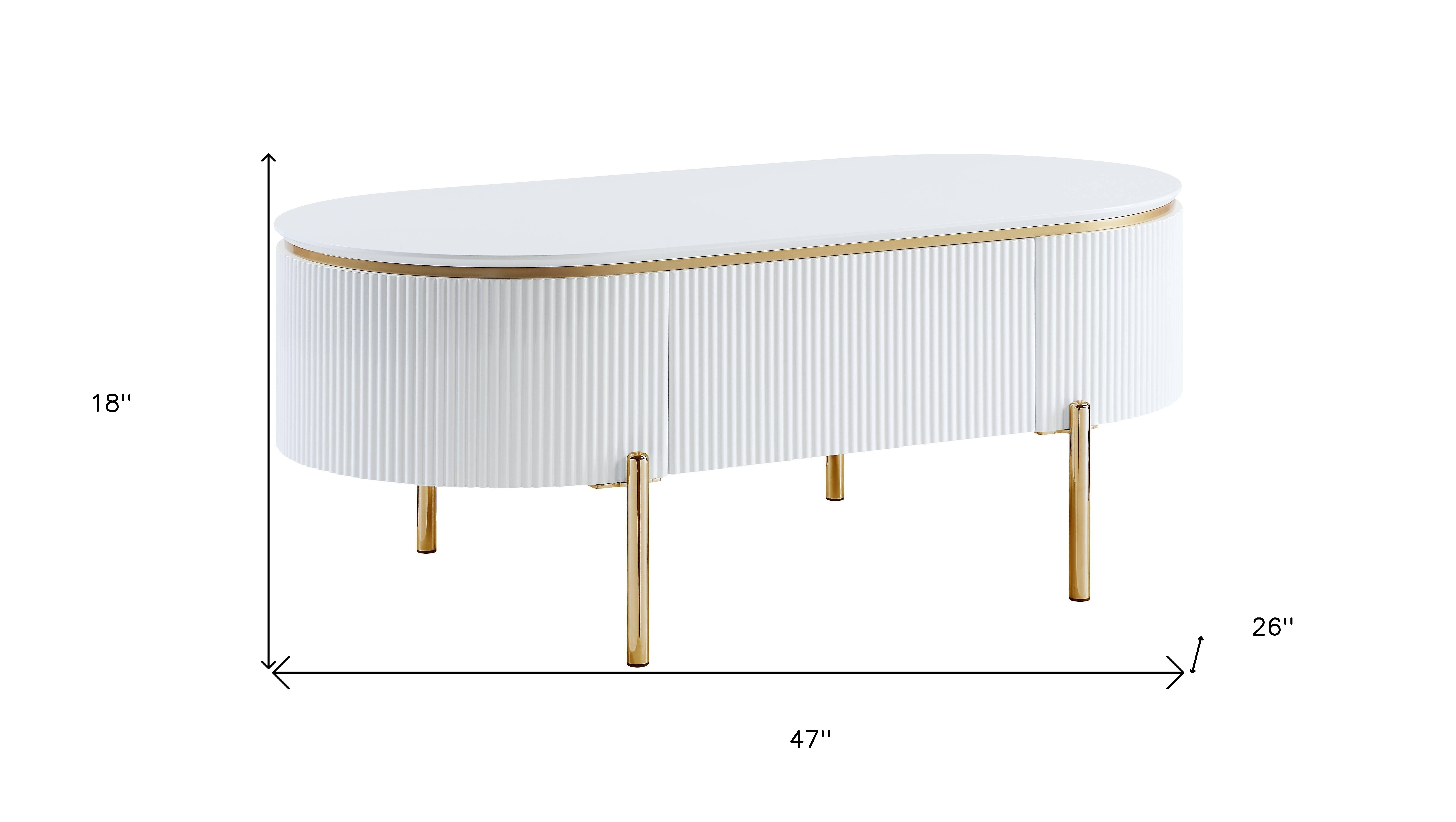 Make a statement with the 47-inch white and gold wood oval coffee table with drawer and infuse a dash of character and personality into your space. The top of this manufactured wood table is white, while the base is a nice compliment in gold and white. This oval table is an updated take on a classic. It has an attractive design that will definitely breathe some fresh air into your interior. 18-inch h x 47-inch w x 26-inch d.