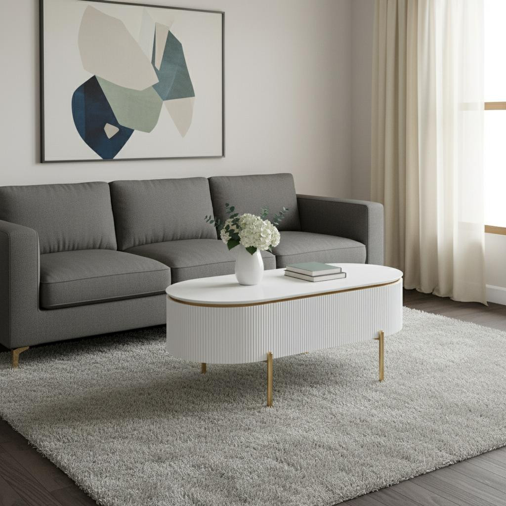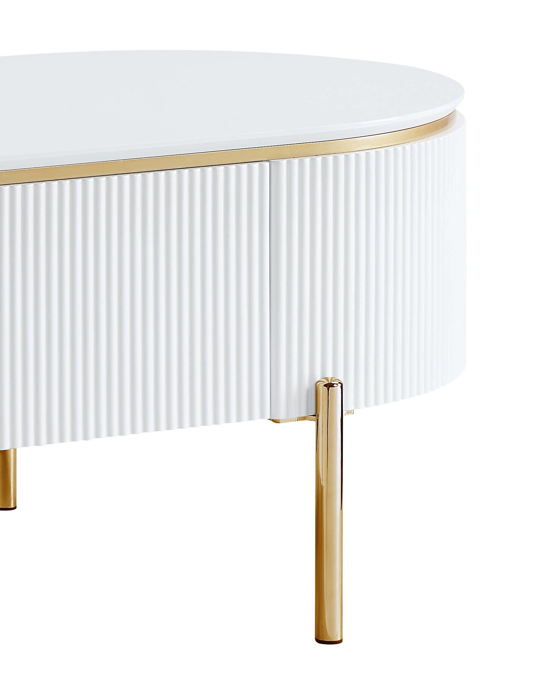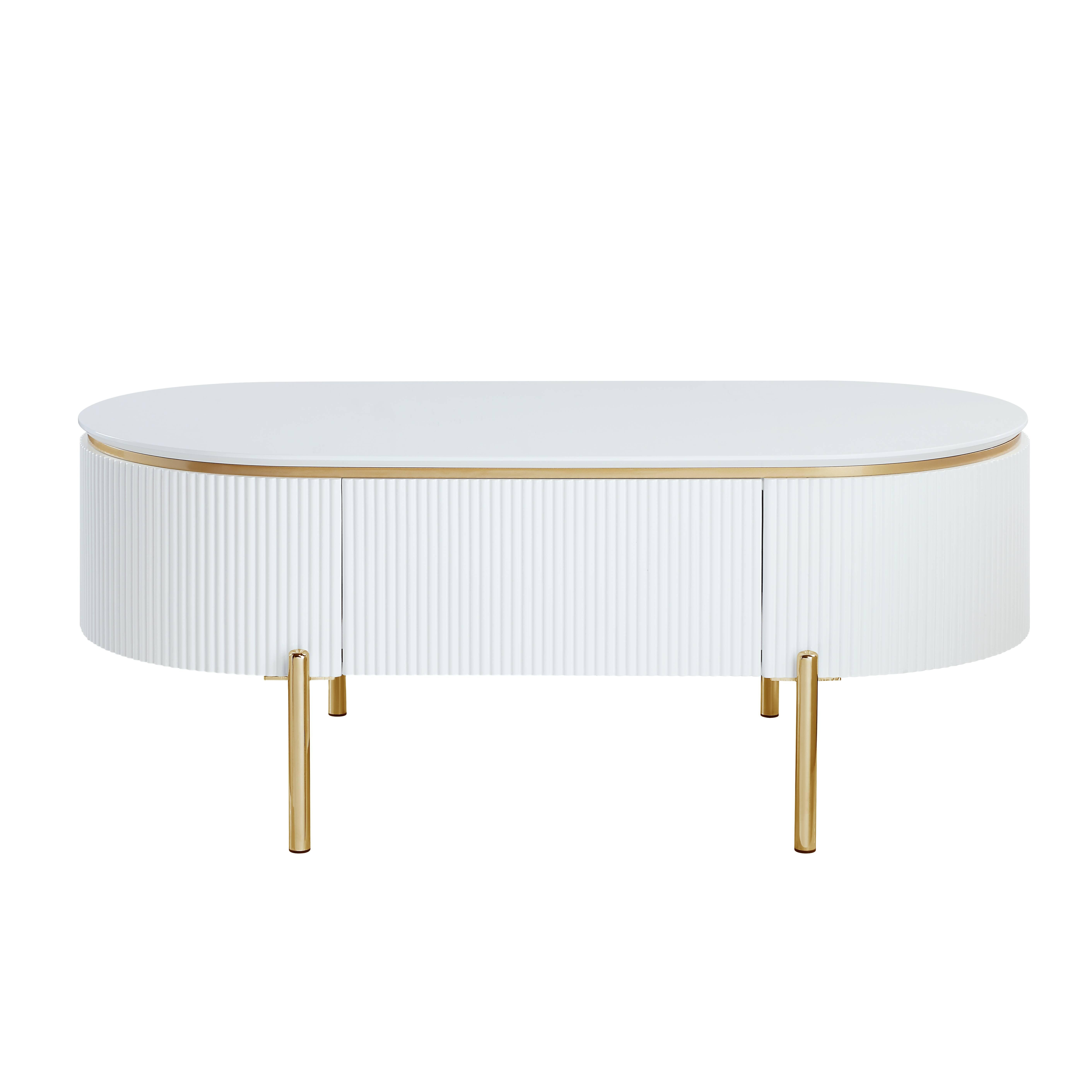Make a statement with the 47-inch white and gold wood oval coffee table with drawer and infuse a dash of character and personality into your space. The top of this manufactured wood table is white, while the base is a nice compliment in gold and white. This oval table is an updated take on a classic. It has an attractive design that will definitely breathe some fresh air into your interior. 18-inch h x 47-inch w x 26-inch d.