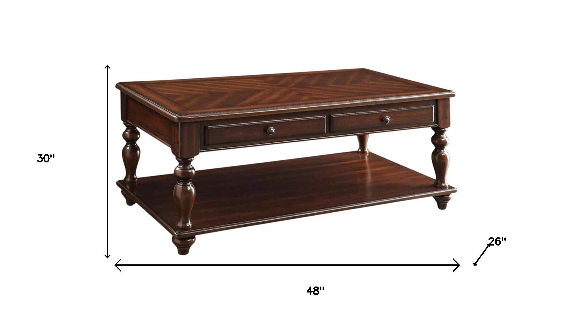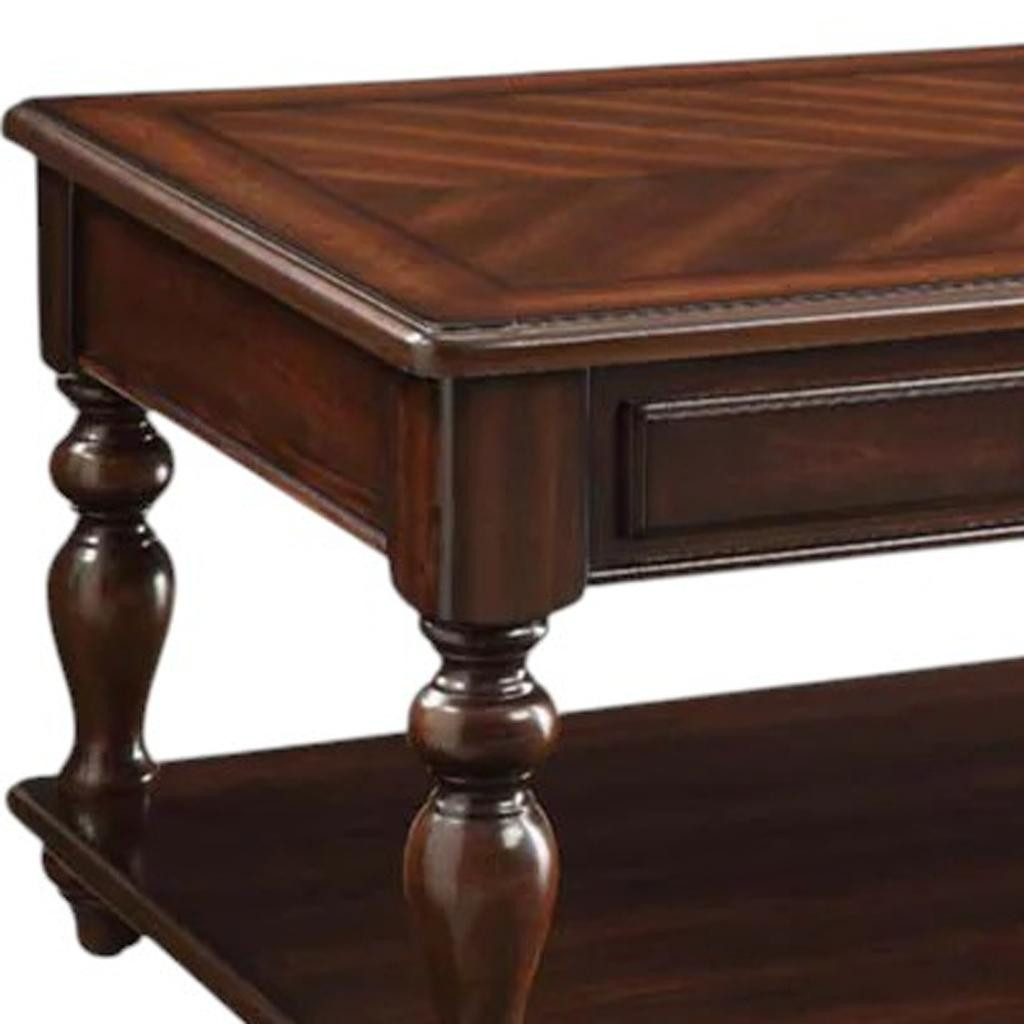 This stylish 48-inch brown wood lift top coffee table with shelf is not only practical, but good looking and built to last. Made of solid and manufactured wood, the brown coloration throughout gives this piece an updated and refreshing look. Includes a single shelf for handy storage or display space. This classic rectangular table will be a great accent in any room if you're looking for something that can fit into a living area, bedroom, or office, this coffee table is for you. 30-inch h x 48-inch w x 26-inch d.